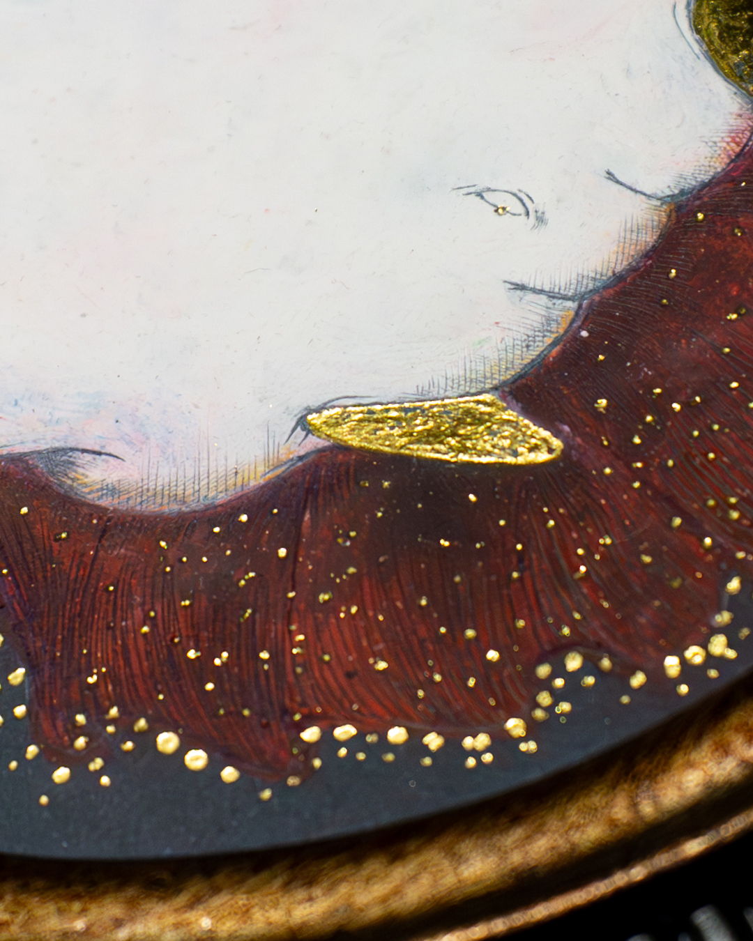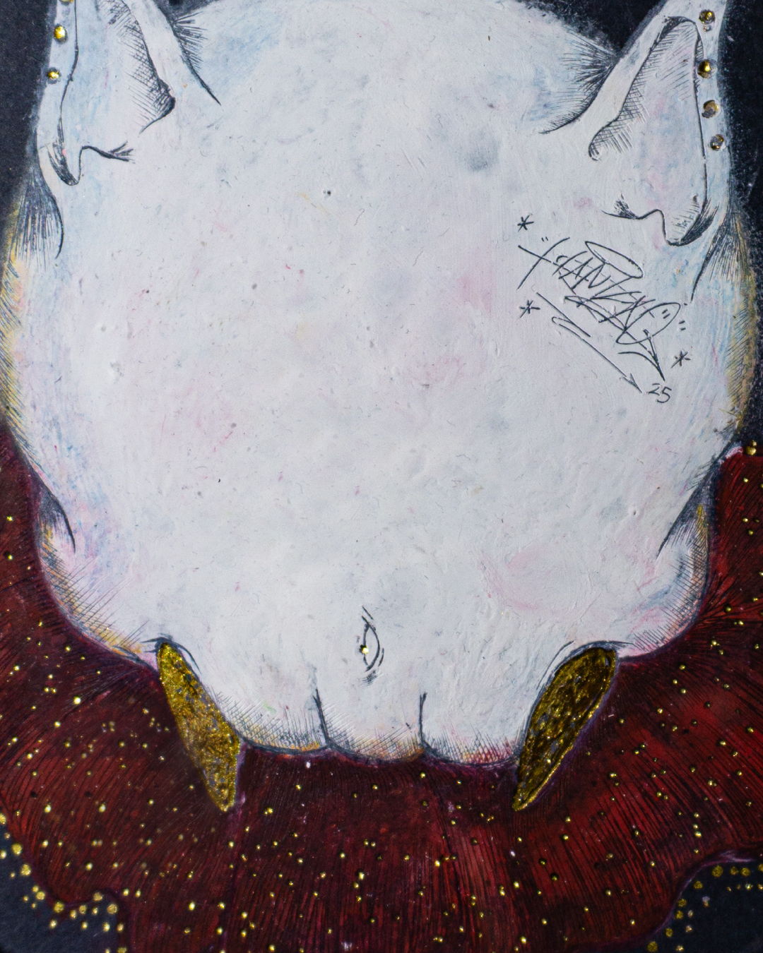 自身のキャラクターを黒の紙をベースにクレヨンを重ねて作った層の上をニードルでTattooを彫るように削り出すことで繊細なラインとペンでは表現できない立体感を出した作品です。PentelのArt Crayonならではの柔らかさを利用してグラデーションを作り、乾燥した後に生まれる独特の表面の柔らかさはまるで肌の上で彫っているかのように線のコントロールが出来るテクスチャーを生み出してくれました。そこにゴールドの箔押しを施し、アンティーク感のある絵画のような作品に落とし込みました。