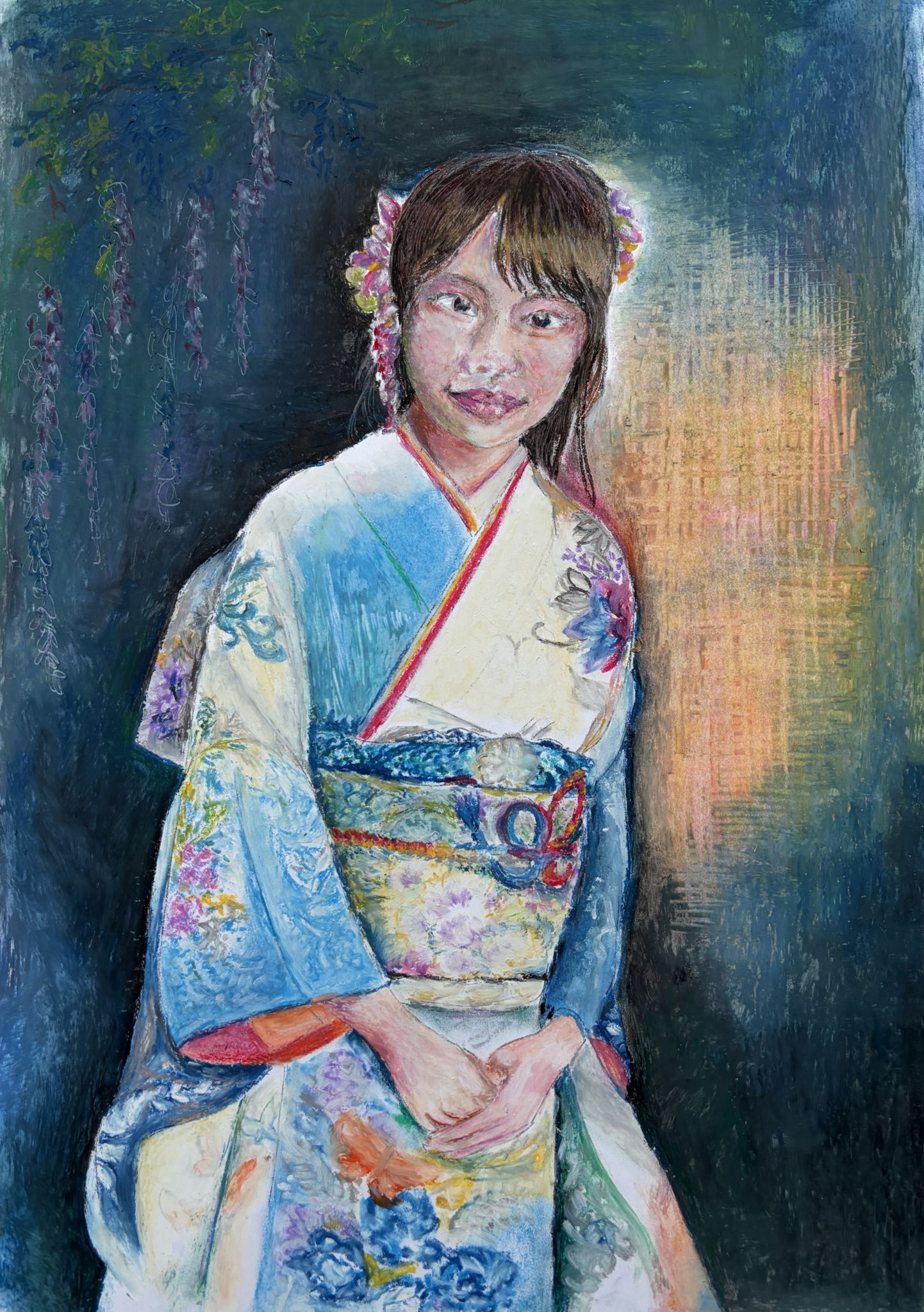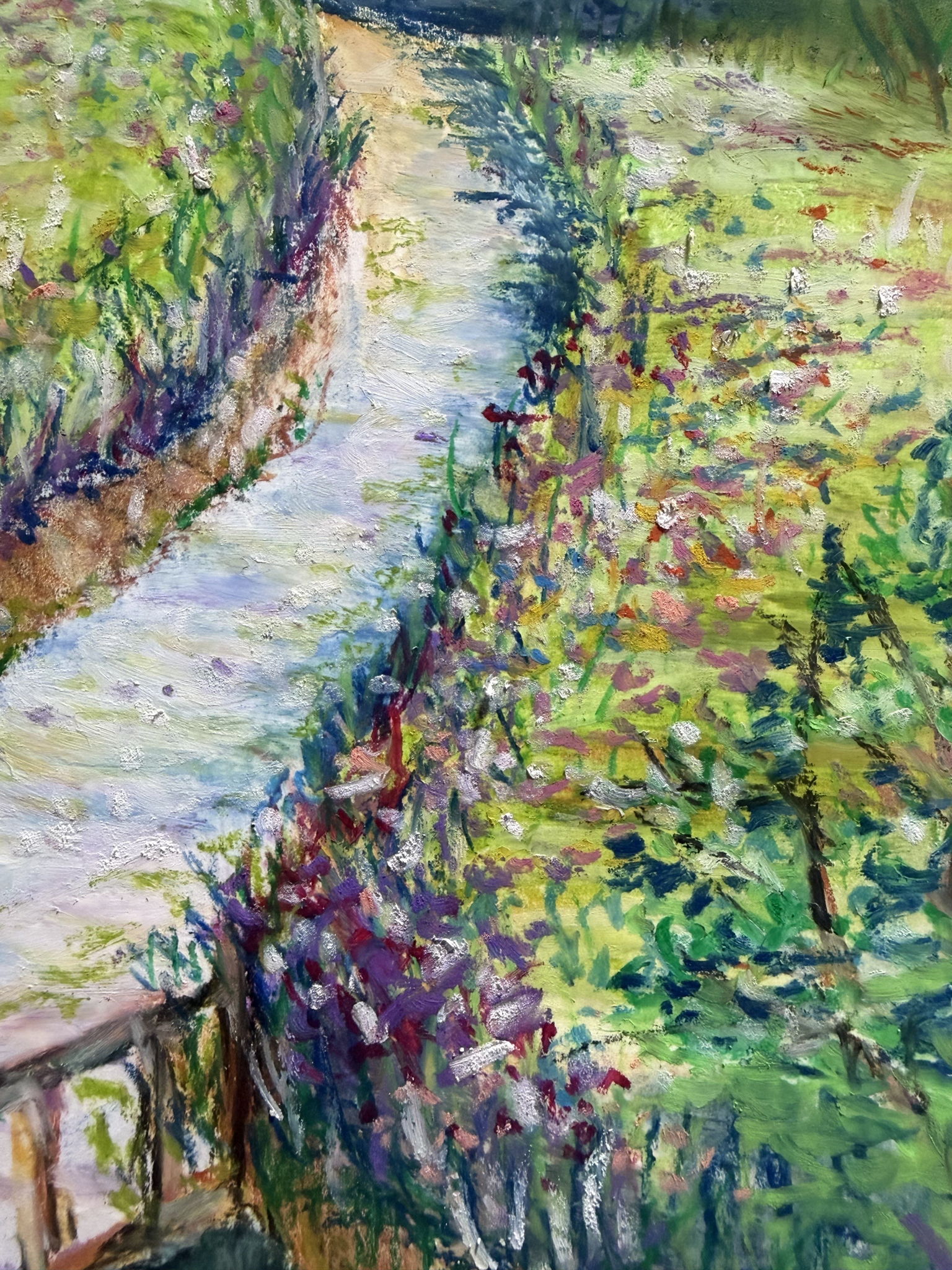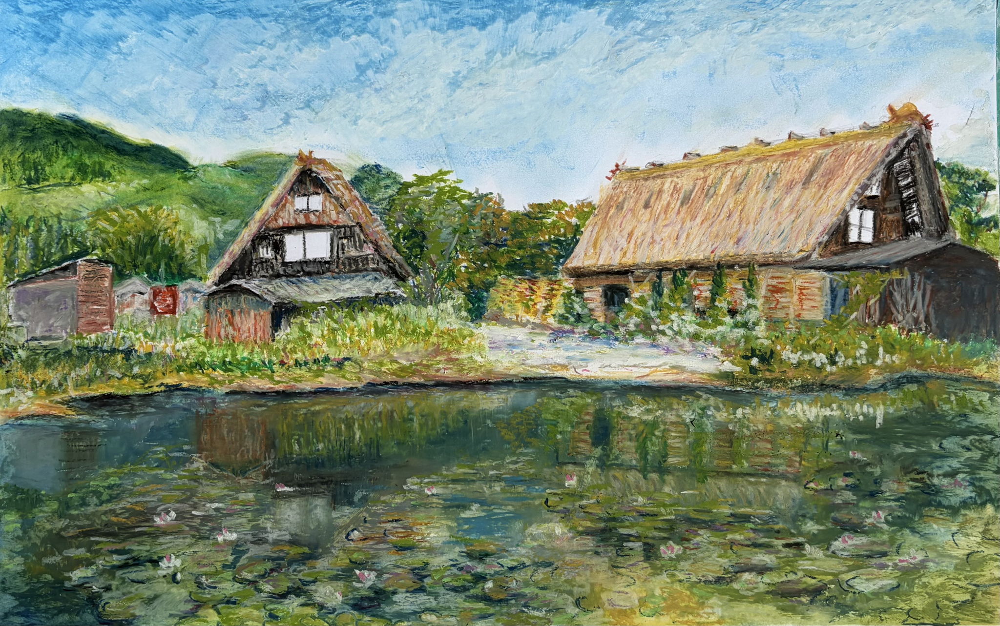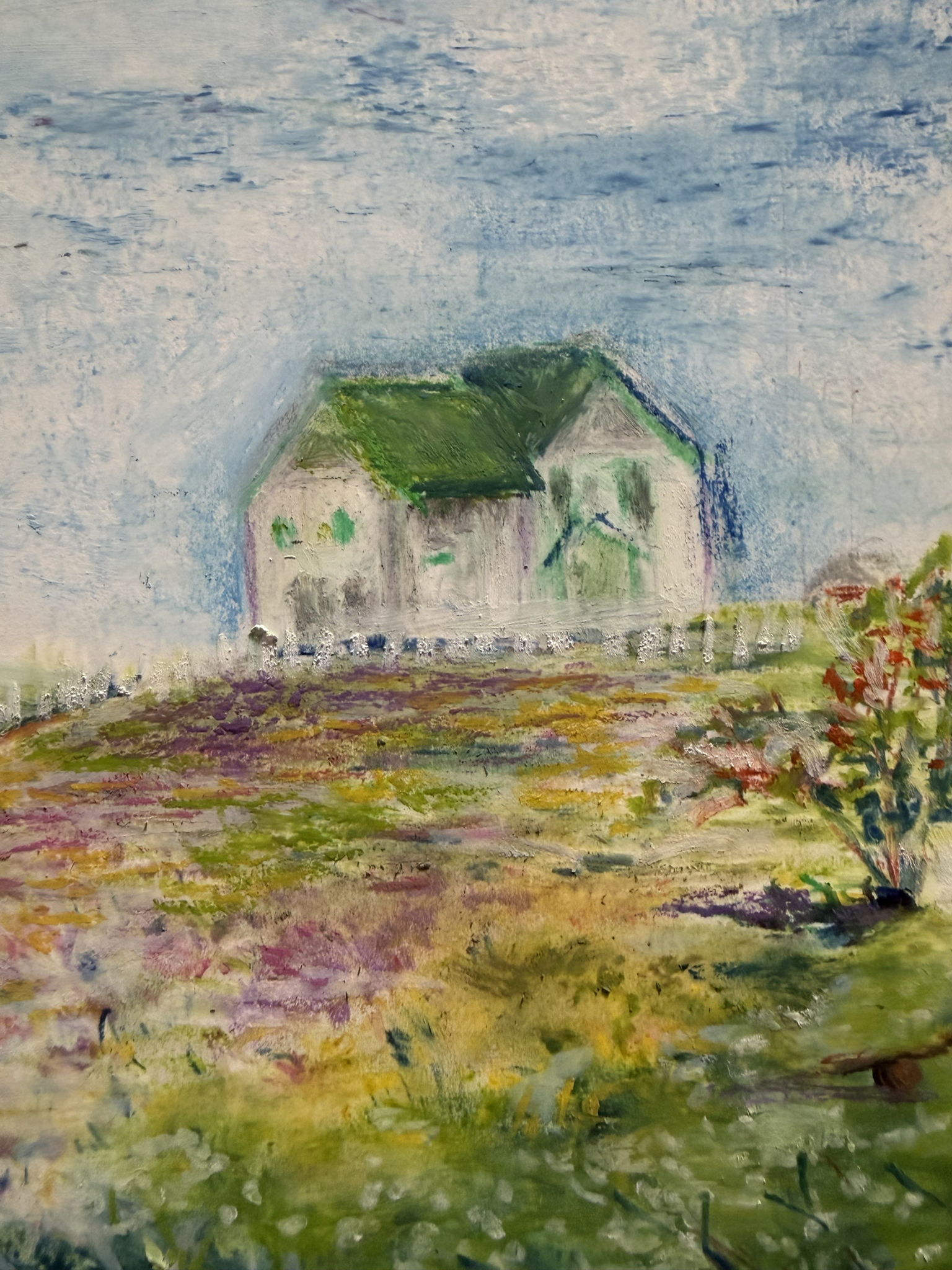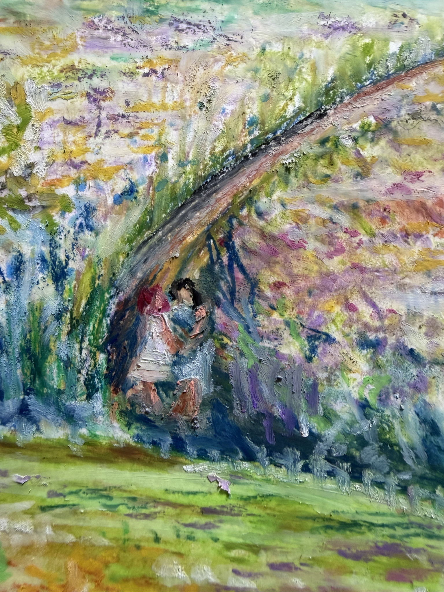 プリンスエドワード島のグリーンゲイブルズに2人の少女が歩いていく風景を描きました。物語に出てくる、小さな花々が咲く恋人の小道。そこを抜けると丘の上の緑の屋根が見えます。アンの家へおしゃべりをしながら歩いていく田園を楽しんでください。