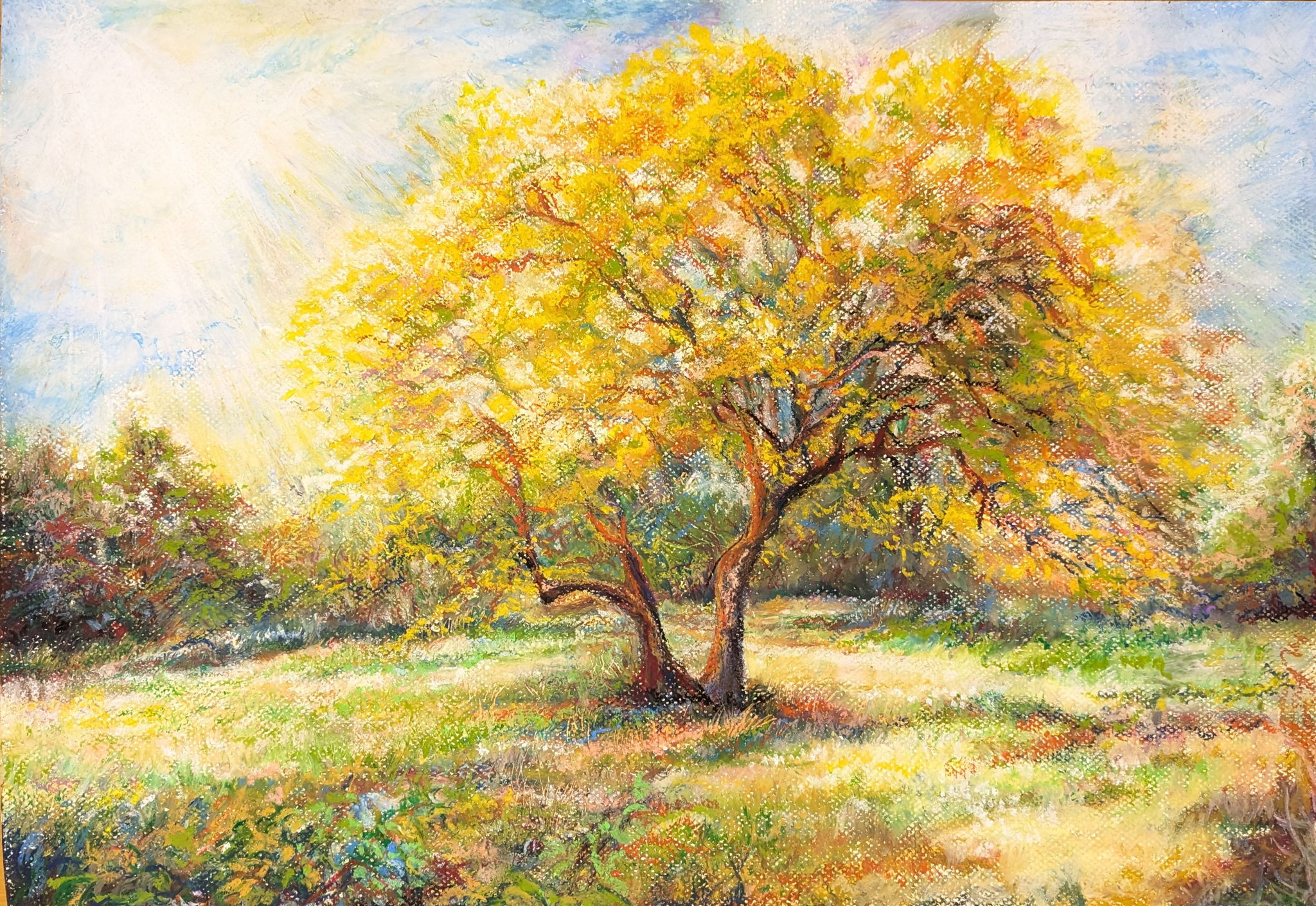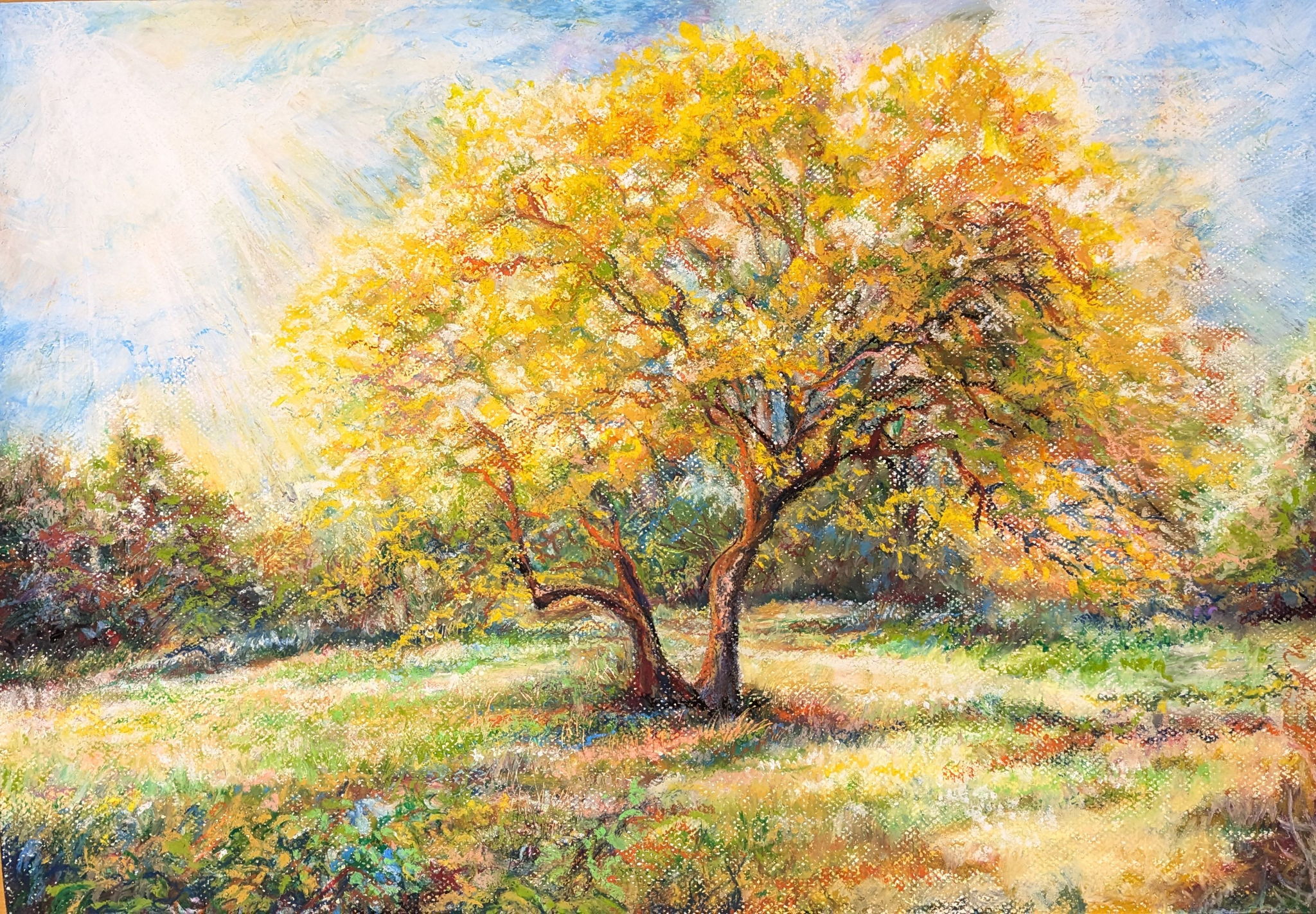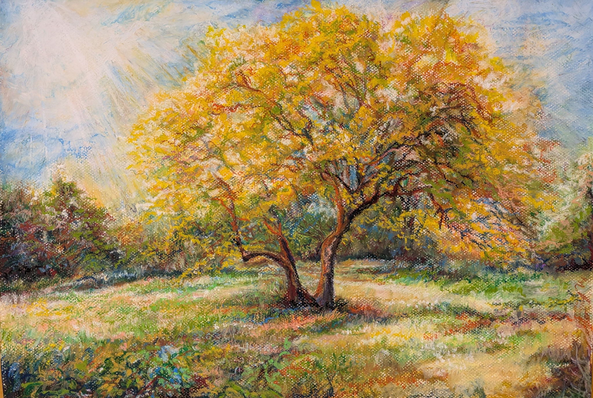 群馬県にある赤城自然園にて散策中、秋の始め黄金色に輝く大きな木がありました。その大きさと周りの景色も華やかにするような輝きに深く感動してその光景と思いを表現しました。