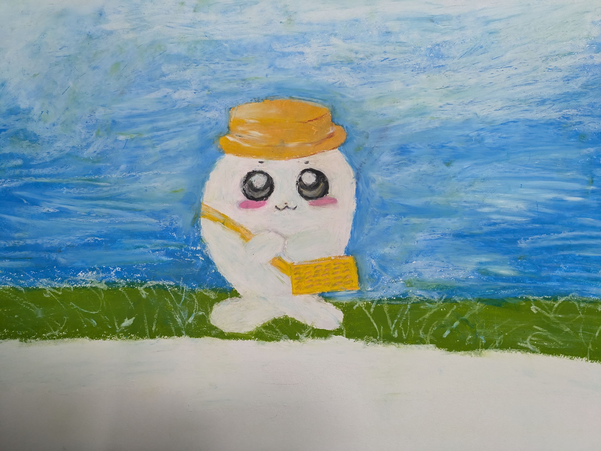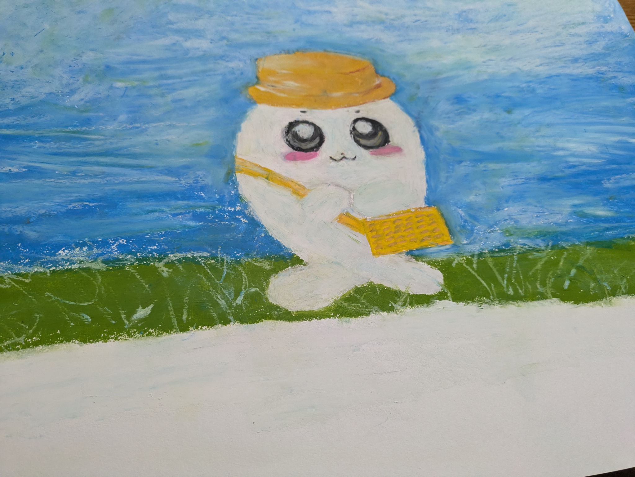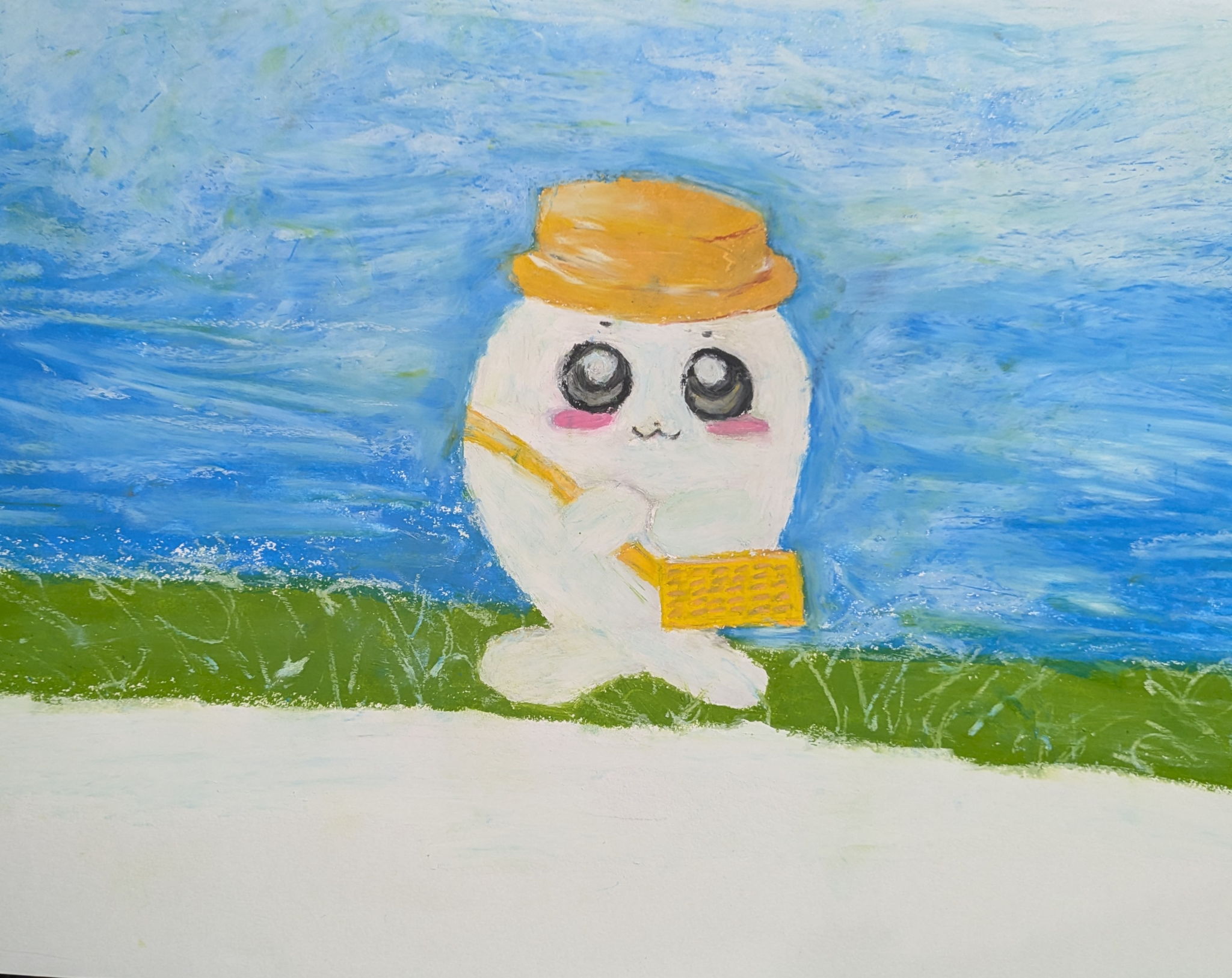あざらしのらしぃちゃんが夏休みの初日にすごくワクワクしながら出かけているところを書きました。らしぃちゃんのキラキラとした目や大事そうに首から掛けた虫かごの紐を握っているところ、麦わら帽子をかぶっているところなどから、この夏をとても楽しもうとしていることが伝わればいいなと思います。空の色を青っぽくすることでより夏らしさを引き出せるようにしました。