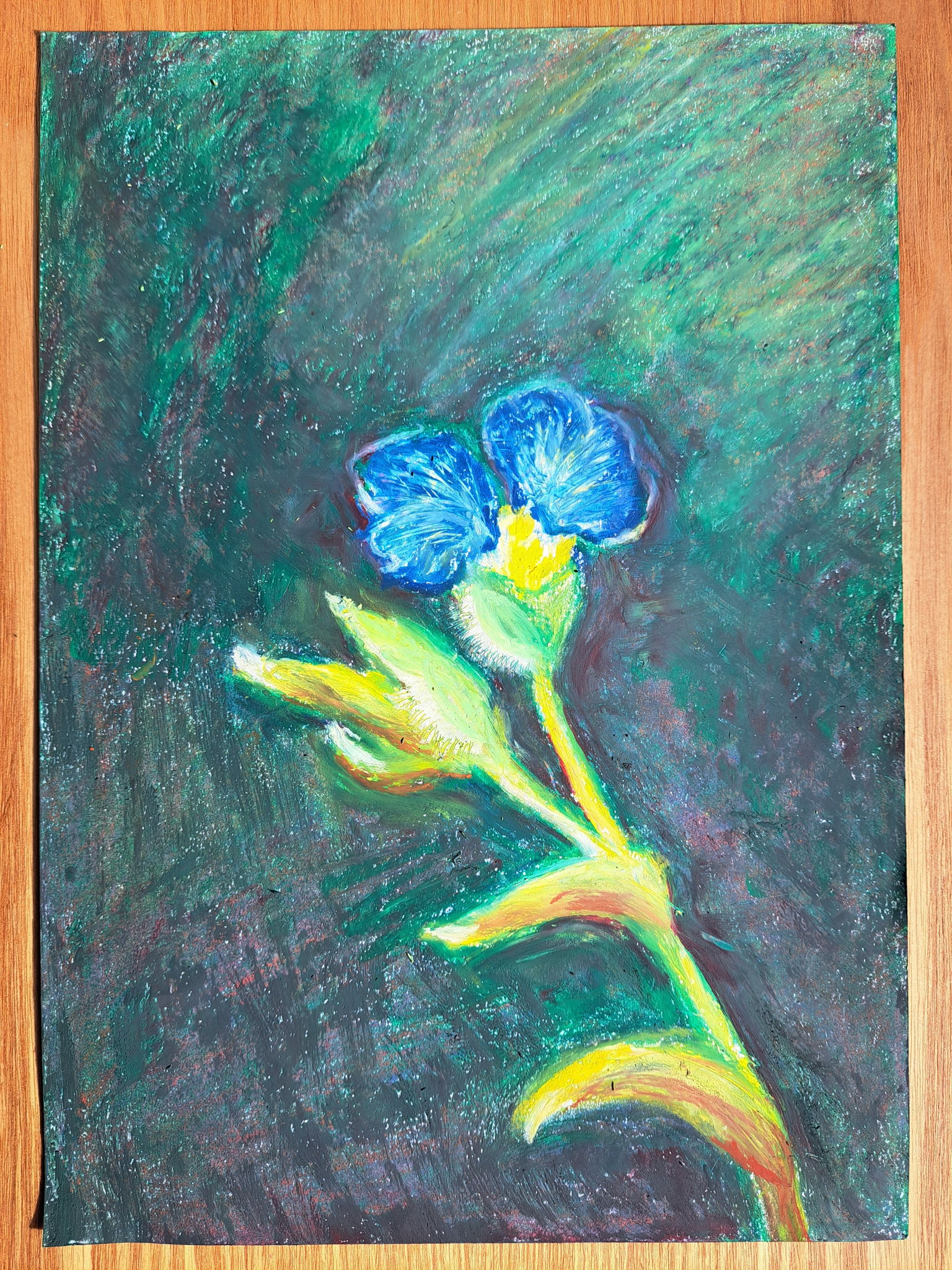 思わず止めた車から飛び降りて、七色の色彩が消えるまで眺めた感動を画用紙の上に込めました。