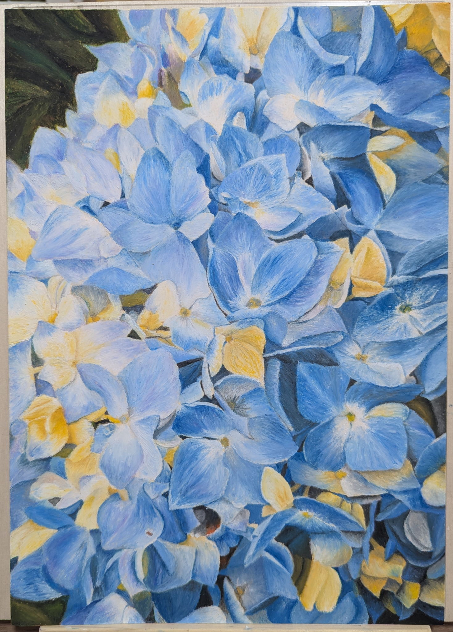 秋田県男鹿市の雲昌寺に咲いていた紫陽花です。アートクレヨンの発色や混合のしやすさを伝える為に、同系色の紫陽花を選択し、作品にしました。