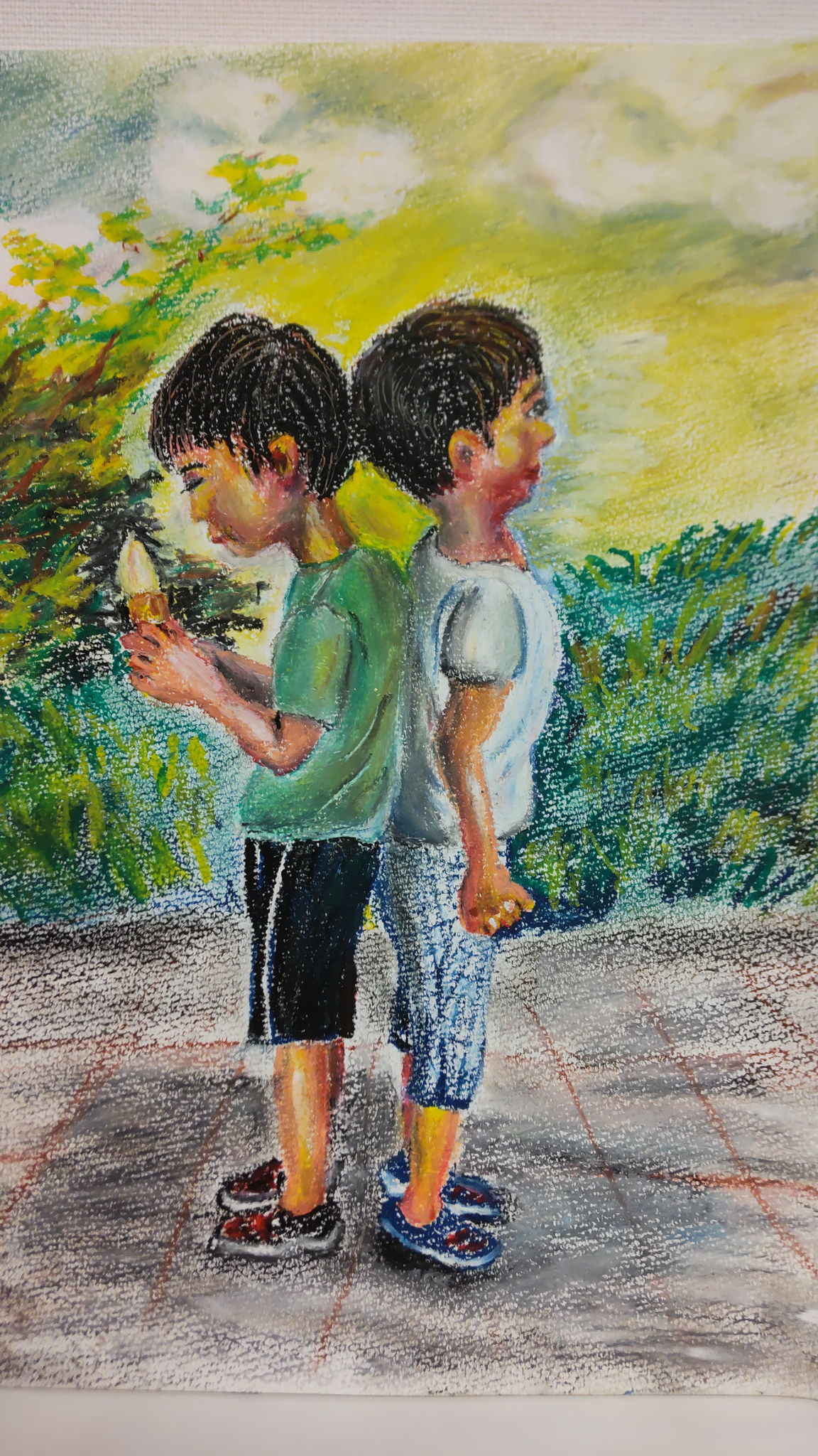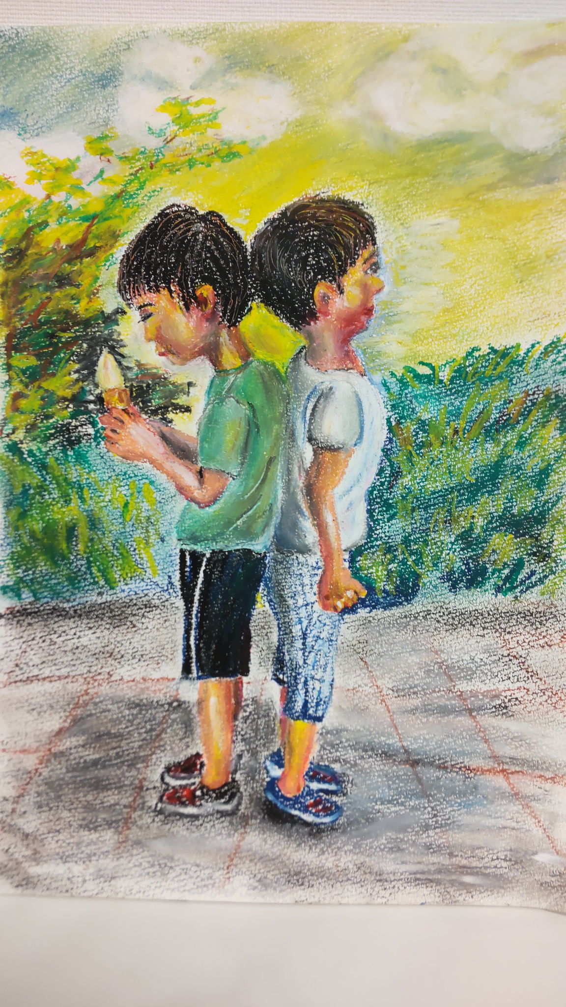 夏休み、久しぶりにあった従兄弟と背比べ!一歳年上の子がちょっと低いけど、ちょっと背伸びして!