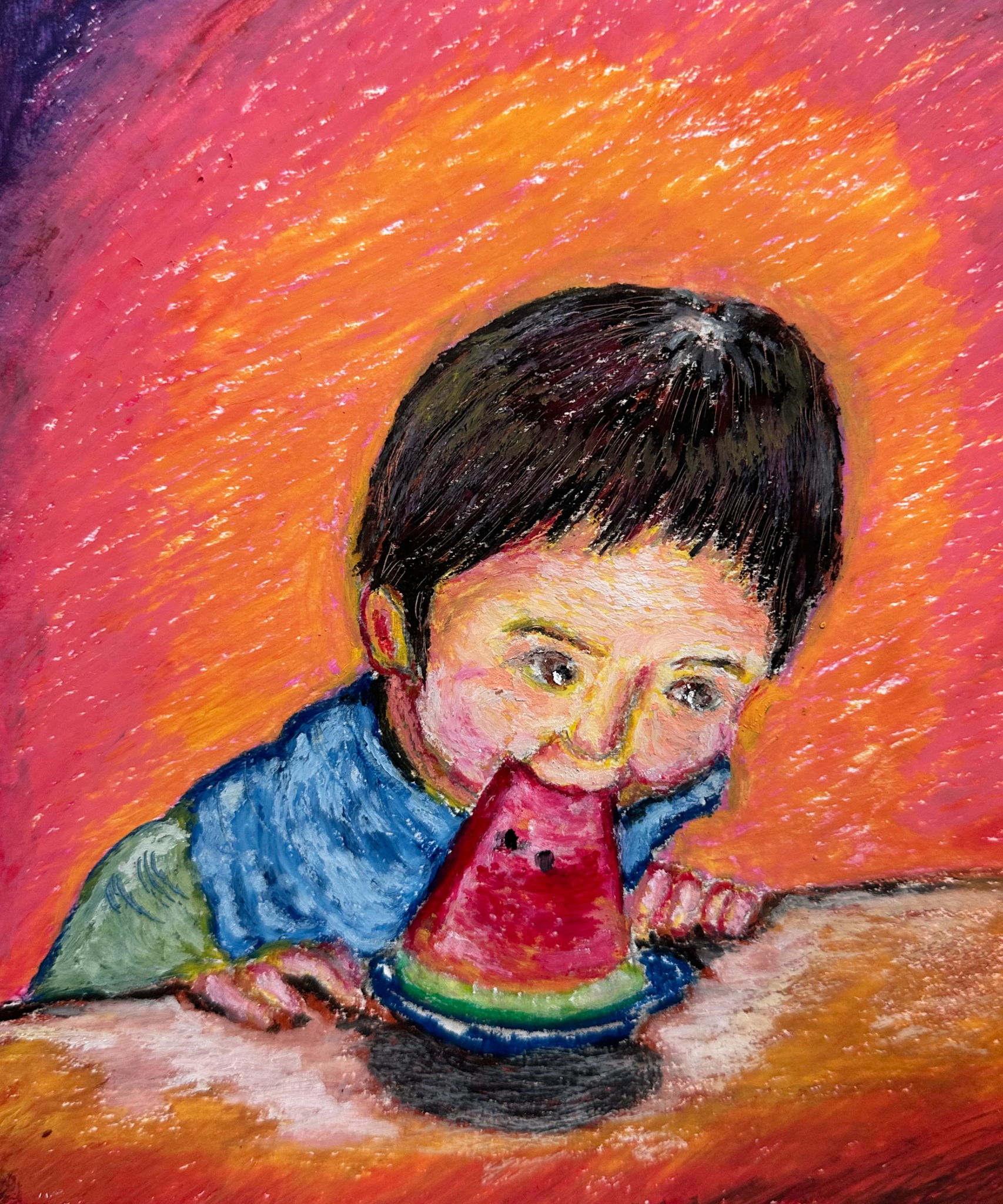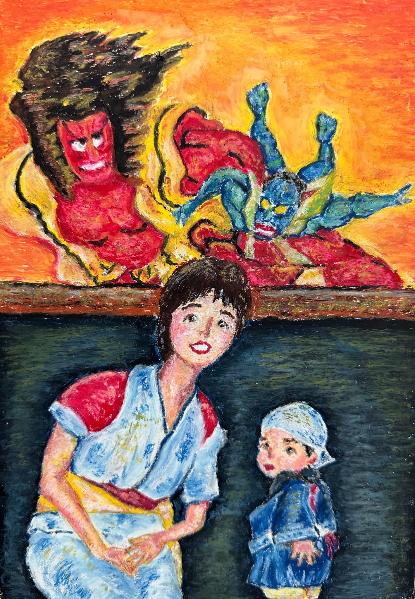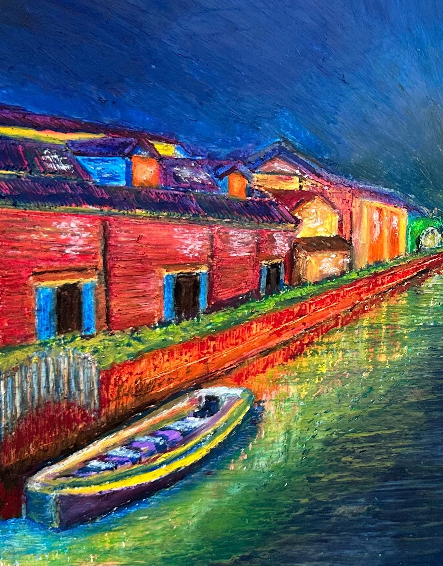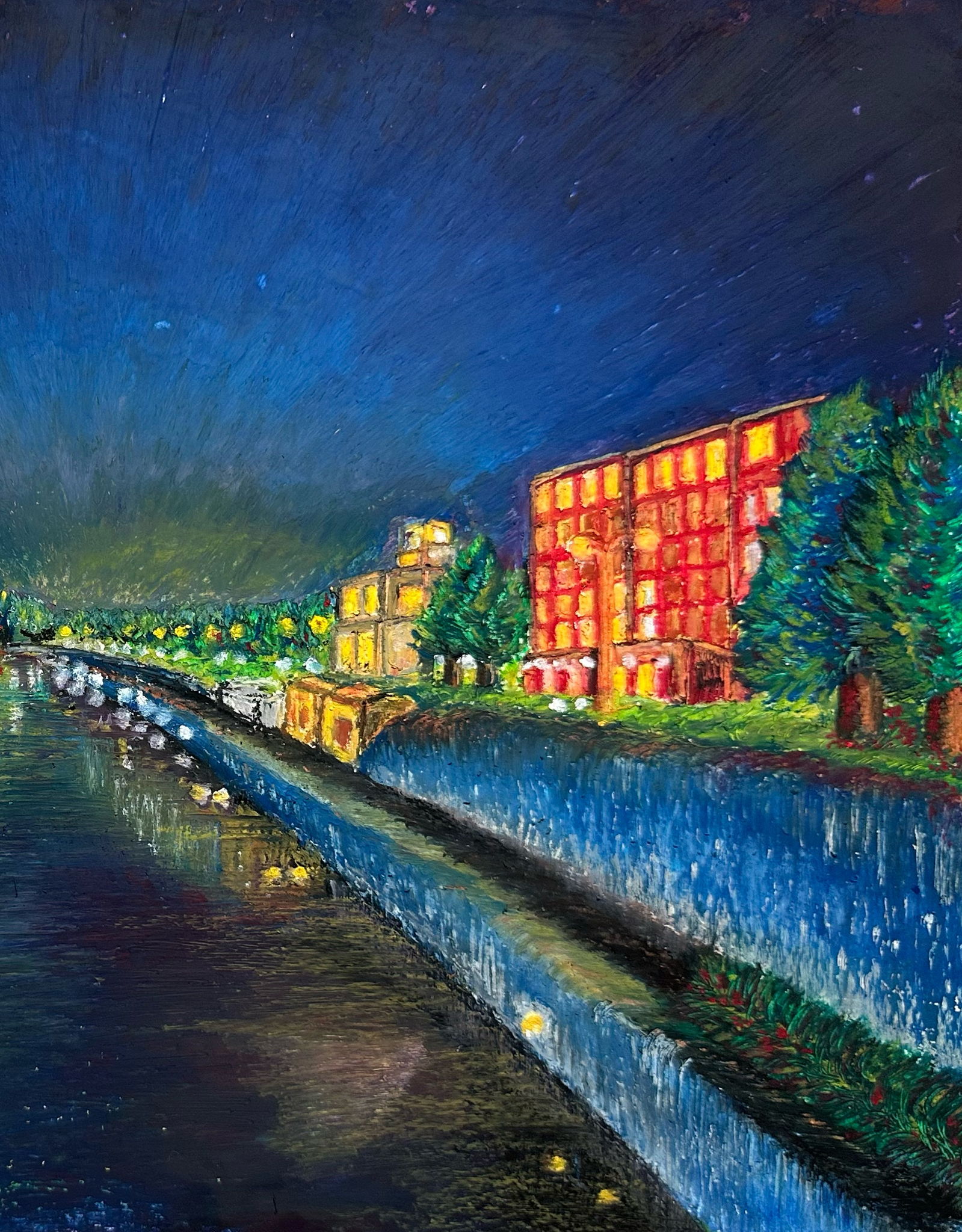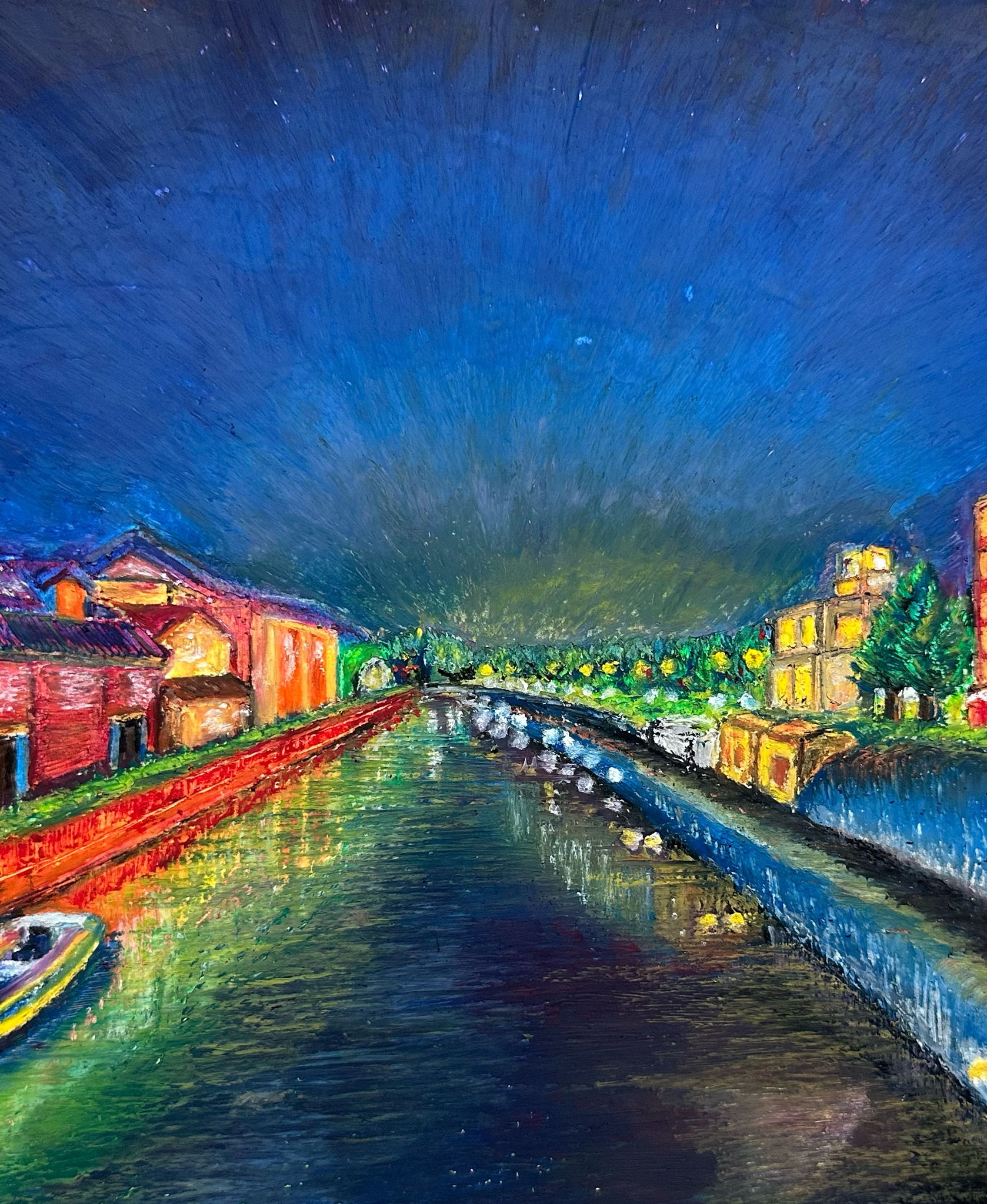 転勤先の札幌で、家族と2年間過ごしましたが、その時、家族と小樽を訪れたことは良い想い出です。あれから約20年たった今、転職先の仕事で、月に一回、小樽に出張に行くのも何かの縁。好きな小樽運河の夜の風景を描きました。