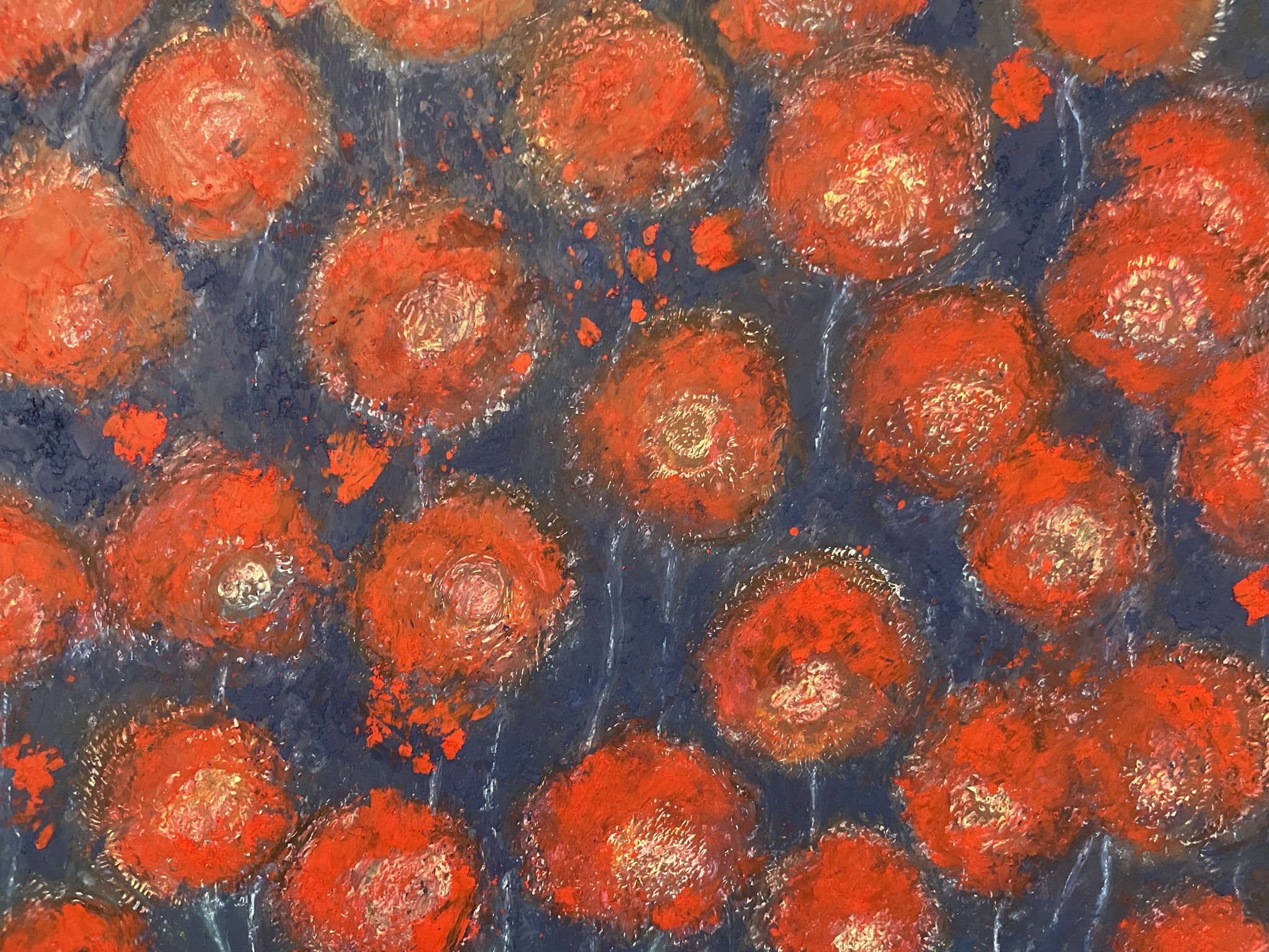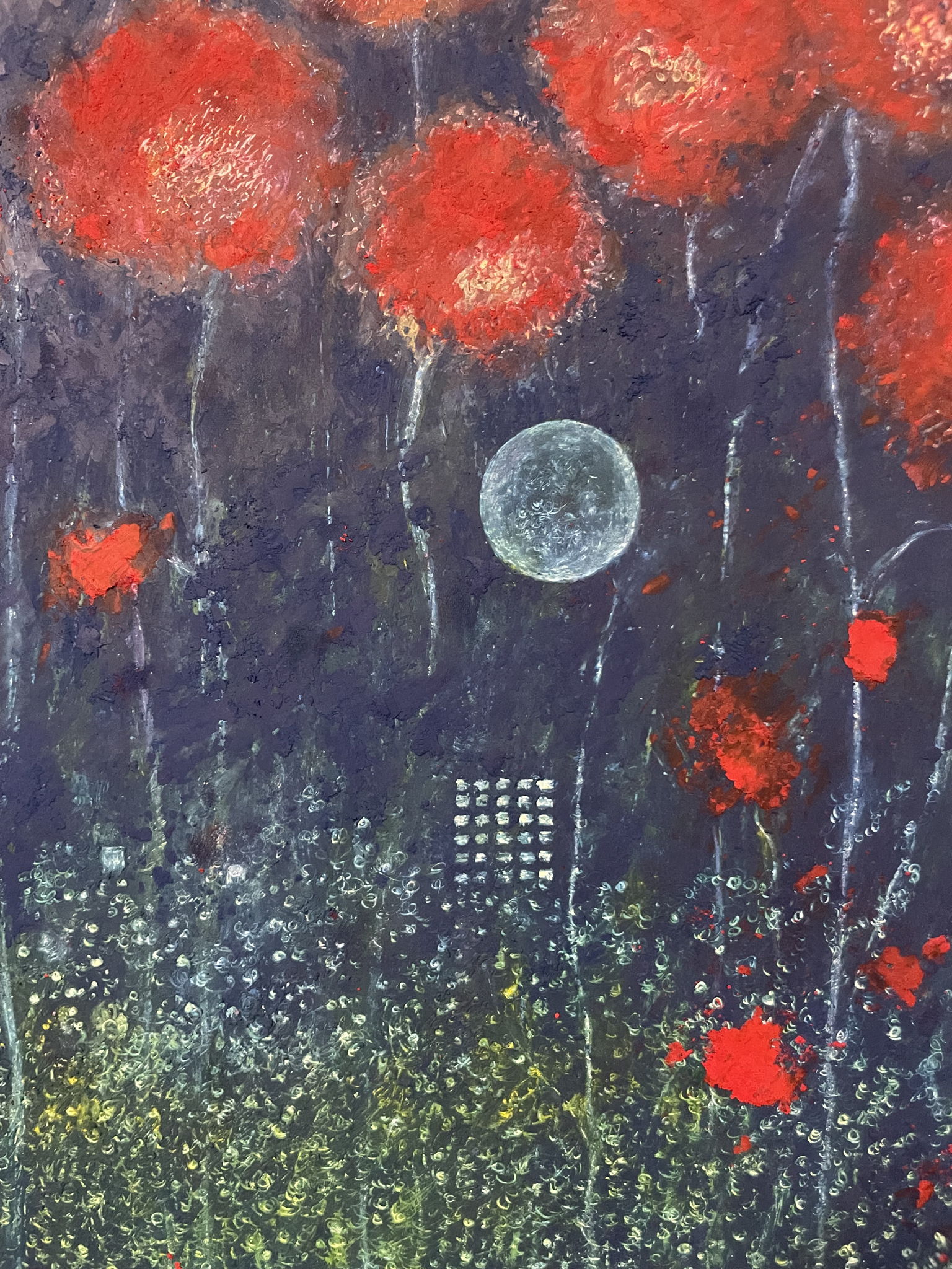 いつも部屋から見る風景が、夜になると途端に景色を変えます。そんな中をイメージで歩きながら描きました。クレヨンを粉々にしてナイフで押さえ塗りしたり、群生する緑を爪楊枝で細かく細かくぐるぐる削ったりするのに夢中になりました。