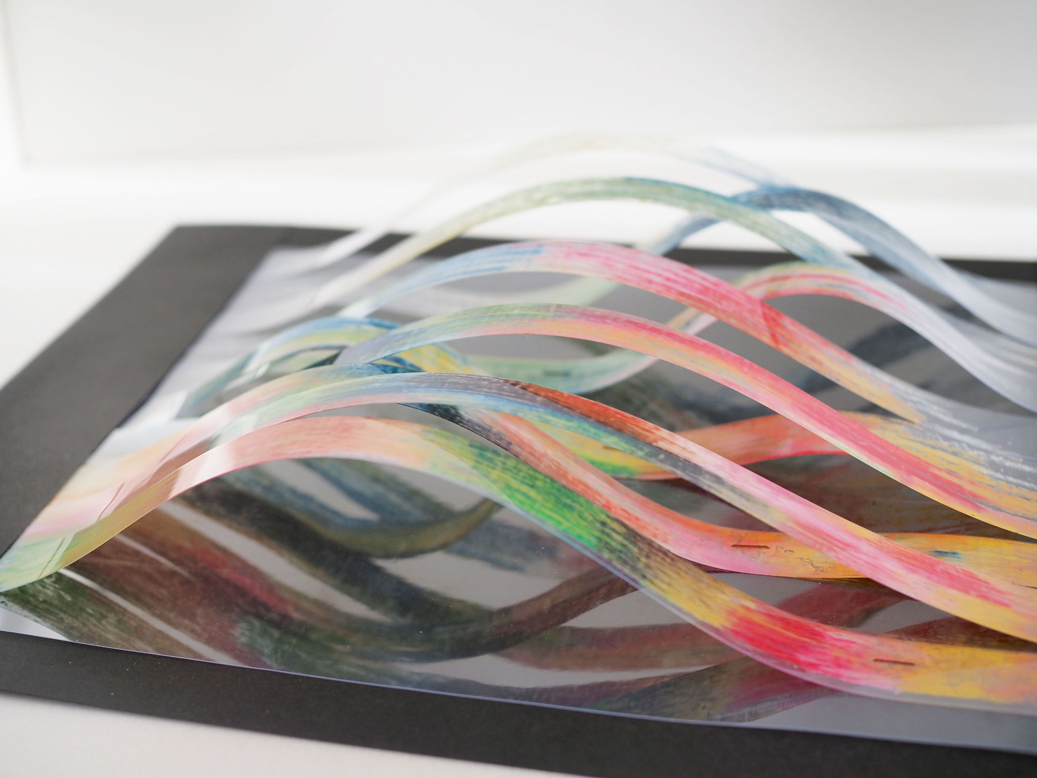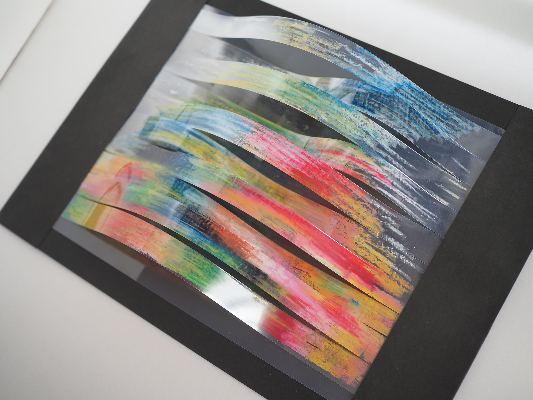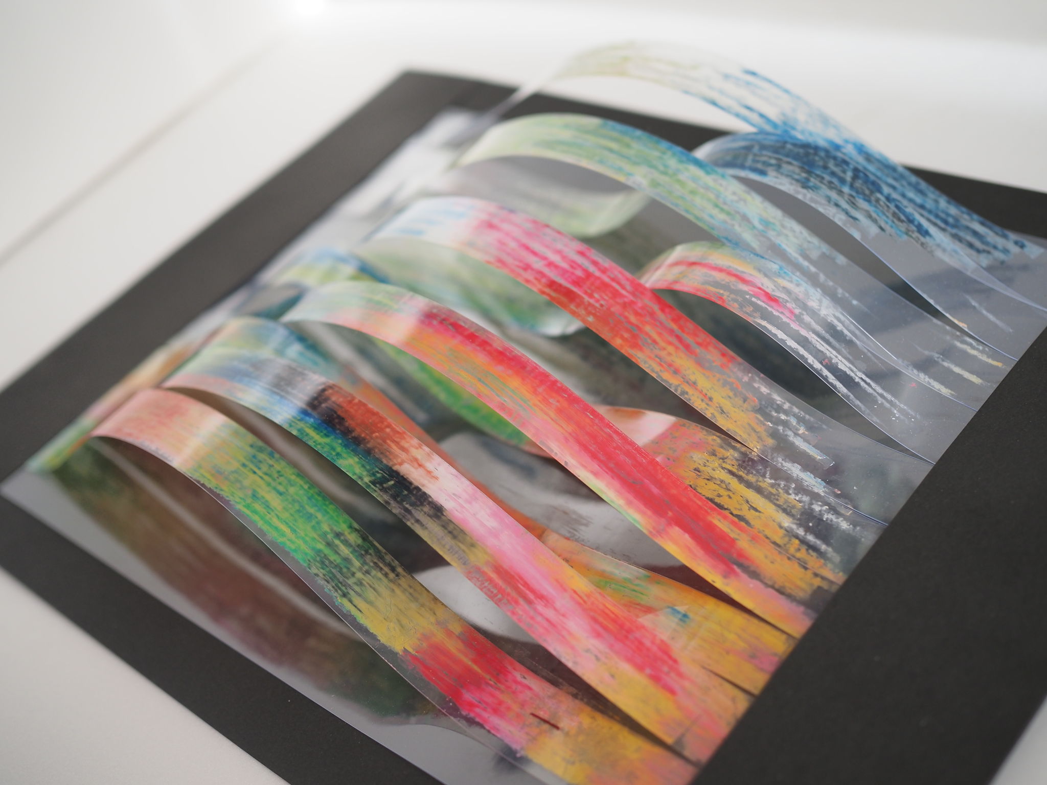 透明フィルムに描いた裏側をあえて表面に見えるようにすることで何事にも「裏」があることも示しています。