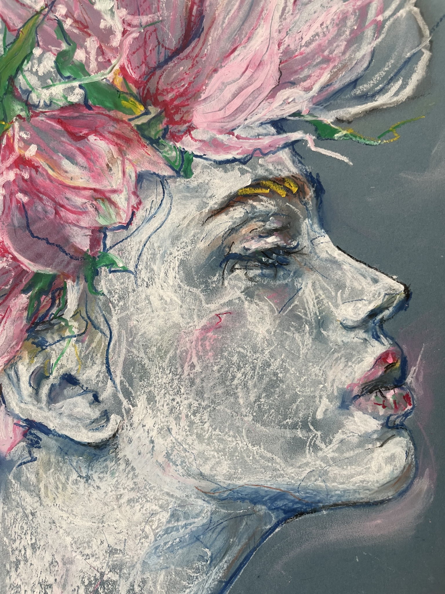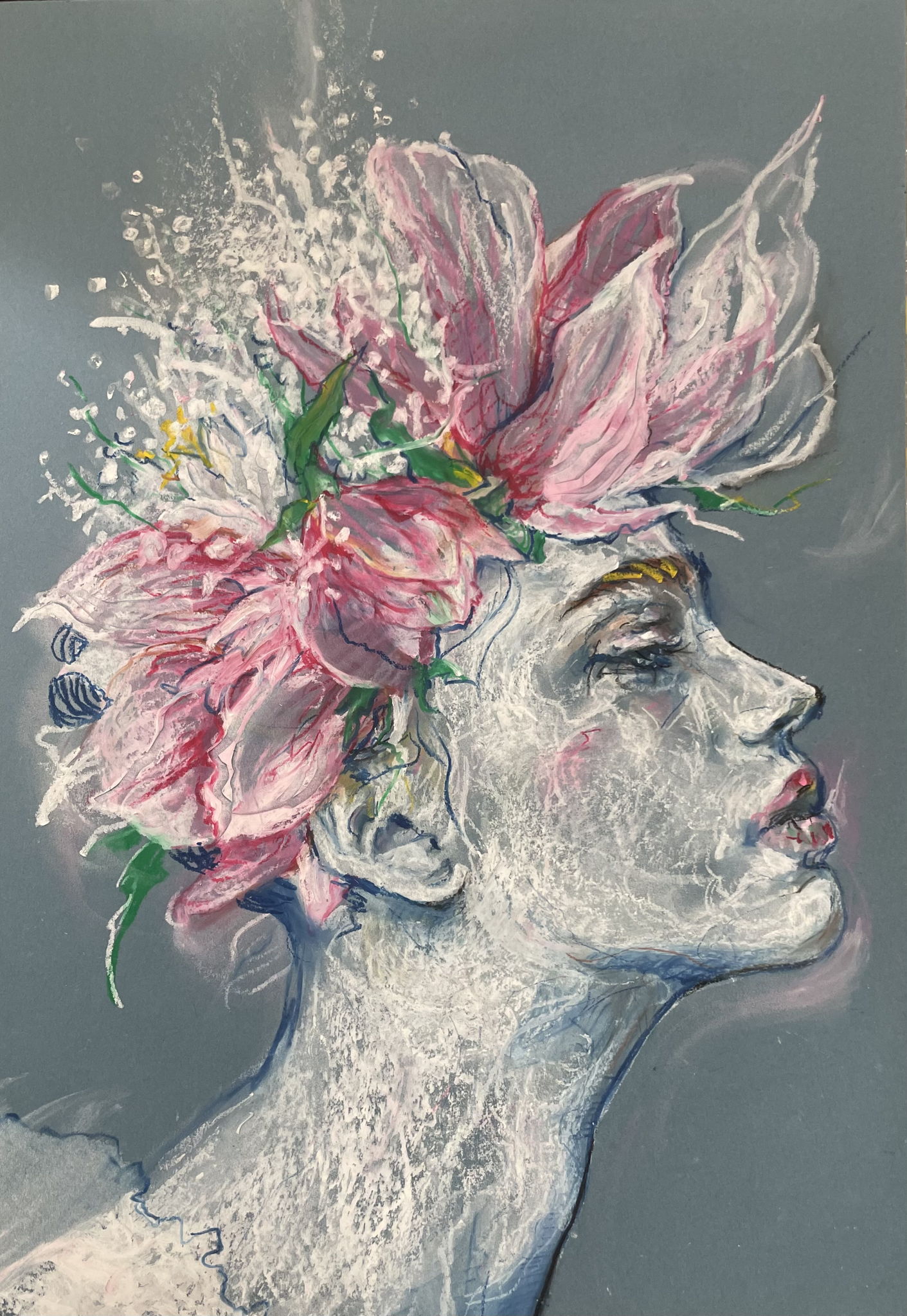 花と人とのあいだに流れる静かな音を、アートクレヨンの柔らかな線と色で探った。