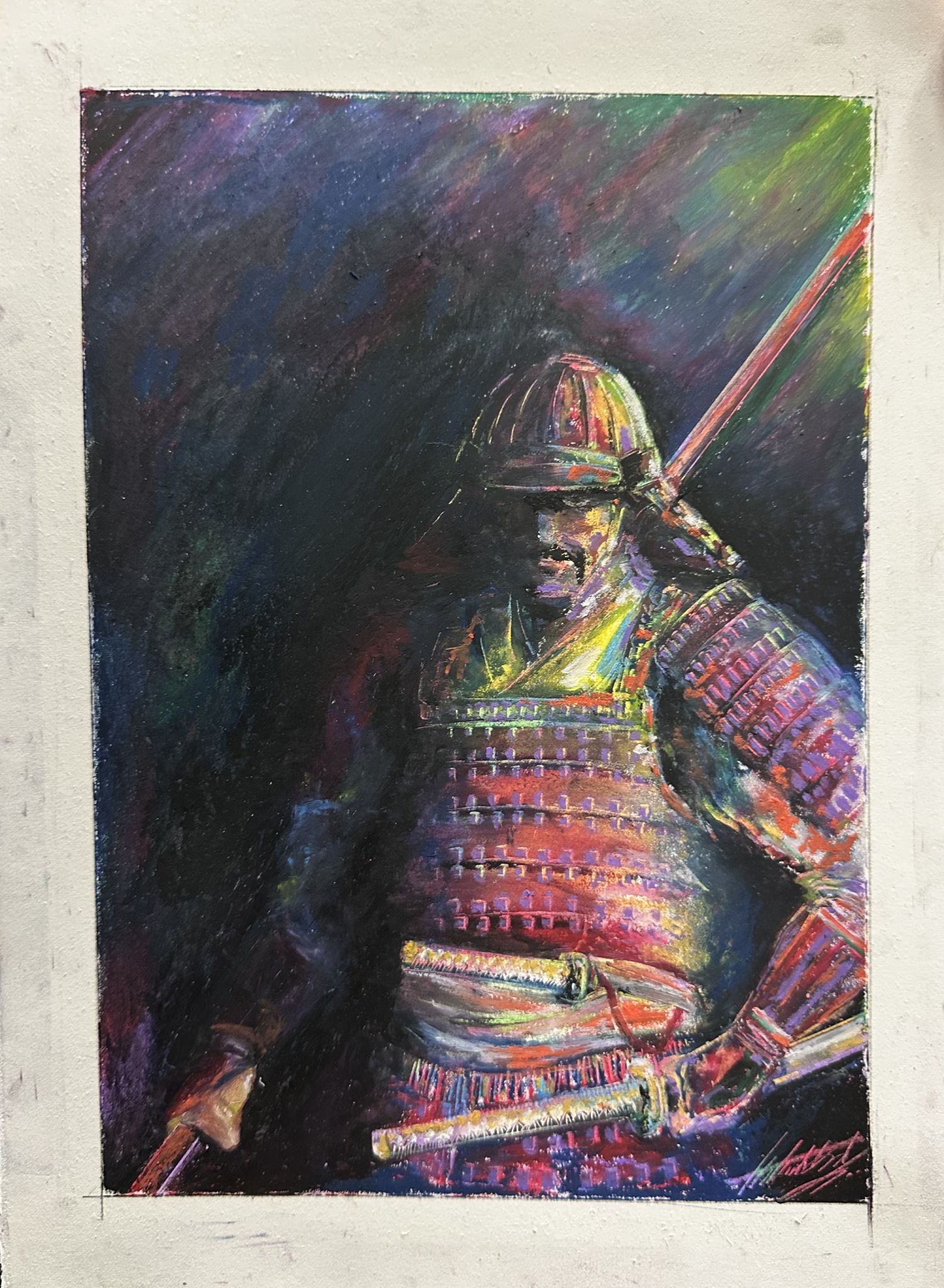 モチーフに悩みましたが暗闇に浮かぶ赤備えの武者の姿がどんどん脳裏に浮かんで来て気がついたらどんどん描き進んでいました。