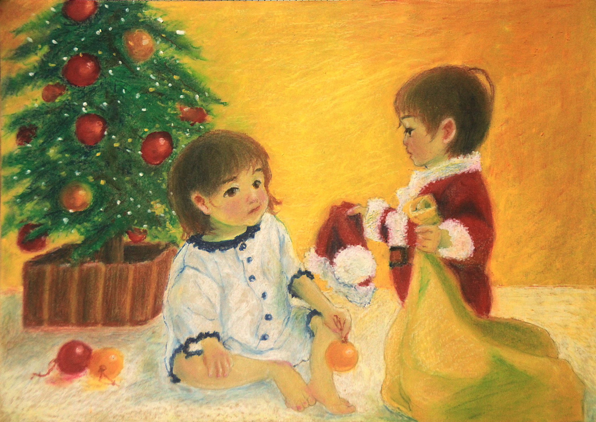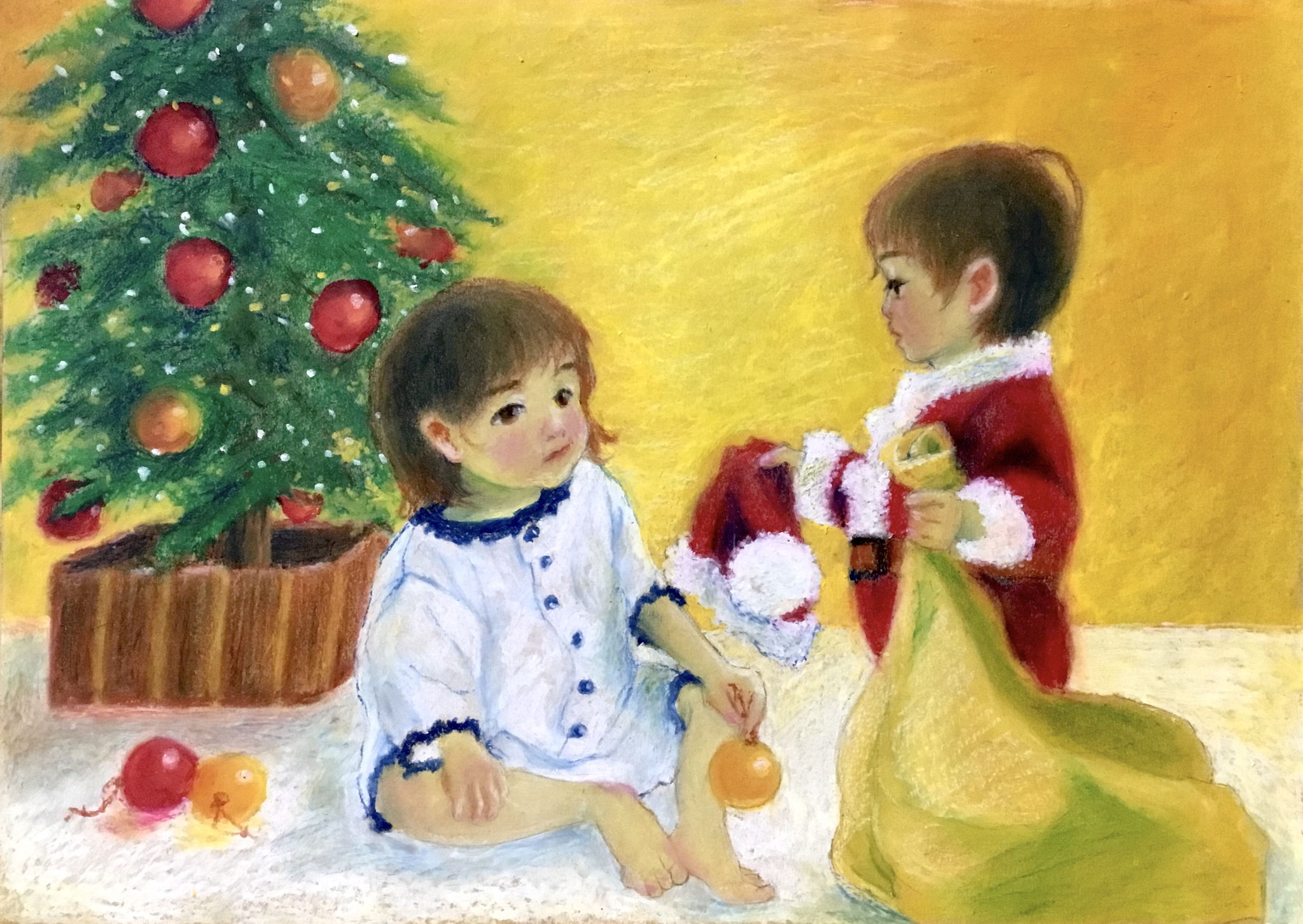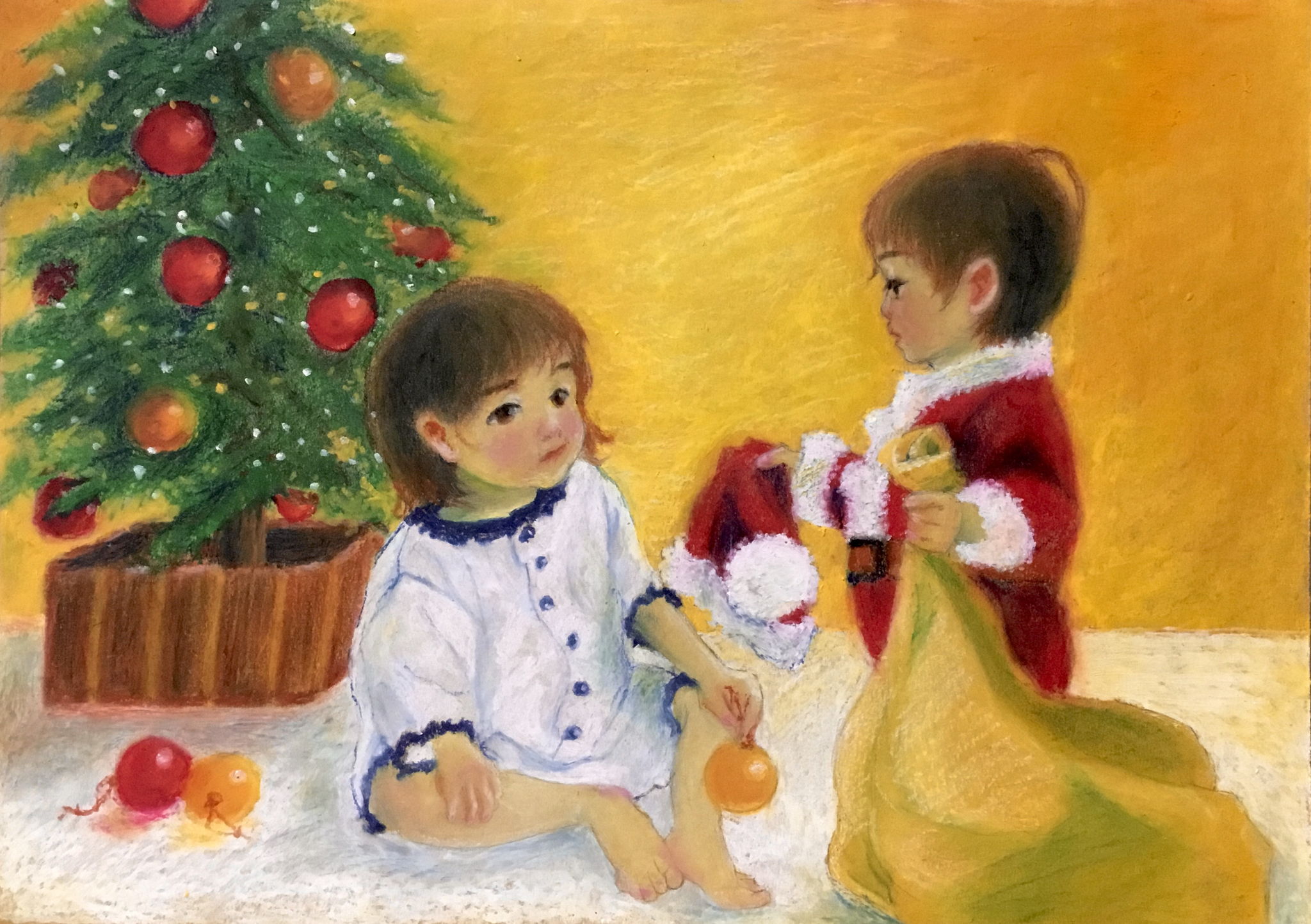 クリスマスに忙しいサンタさんのお手伝いをしたい男の子は、自分もサンタクロースの格好をして、お姉ちゃんにもお手伝いを頼もうと、サンタクロースの帽子を手渡しします。自分の子供をモデルに、クリスマスの優しい一コマを描いてみました。子供って、頼んでもいないのに、なぜか大人のお手伝いをしたがるんですよね。