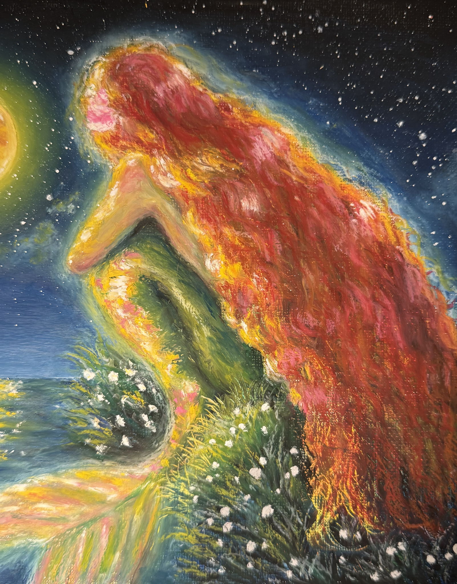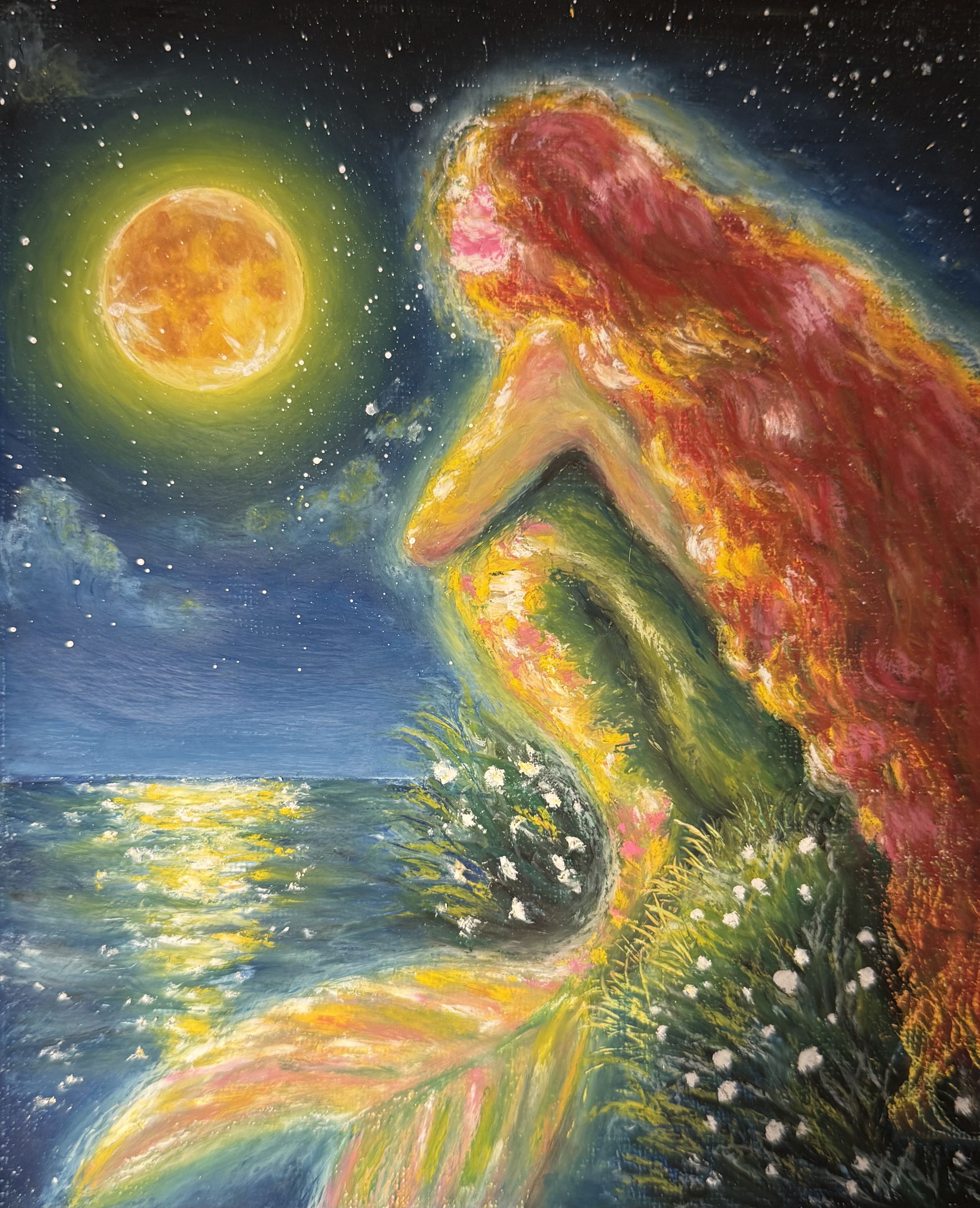月の光に照らされ、鱗や髪がまるで雫をまとっているかのようにきらめく人魚を描きました。静かな波の音だけが聞こえる海で、きらきらと光る水面と月を眺められたらどんなに心が癒されるだろう、と想いながら描いています。