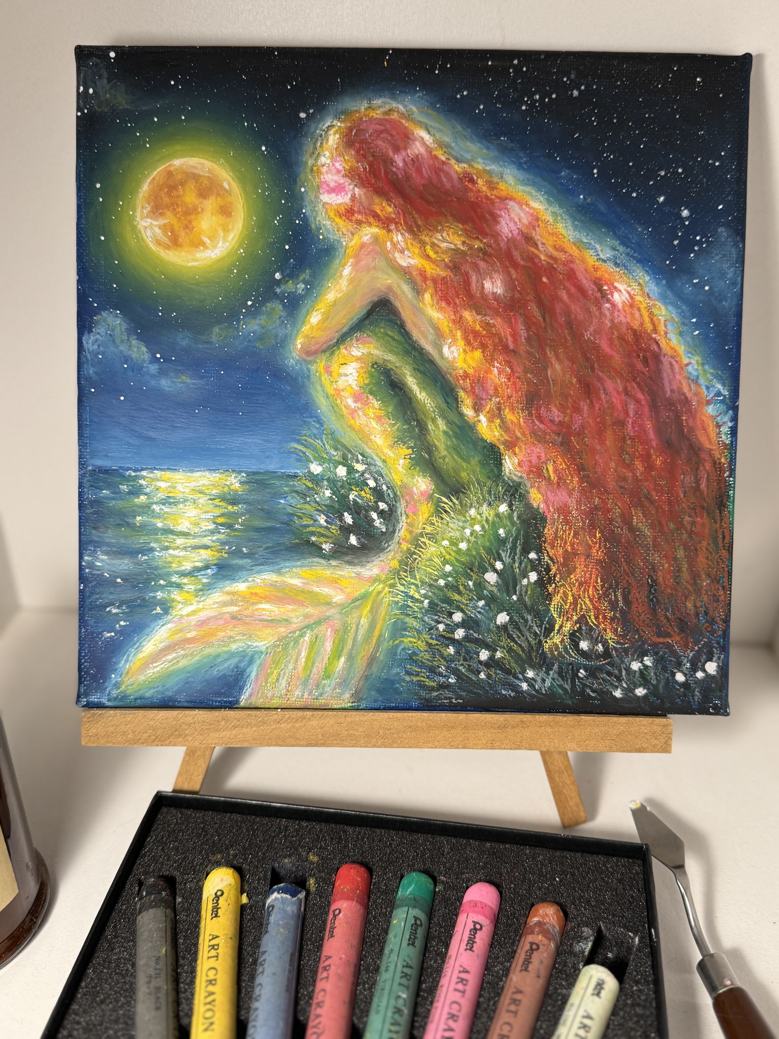 8色のアートクレヨンで月の光と海のきらめきを表現することは私にとって小さな冒険でした。