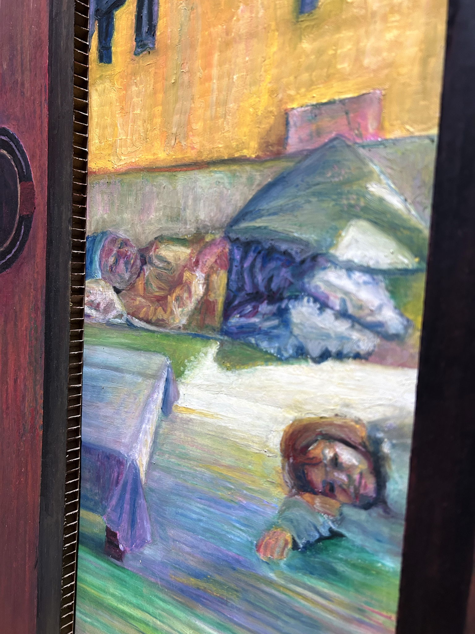 北海道にある、母の実家でのワンシーンを描きました。仏間で寝ていた私が、お昼頃に起きて最初に見た景色です。襖から覗く母と祖父の寝顔がなんとも心地よさそうでした。