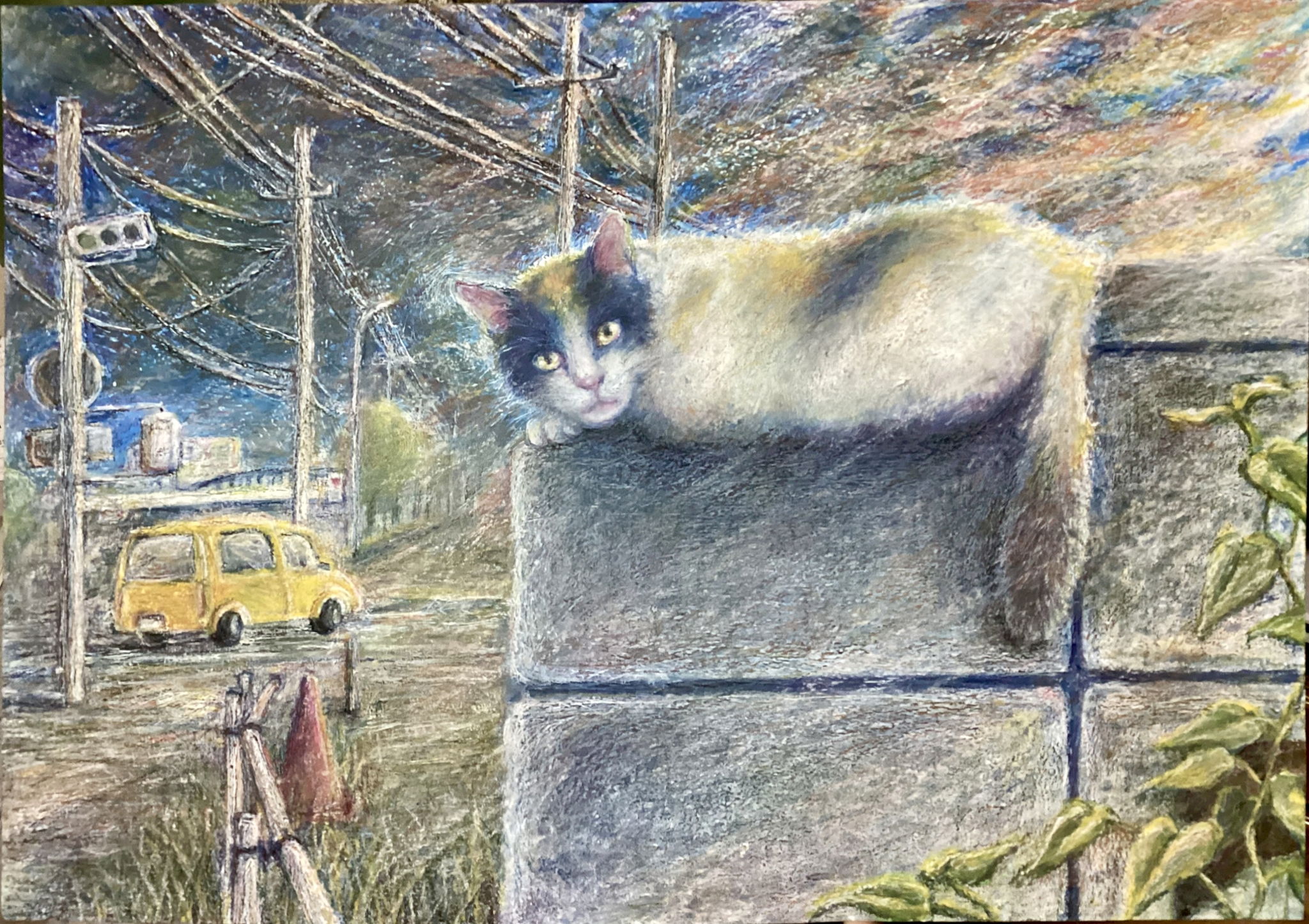 使用したのはアートクレヨンで、色を厚く重ねつつ、目に見えない色を優しくのせて奥行きや立体感を出しました。
