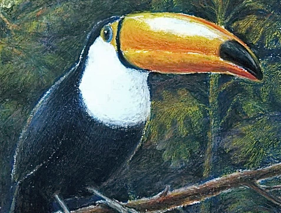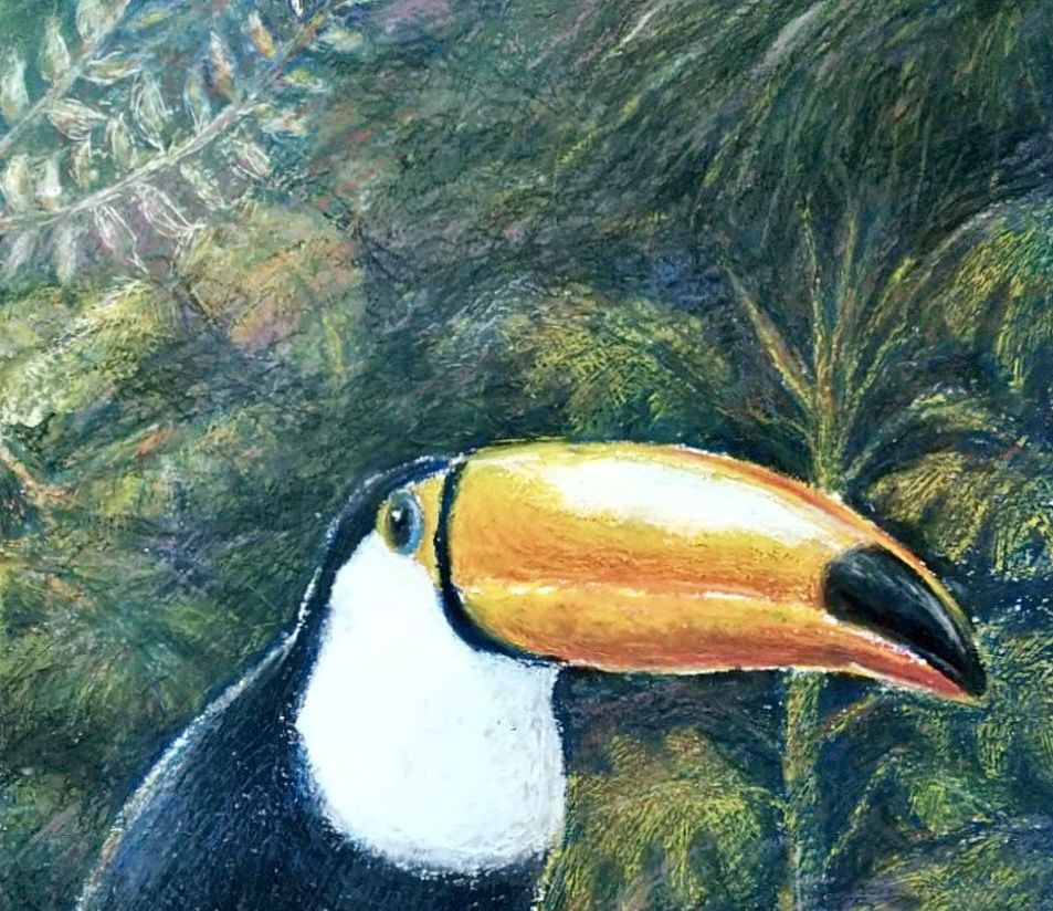 その分、奥行きを出しつつオニオオハシを目立たせるのが難しかったですが、黒で光と影のメリハリをつけたり、あえてピンクをのせて色が調和するよう試みたりし、楽しみながら描きました。