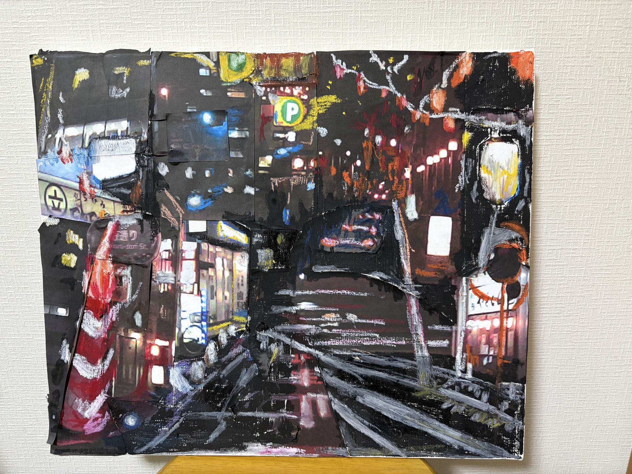 低解像度の夜の街の写真を切り貼りし、アートクレヨンでもっと夜が楽しくなるように加筆を行った。
