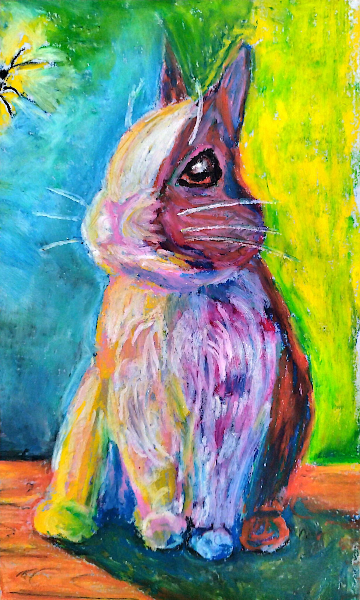 虹の橋を渡って久しいうさぎさんを思い出して描きました。部屋に蝶々や蛾が入ってくると何故か素知らぬ顔で仕留めたのです。実は狙っていたのかもしれません。