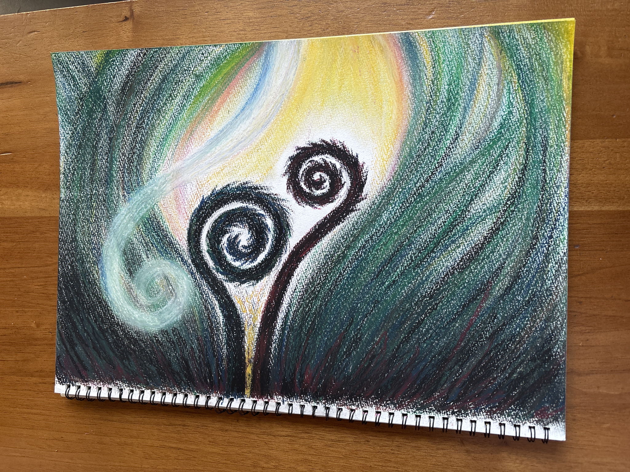 生命そのものの歓びを、クレヨンの色の重なりで表現しました。