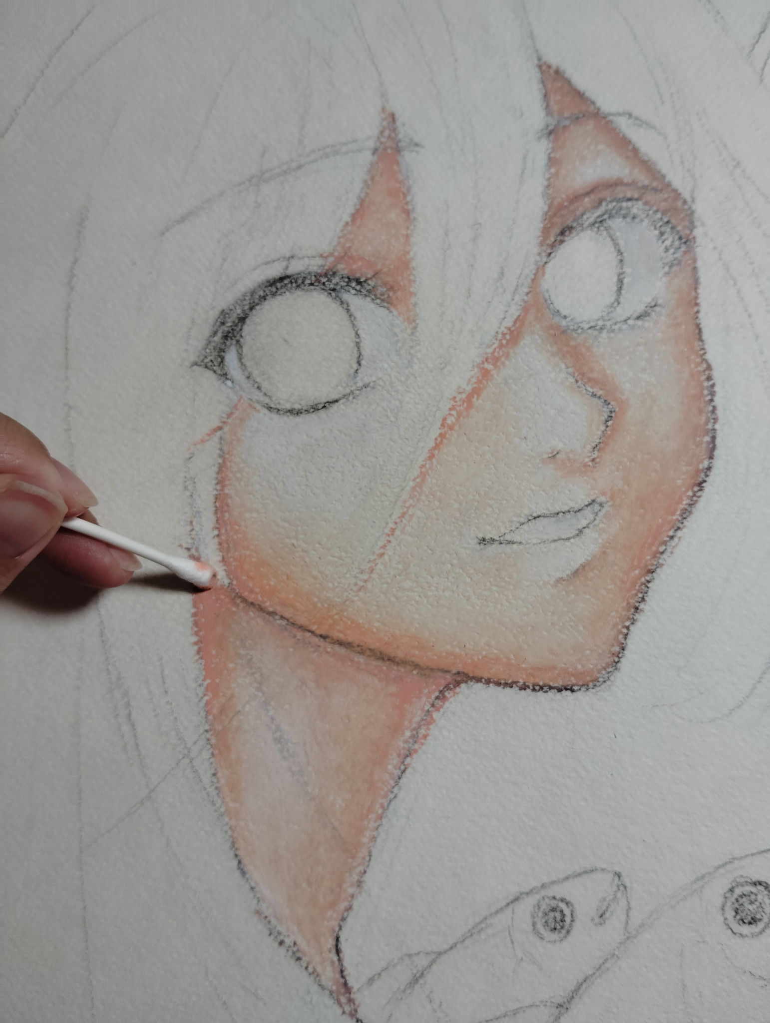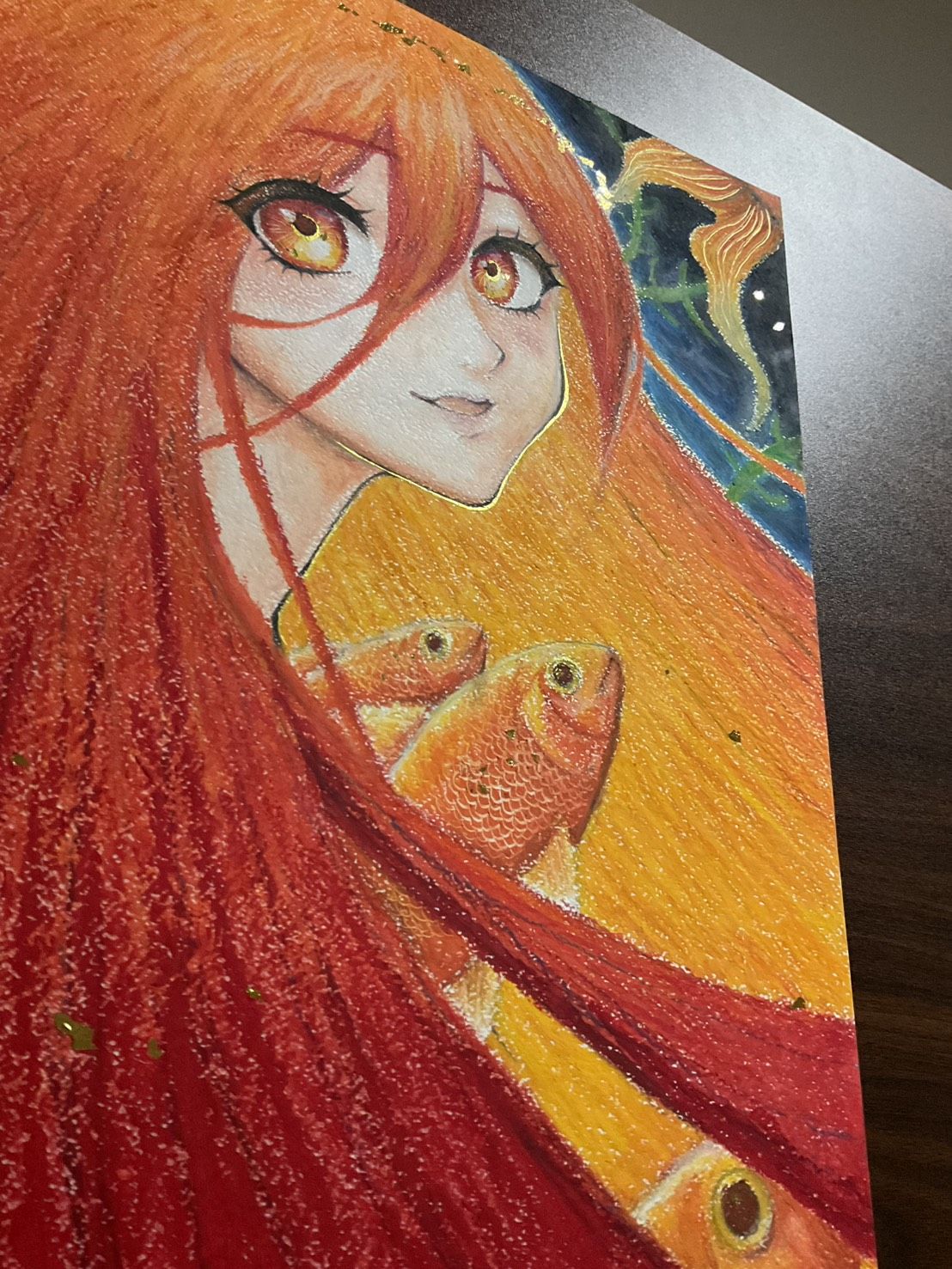 私の好きな魚と女の子を組み合わせてみました。クレヨンでもアニメ調のイラストが描けるところを見て欲しいです。細部には色鉛筆を使用しました。