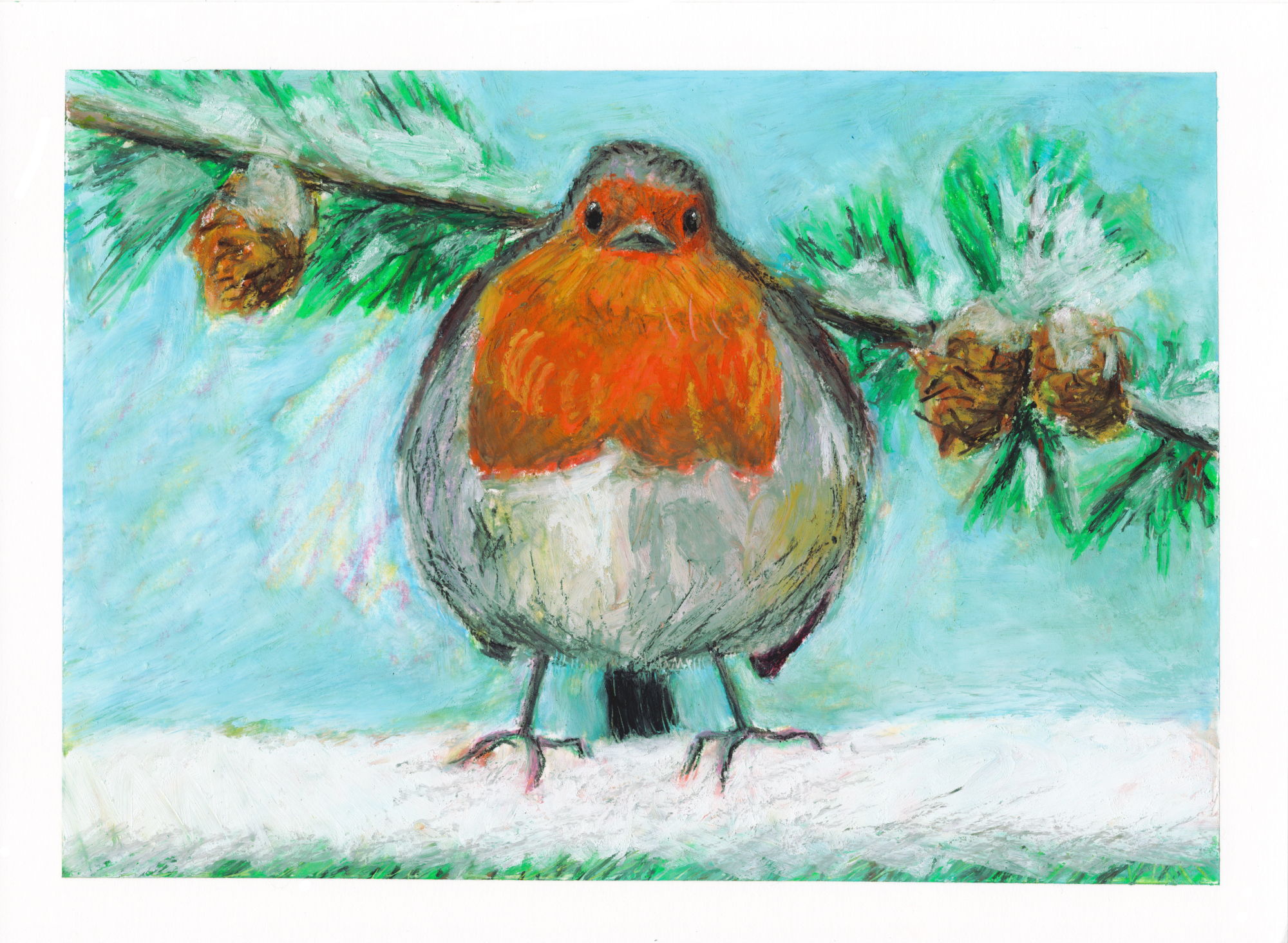 ロビン(西洋コマドリ)と松の木です。少し早いですがクリスマス気分で雪を積もらせてみました。