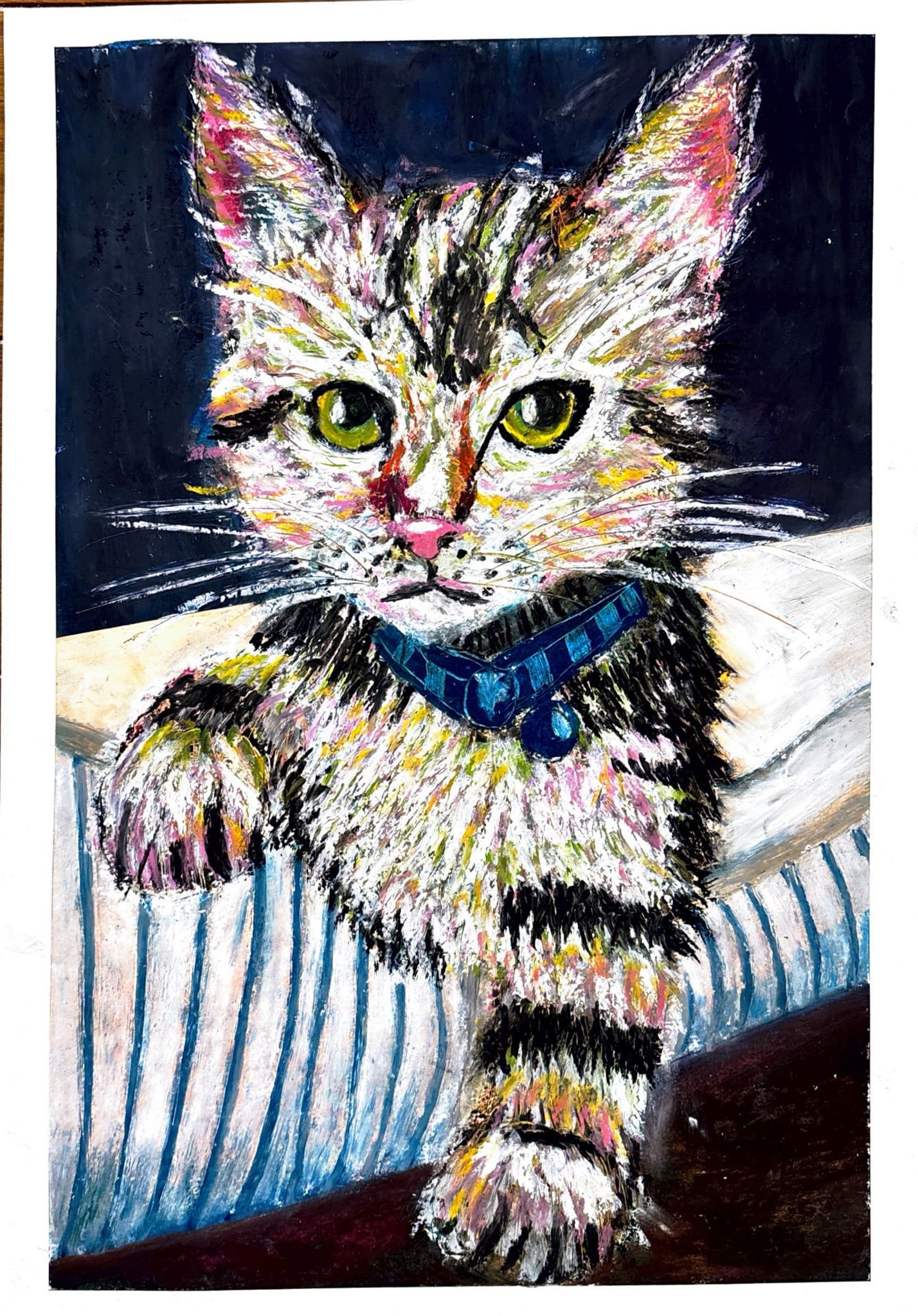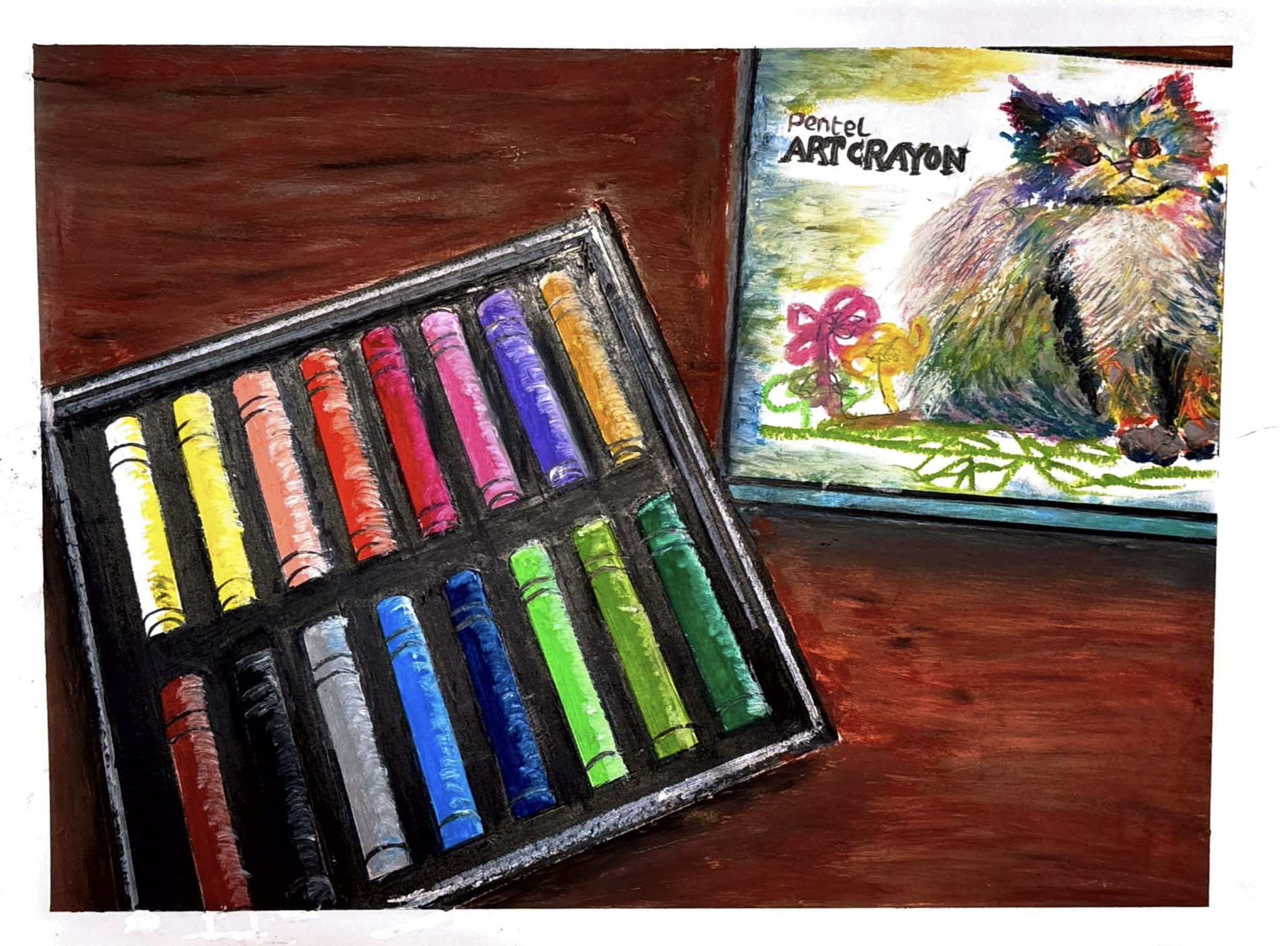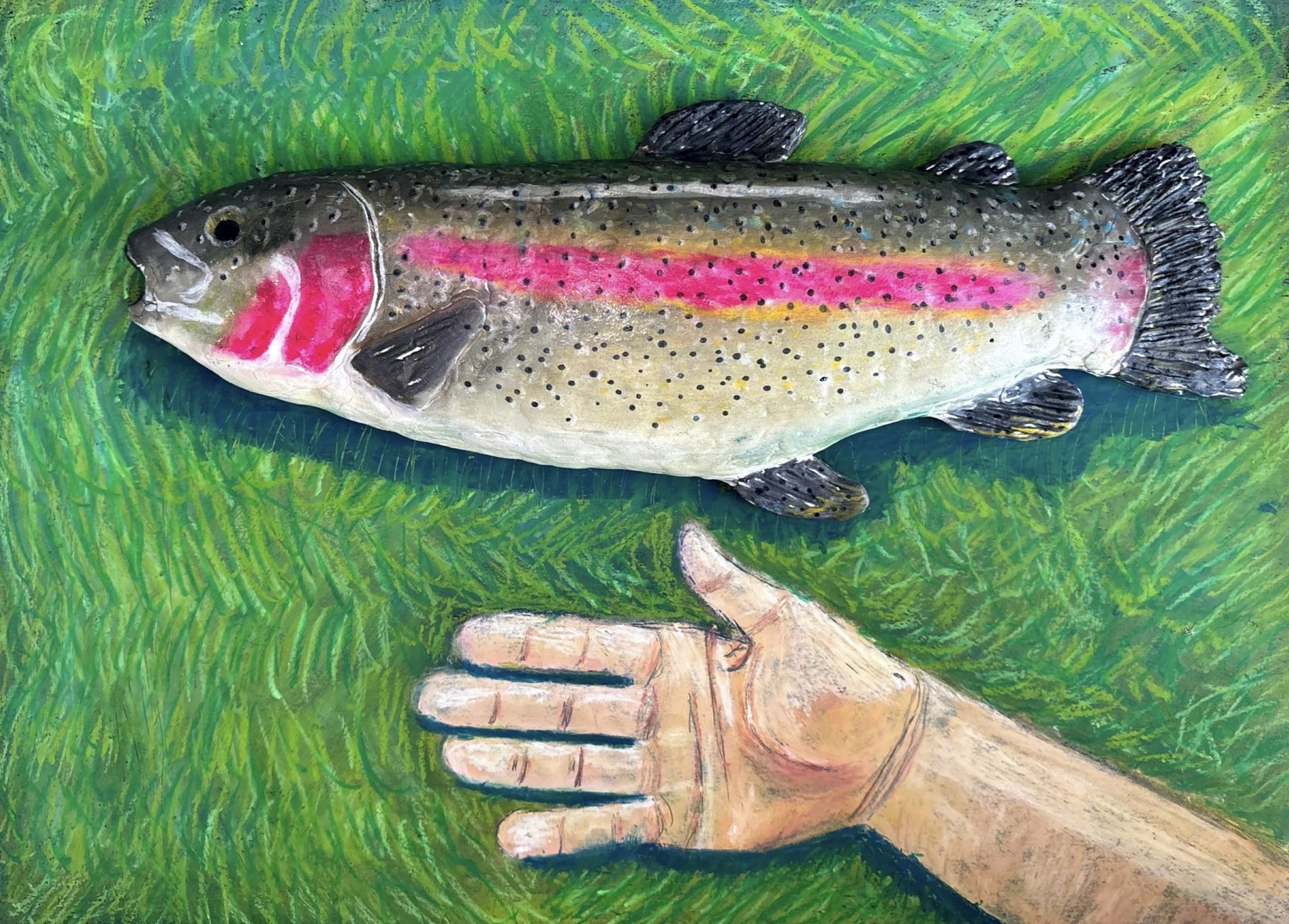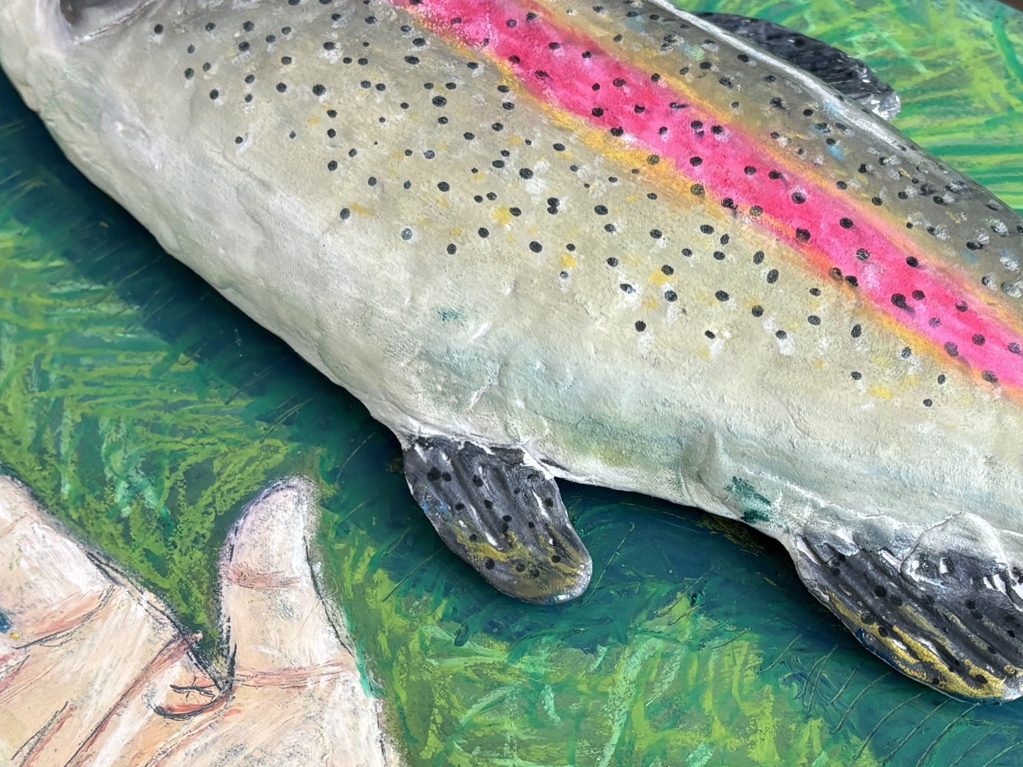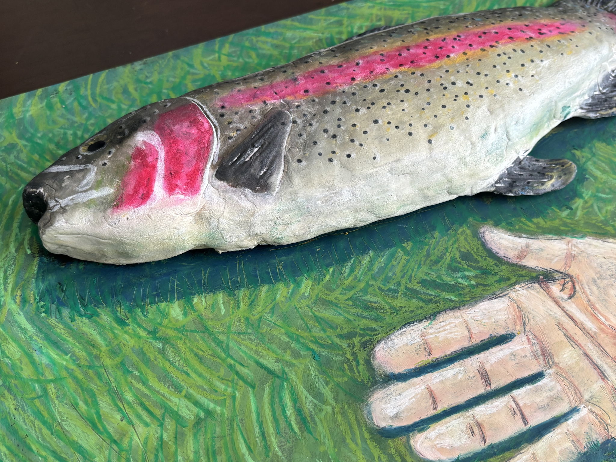 見て下さる方たちに、ニジマスのサイズ感やリアルさなどをより伝えたくて、紙粘土でかたちを作り、アートクレヨンで色づけました。