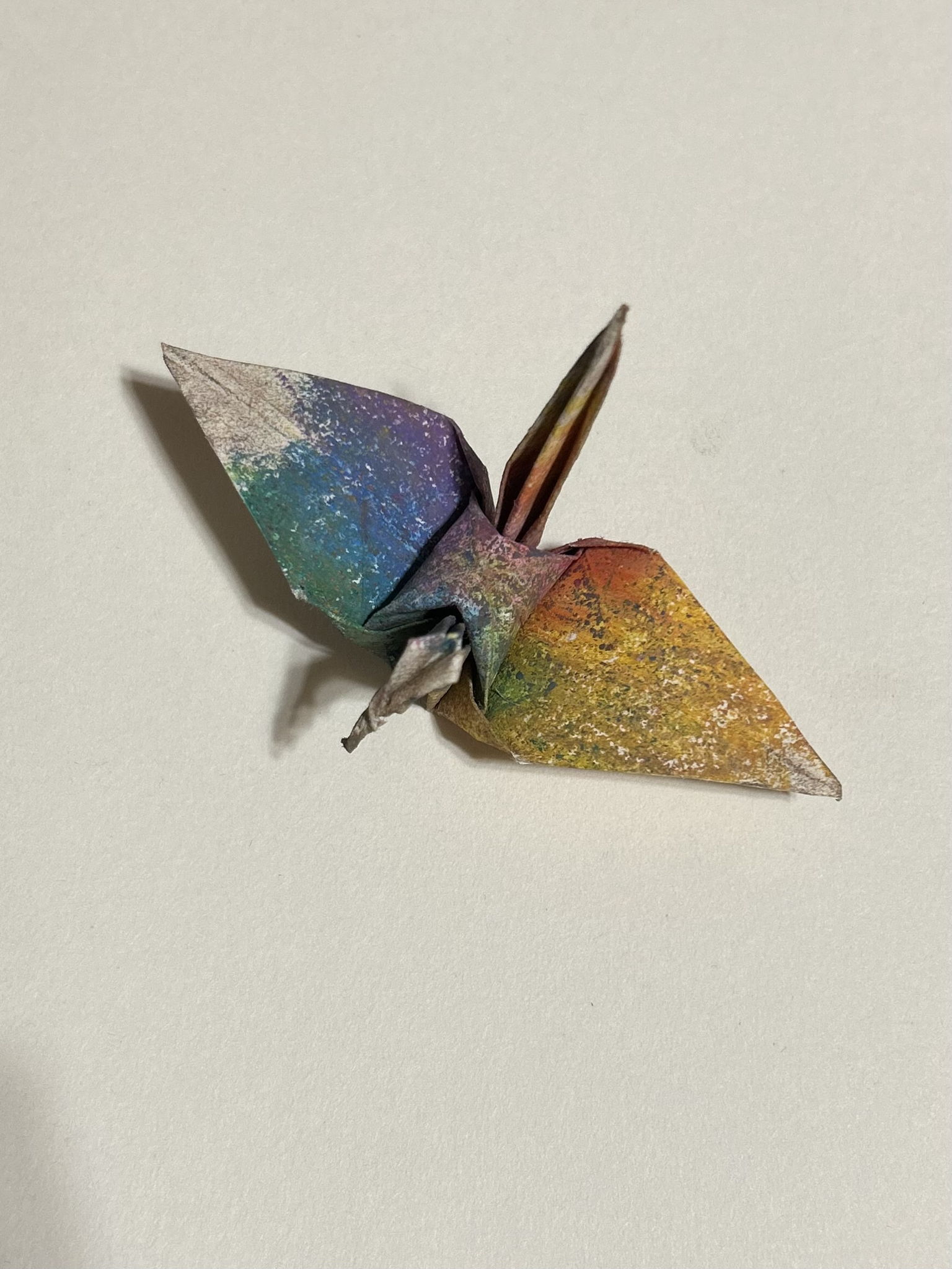 グラデーションになるように描いた紙を折り紙にし、グラデーションを模様に見立て、折り鶴を作りました。クレヨン感が出るのがいいところだと思いました。