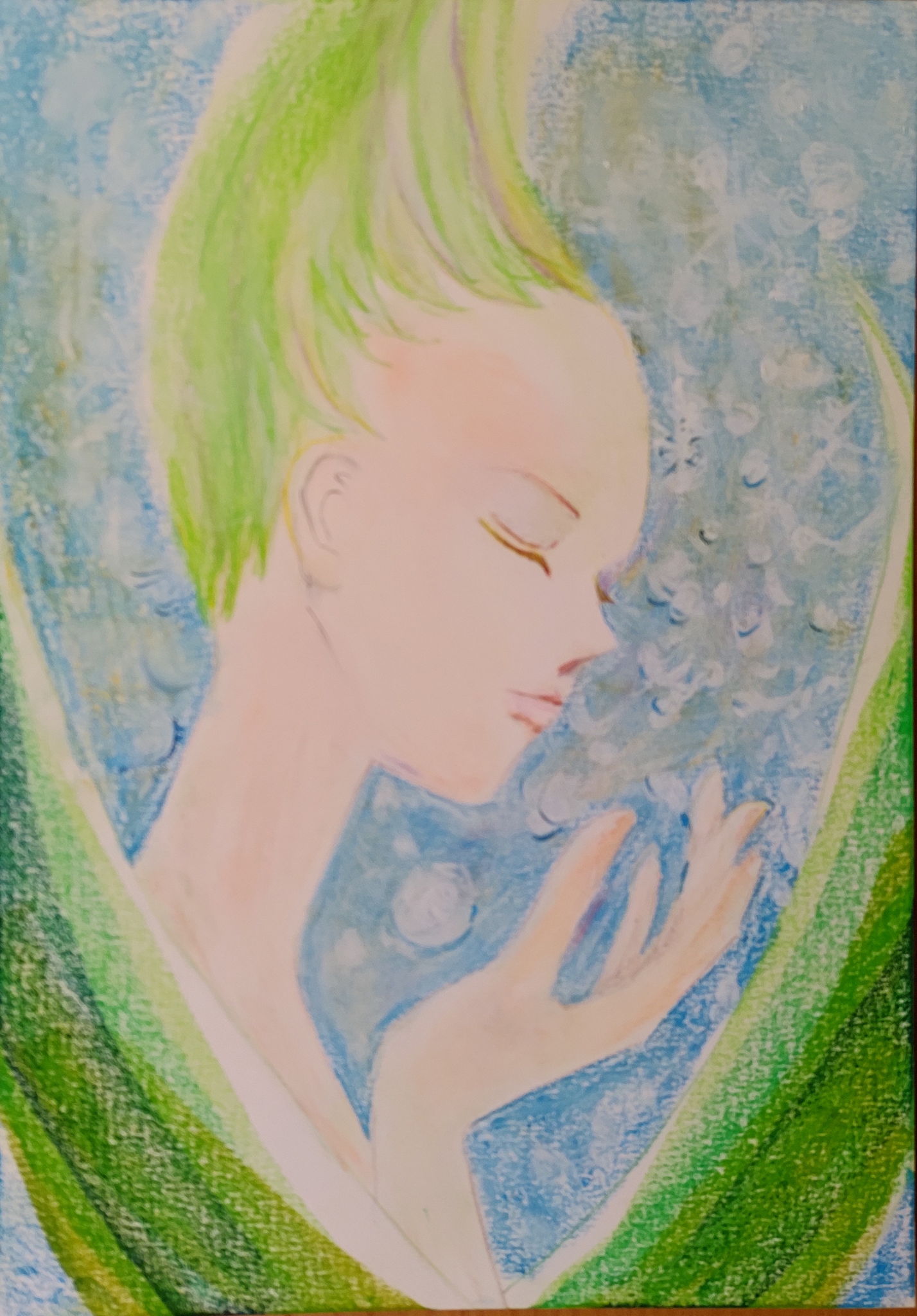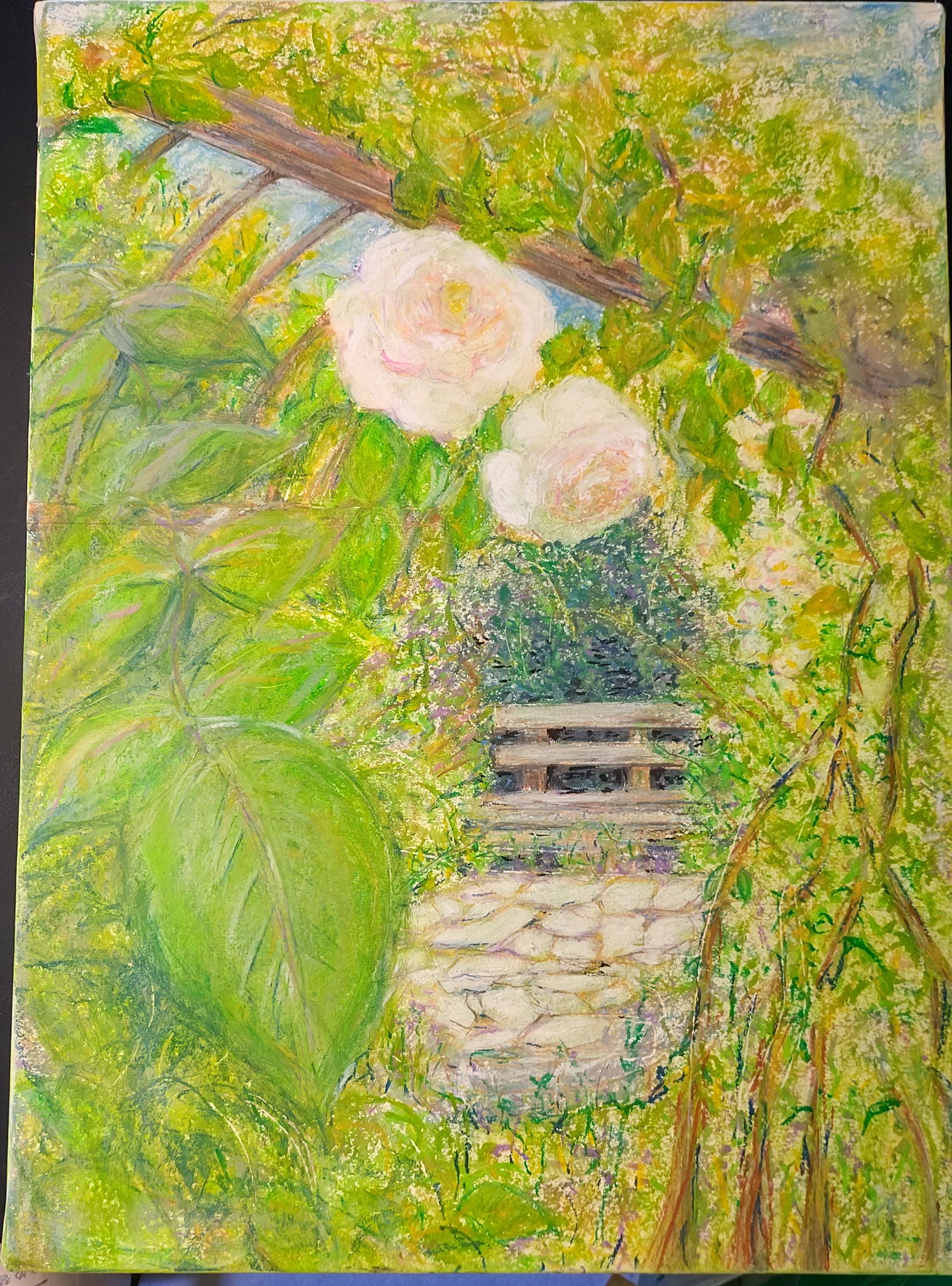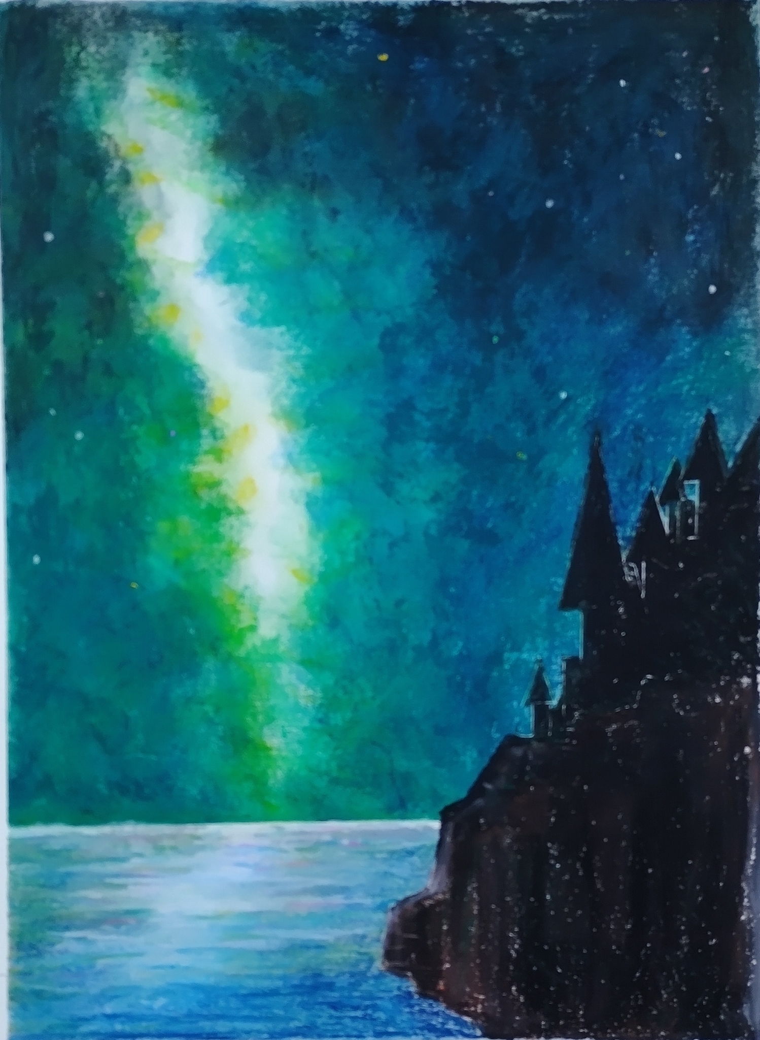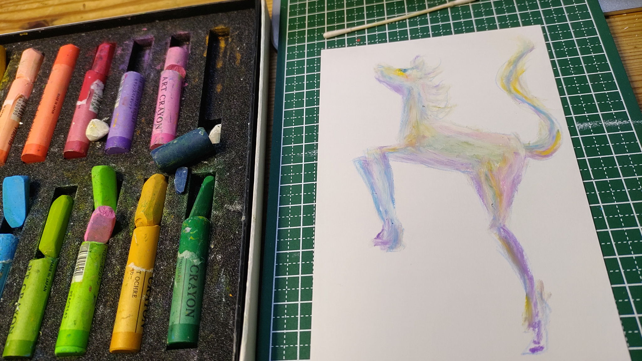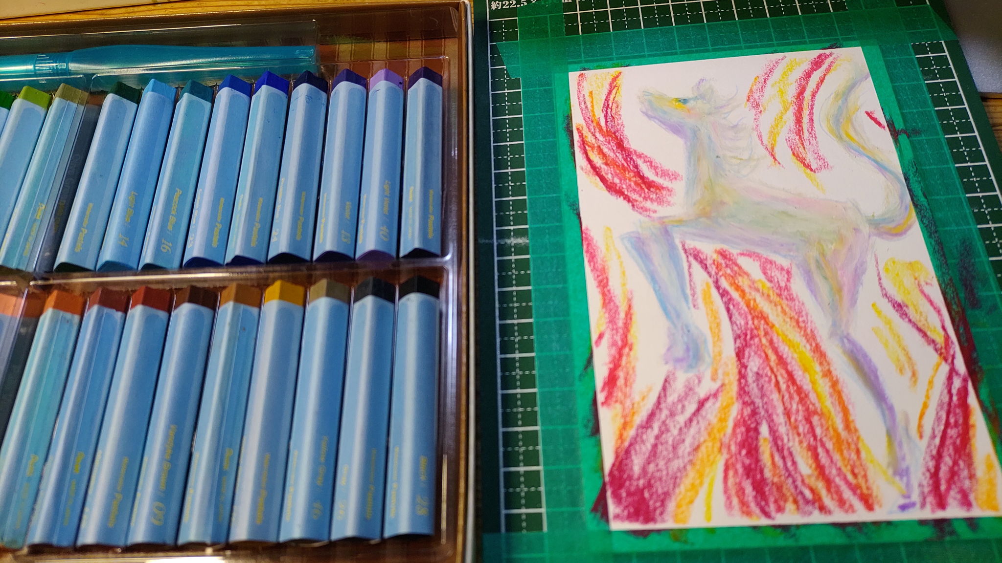 Batikは普通の水彩(ぺんてるエフ水彩)でも良いですが、1部パステル調の筆跡を残せるのが水彩パステルの良さです。