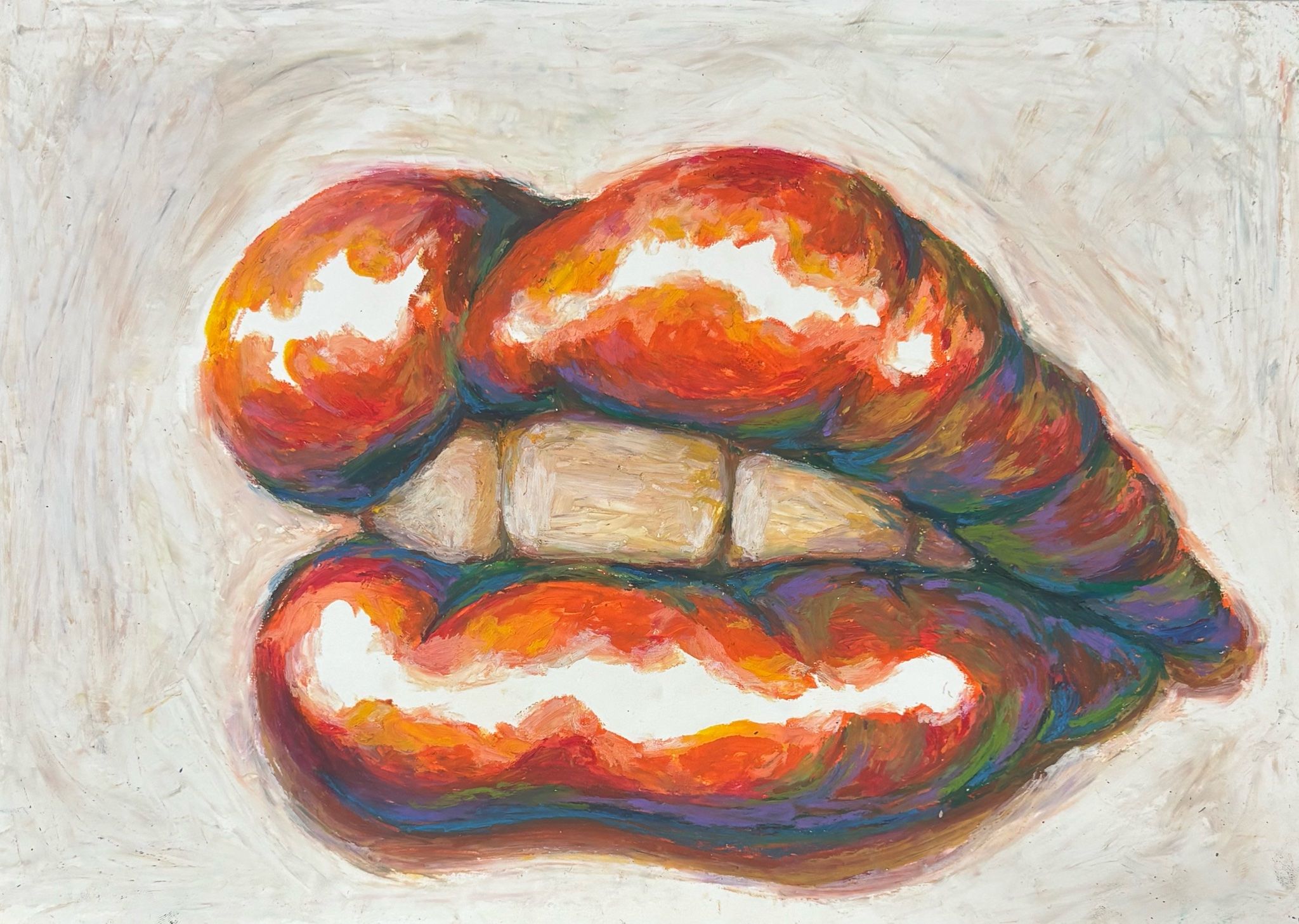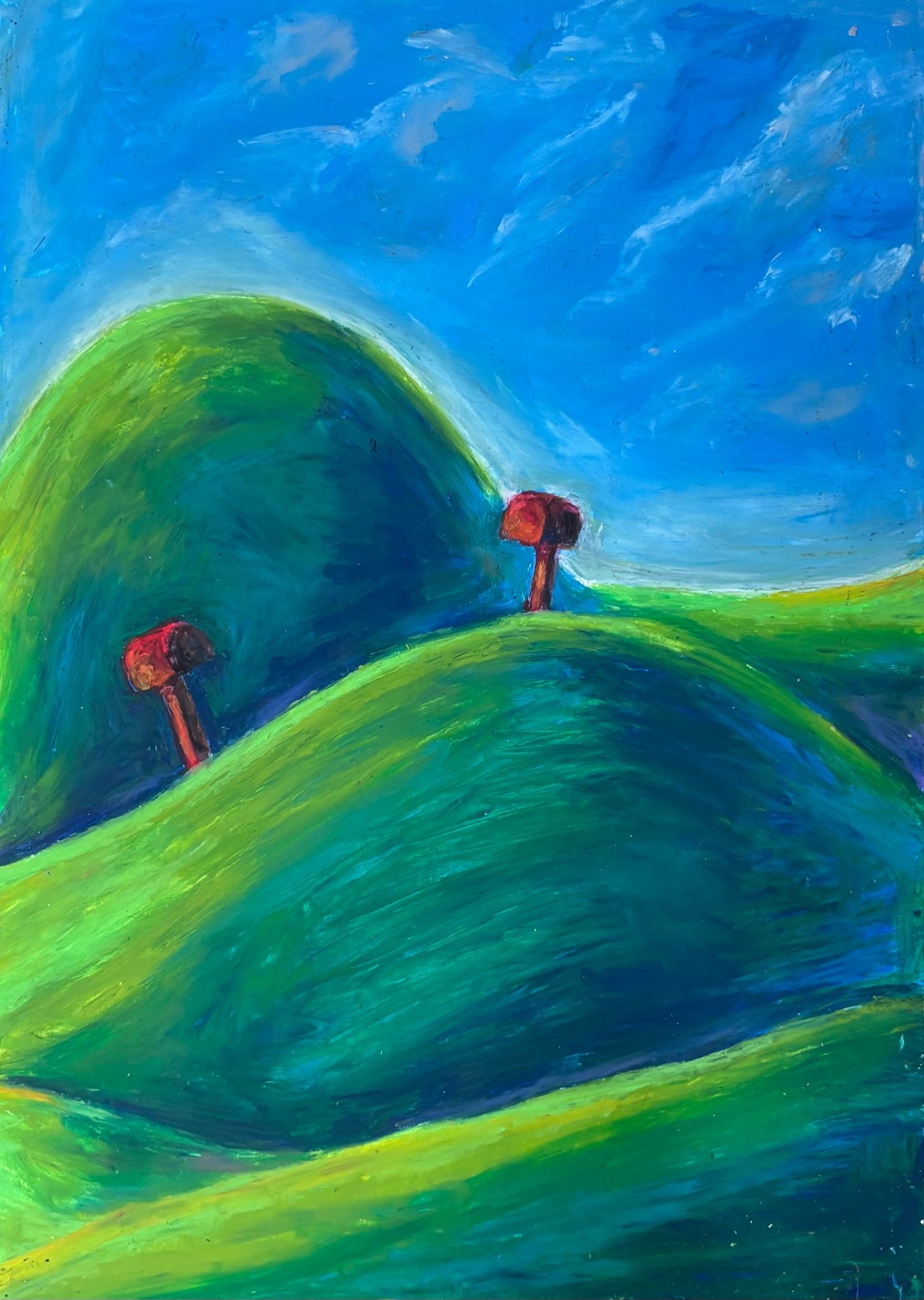 恋人をメインテーマとして描きました。唇のほうは、ピンク色と赤色を使っています。みている人が飽きないような自然な色をチョイスしました。個人的にお気に入りなところは、唇がくっついているところがぷっくりと盛り上がっているところに厚みを感じられるところです。また、愛し合っている人たちや大切な人たちすべての方に幸せになってほしいという私の気持ちを入れ黄色やオレンジなどを入れました。丘の風景画では、陰に青色をメインに使って、光が当たっているところに向かうにつれ、水色などを入れました。丘の色である緑と交互に指で伸ばしながら塗りました。ポストは向かい合っている恋人をイメージして描きました。告白するときにラブレターを書いて渡すということをイメージしてポストにしました。