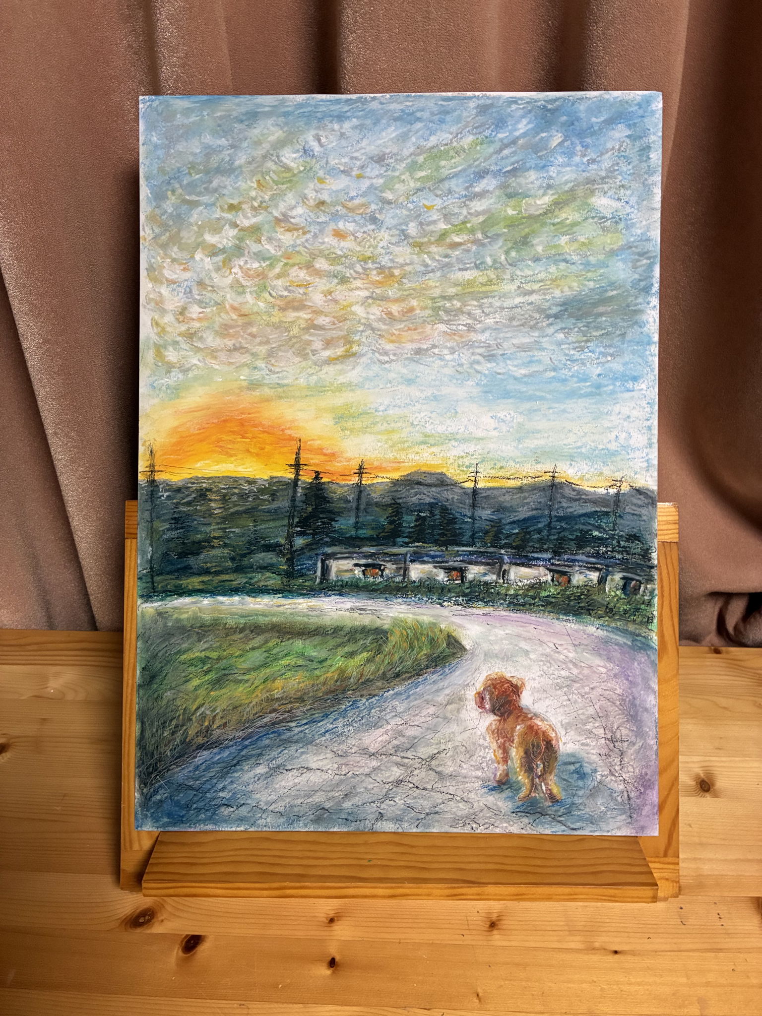 能登半島地震の後、多くの人が失い、前を向いて生きようとしている。仮設住宅の側を愛犬と歩く散歩道。過疎化が進む中でも変わらない自然の美しさがある。静かな時間の流れの中で秋の夕暮れに希望を見つけ、強く、優しく生きて生きたい。そんな気持ちをこの小さな愛犬の背中に託しました。