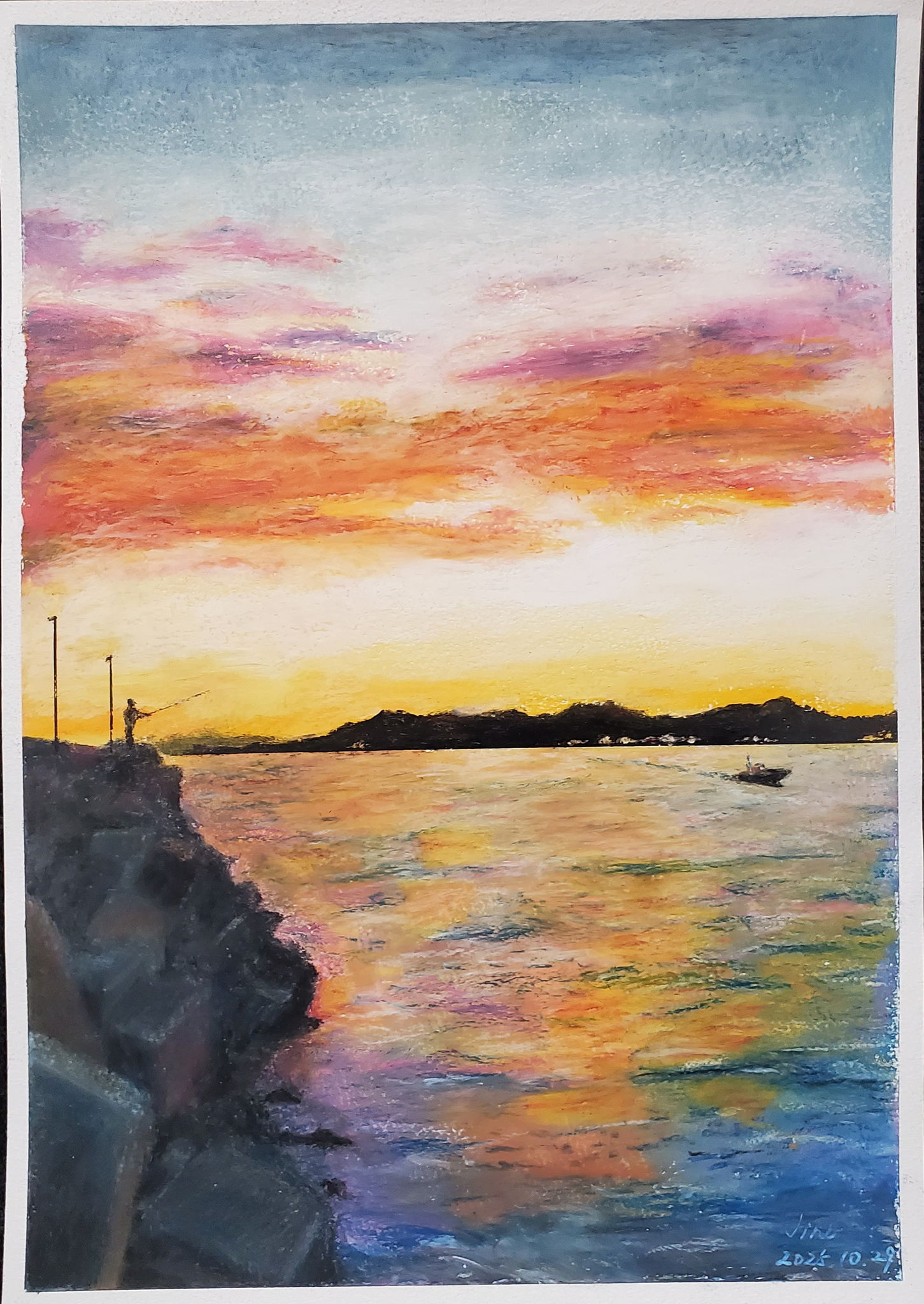 明るくなる光と朝焼けのオレンジ、それを反射する水面をメインとして、アクセントとして釣り人と通過する船を入れてみました。