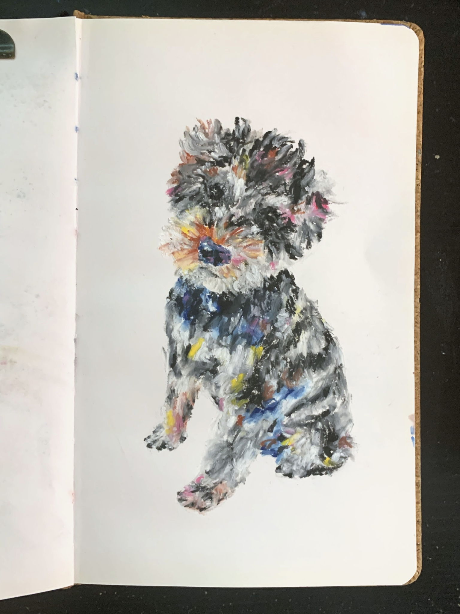 私も初めてまるに会った瞬間からその魅力にすっかり心を奪われしまい、初めて使うアートクレヨンでは真っ先に「まるを描きたい」と思いました。色とりどりの筆致に、まるの個性と温もり、そして妹との絆を込めました。
