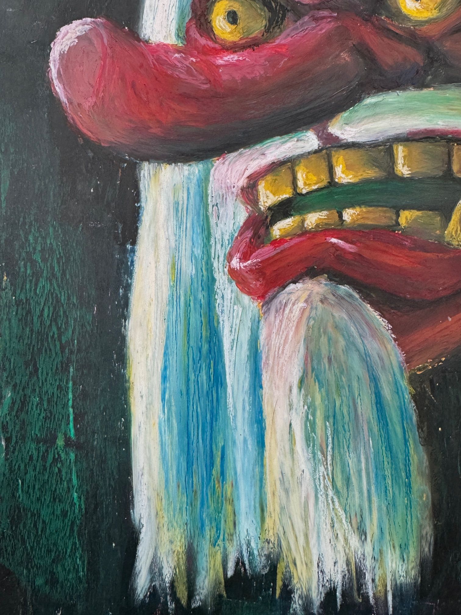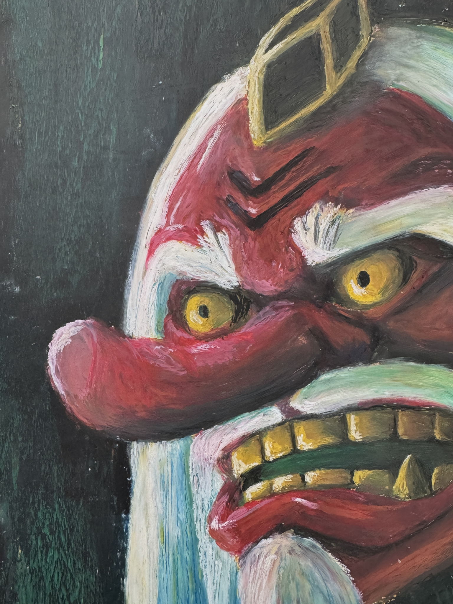 長い鼻に赤い顔。ぎらりと金色に光る目玉と歯。厳しさと威厳を感じる深く入ったシワや、研ぎ澄まされた神聖な力が宿っているような白い毛。