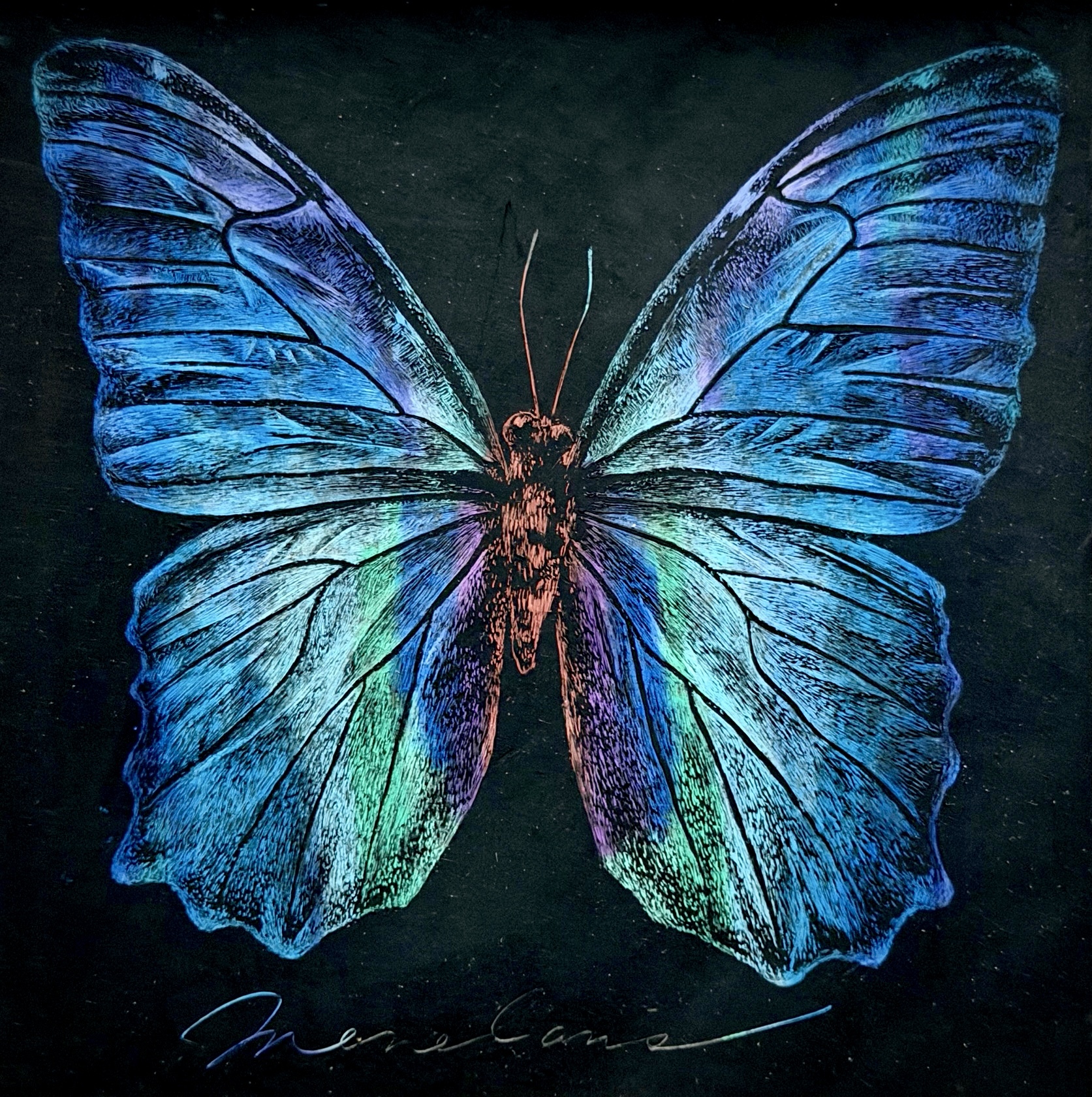 スクラッチという“引き算の技法”で、カラフルに塗った下地を黒で覆い、針で引っ掻くことで生まれる鮮やかな色彩を、蝶の姿で表現しました。