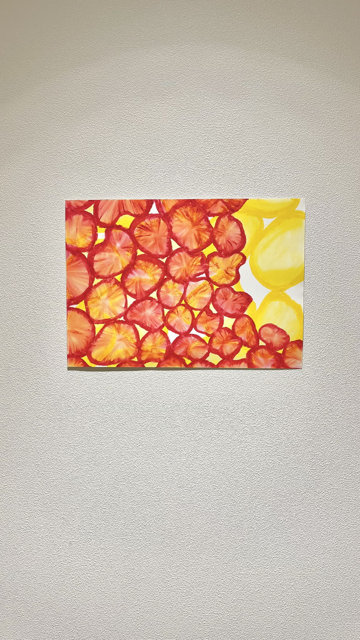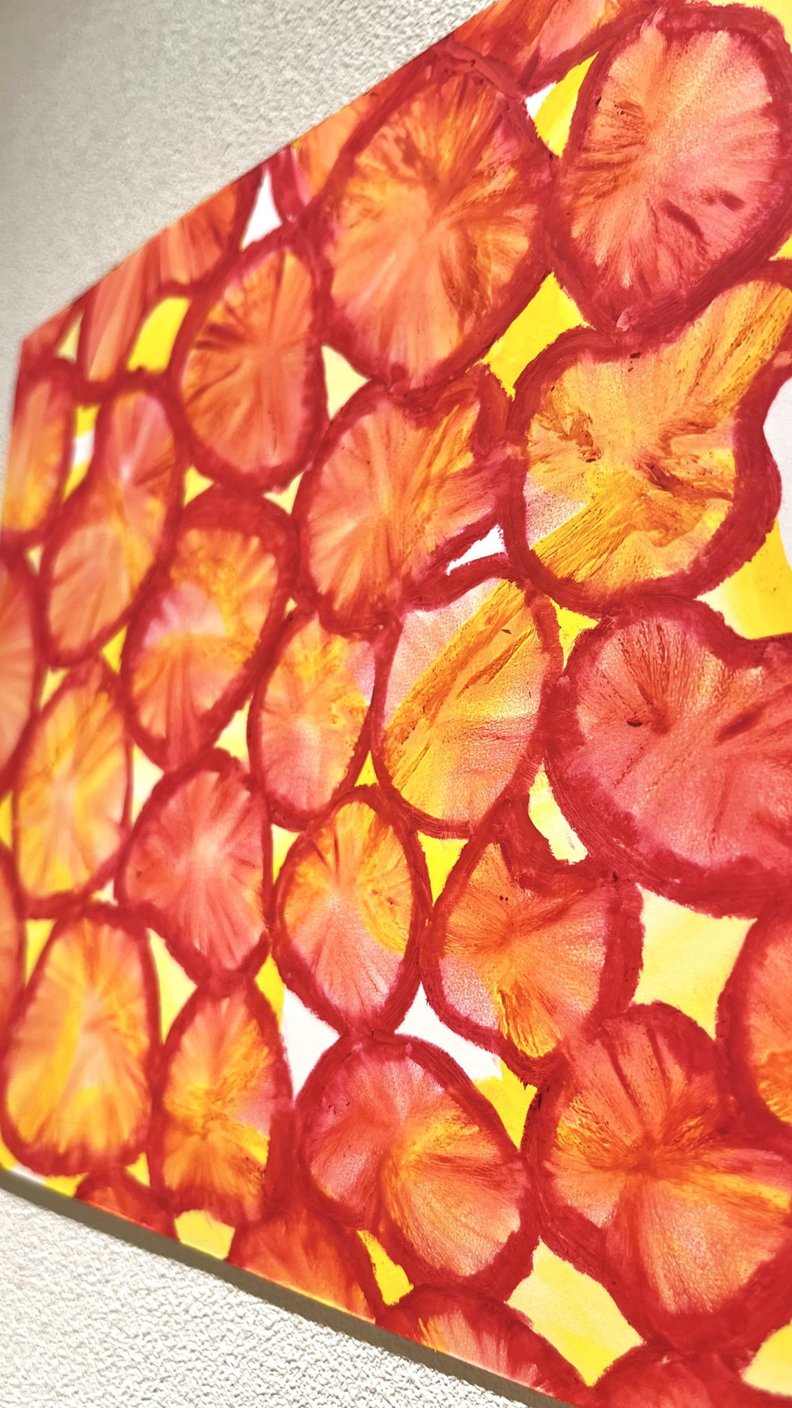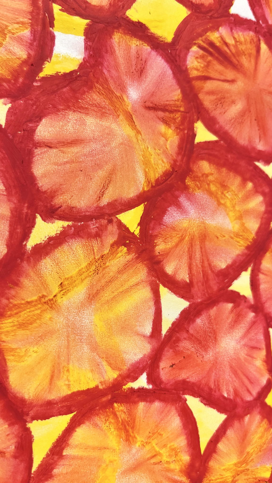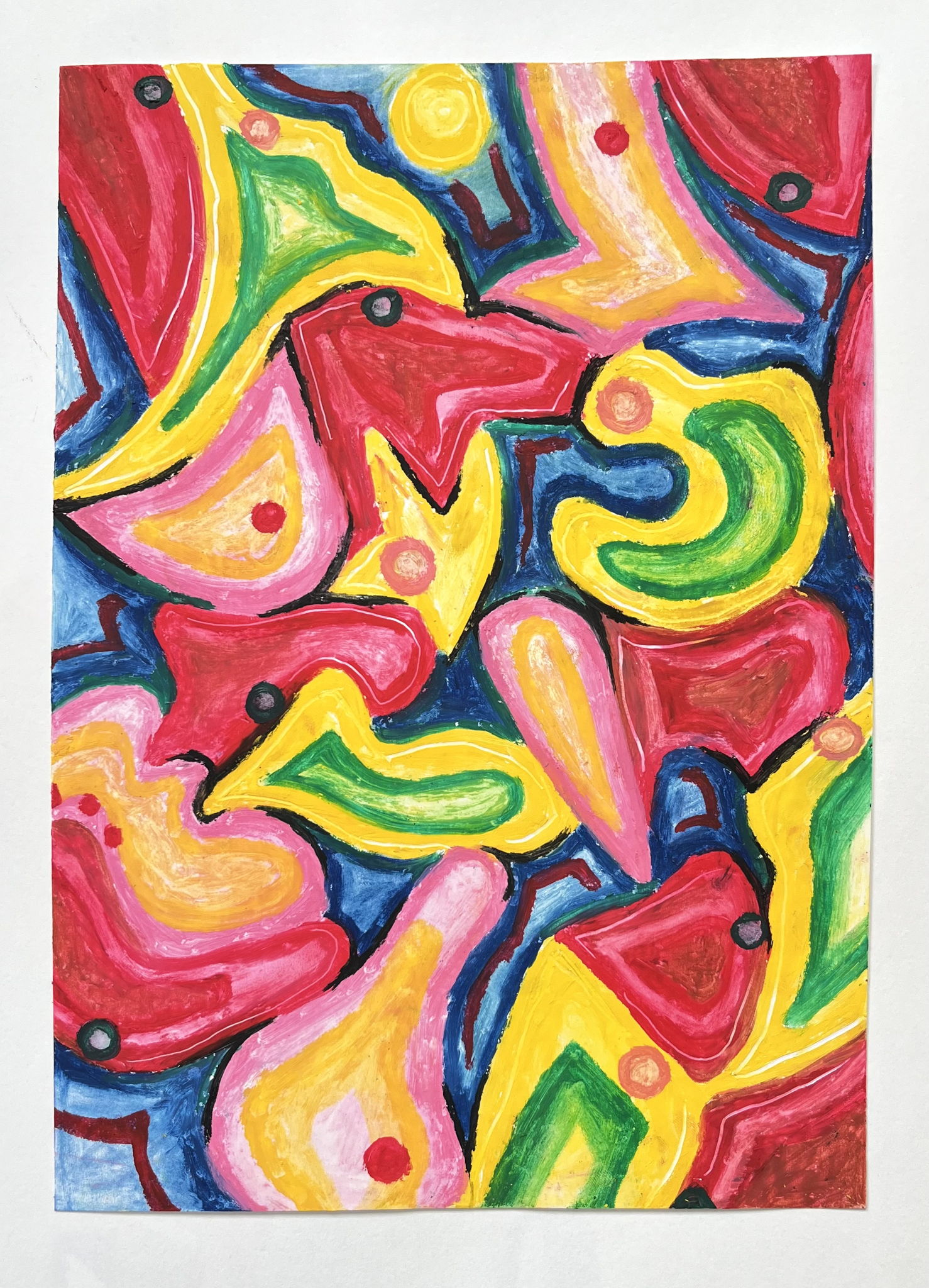 お腹の中から見た世界を、赤ちゃんの視点でイメージして描きました。外から差し込む光のやさしい明るさや、お母さんの体温のぬくもり、ふかふかと包み込むお肉のベッドのような感触を、クレヨンを指で擦りながら表現しています。