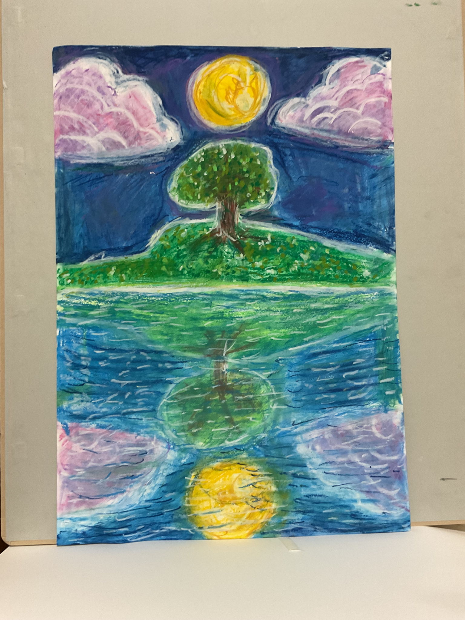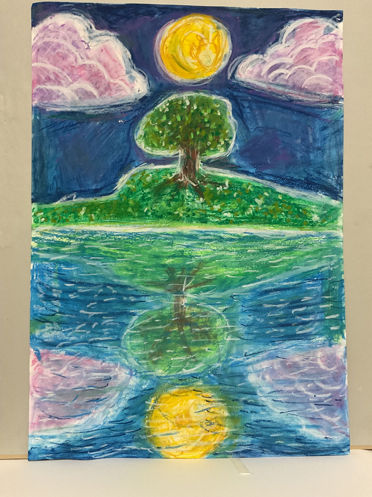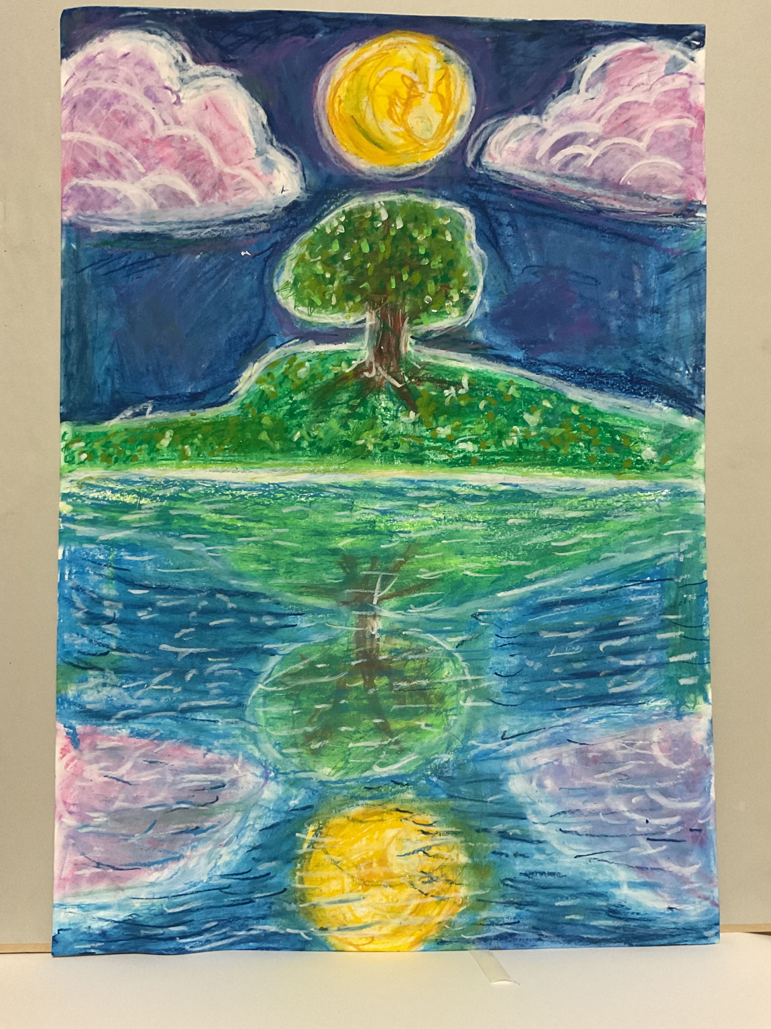水面に反射する風景。雲に挟まれた満月と大地に根を張る大木。月光を浴びて湖面に反射する。