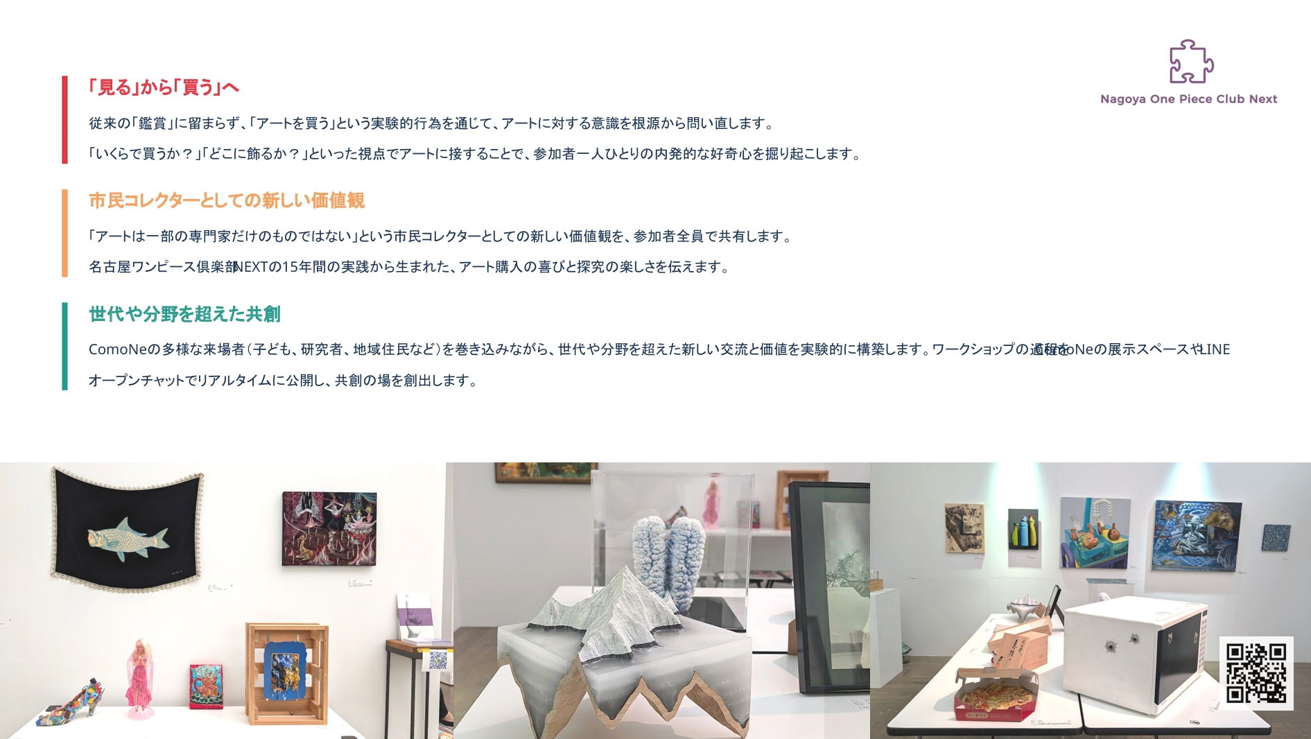 本プロジェクトは、現代アートマーケット拡大のため、楽しみながら作品を購入する市民コレクター「名古屋ワンピース倶楽部NEXT」が、「アートを見る」から「アートを買う」という行為で生まれる新しい価値を探究する実験的なワークショップです。