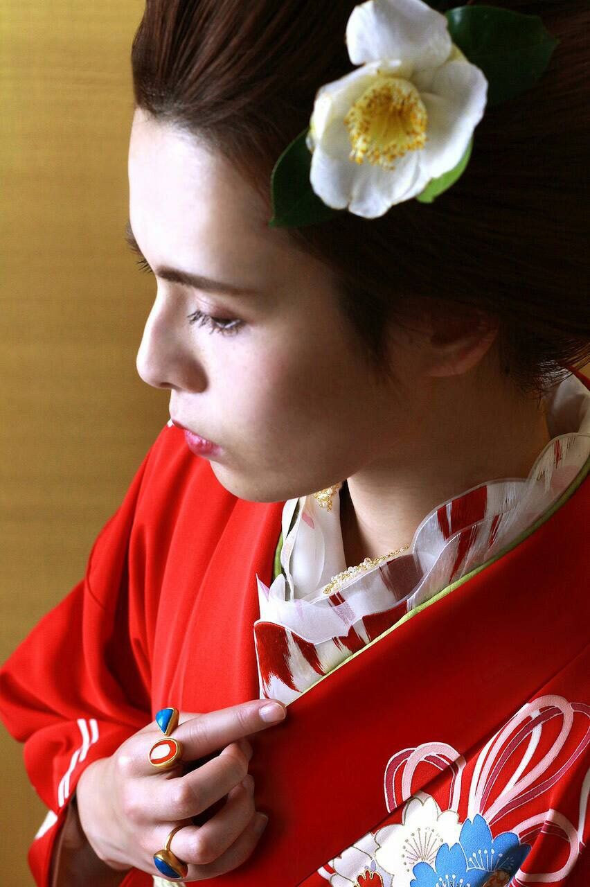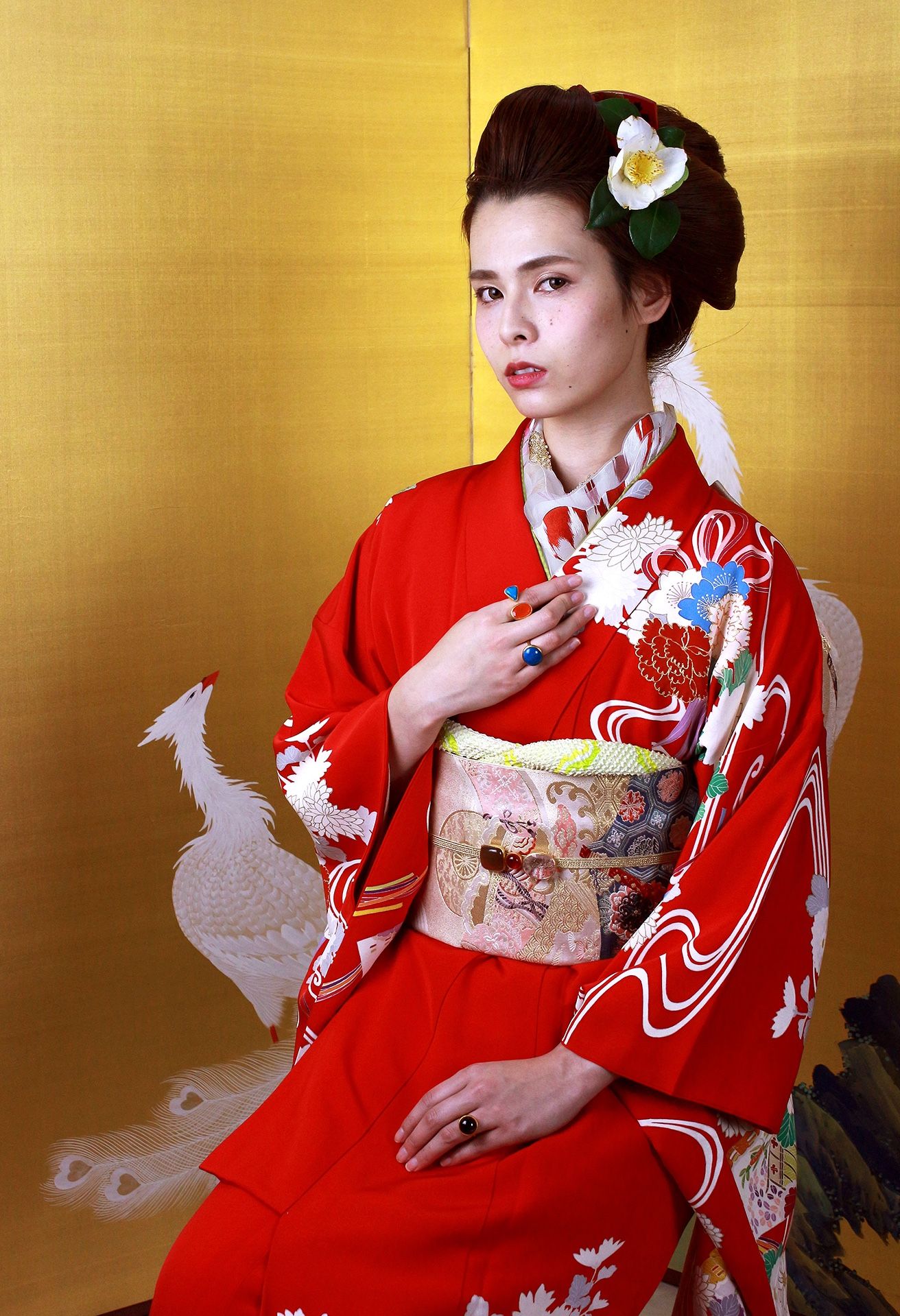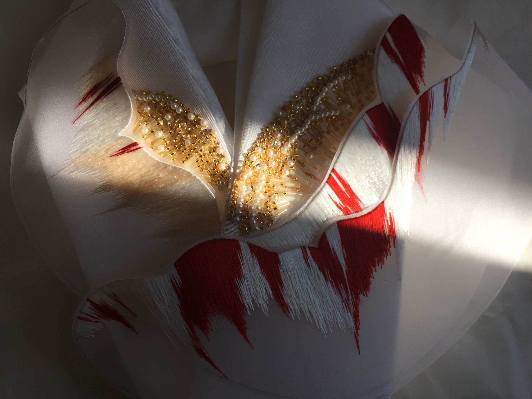 日本刺繍とビーズ刺繍を用いて、1月の誕生花「椿」を半衿にて制作。