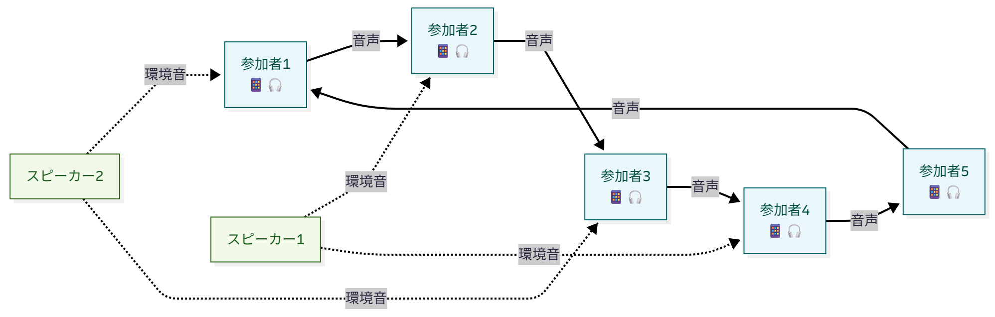 本プロジェクトは、複数人が同じ空間で「聴く」という行為を通して、他者との関係性を再構築する試みである。約10m四方の場に5〜6人が入り、各自がスマートフォンとイヤホンを装着する。自分の端末のマイクに入った音は別の参加者に届き、他者の音が自分に返ってくるが、その対応関係は常に入れ替わり続ける。聴くことと聴かれることが交錯するたびに、空間全体が一時的な共鳴体として立ち上がる。