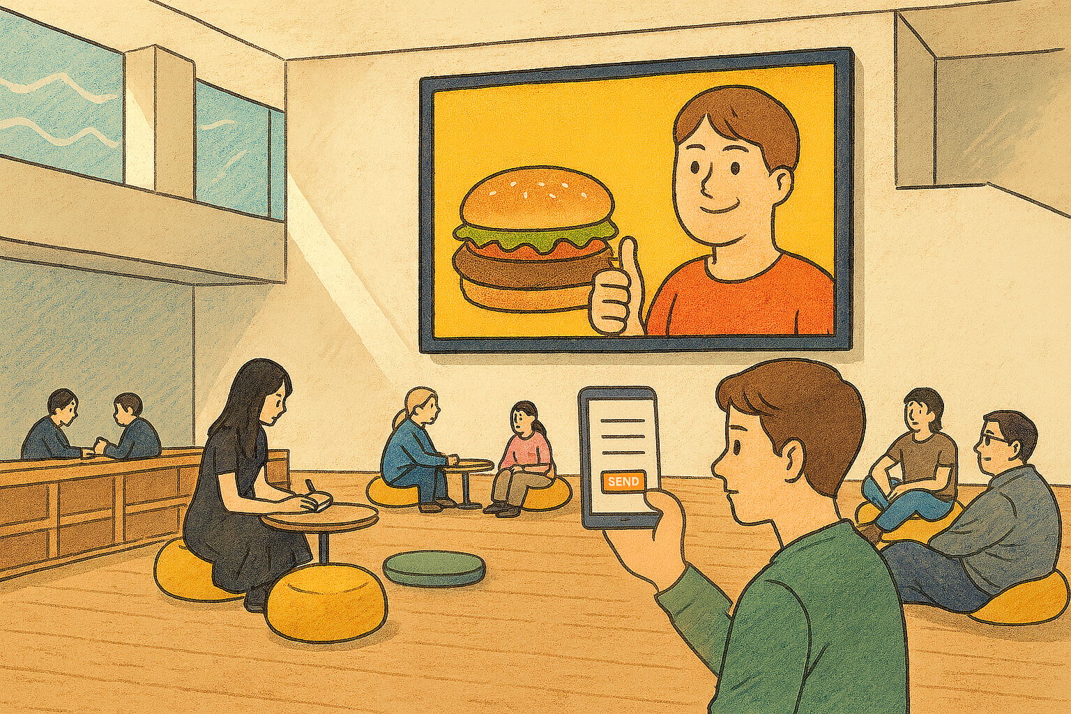 ここでの“コモンズ”とは、土地や資源を共有することではなく、音を介して一時的に生成される関係そのものを指す。個々の声や足音は、他者の聴覚に重なりながら匿名化され、やがて誰のものでもない音の領域を形成する。この構造は、スマートフォンというメディアを介して私たちが常時接続されながらも孤立している社会の姿を映し出す。デバイスは通信装置としてではなく、“孤立と接続の同時性”を可視化する社会的メタファーとして用いられる。