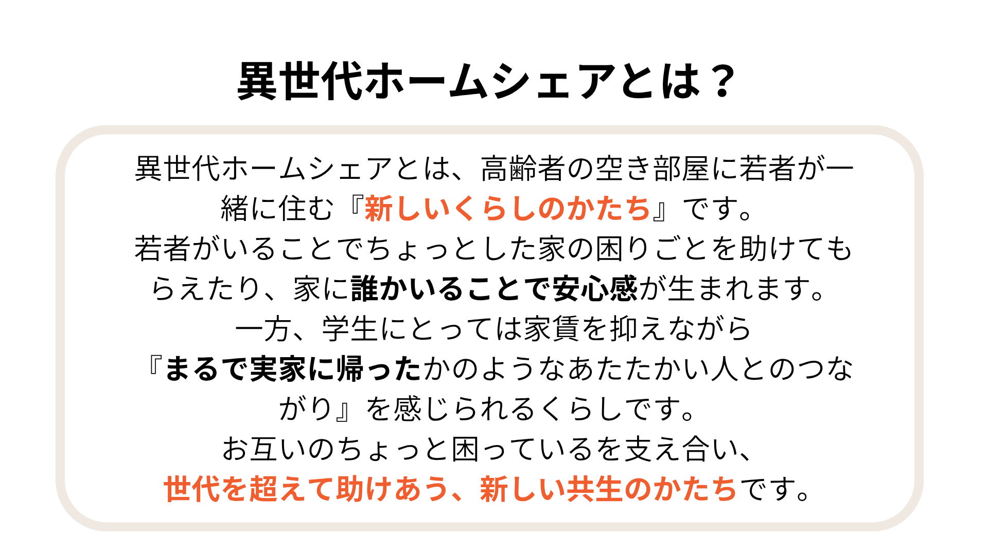 異世代ホームシェアとは、高齢者の空き部屋に若者が一緒に住む『新しいくらしのかたち』です。