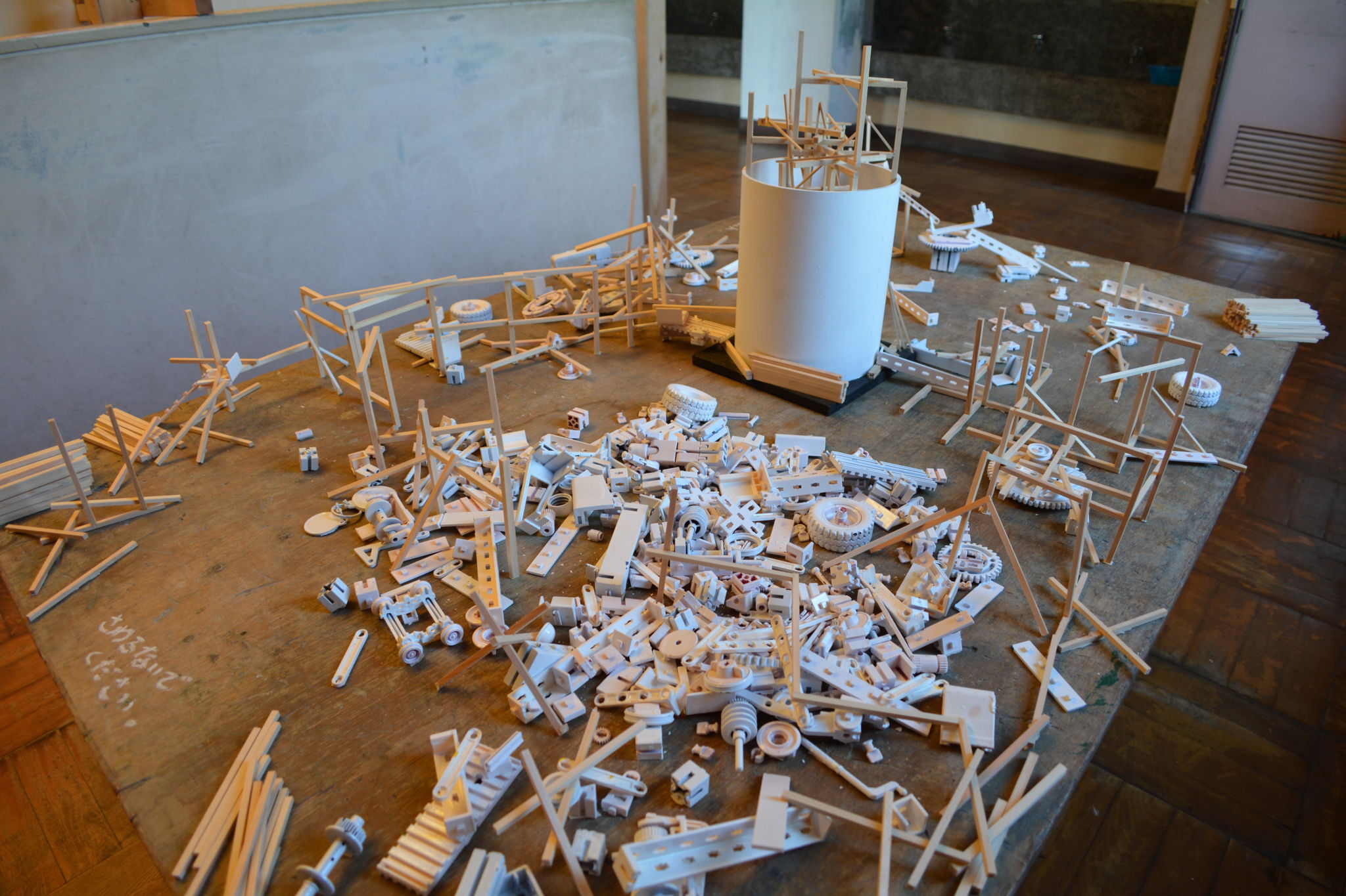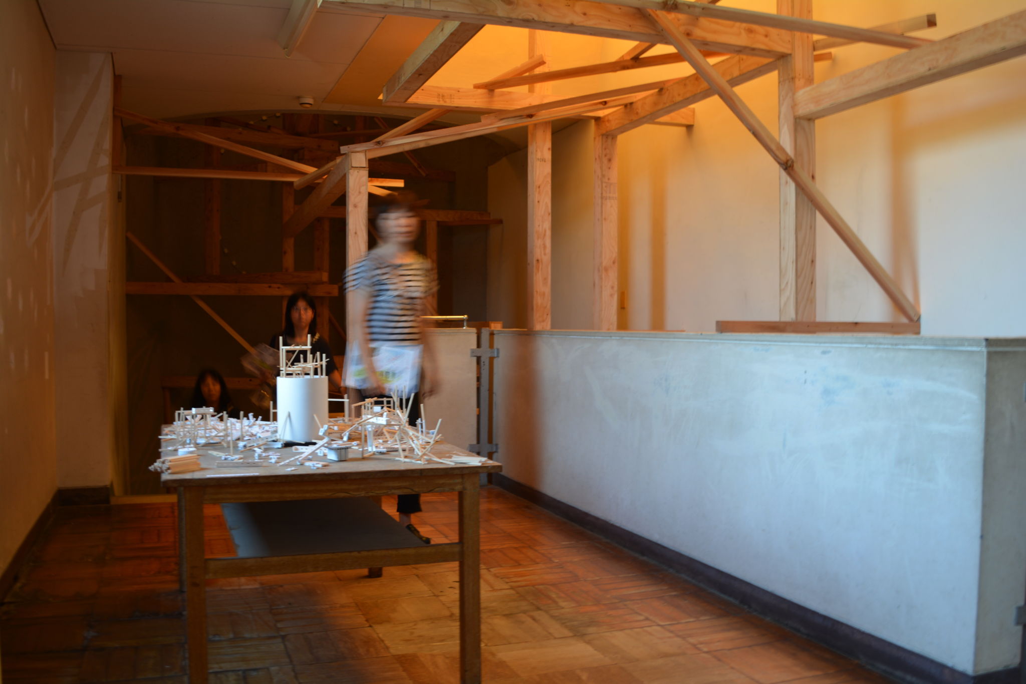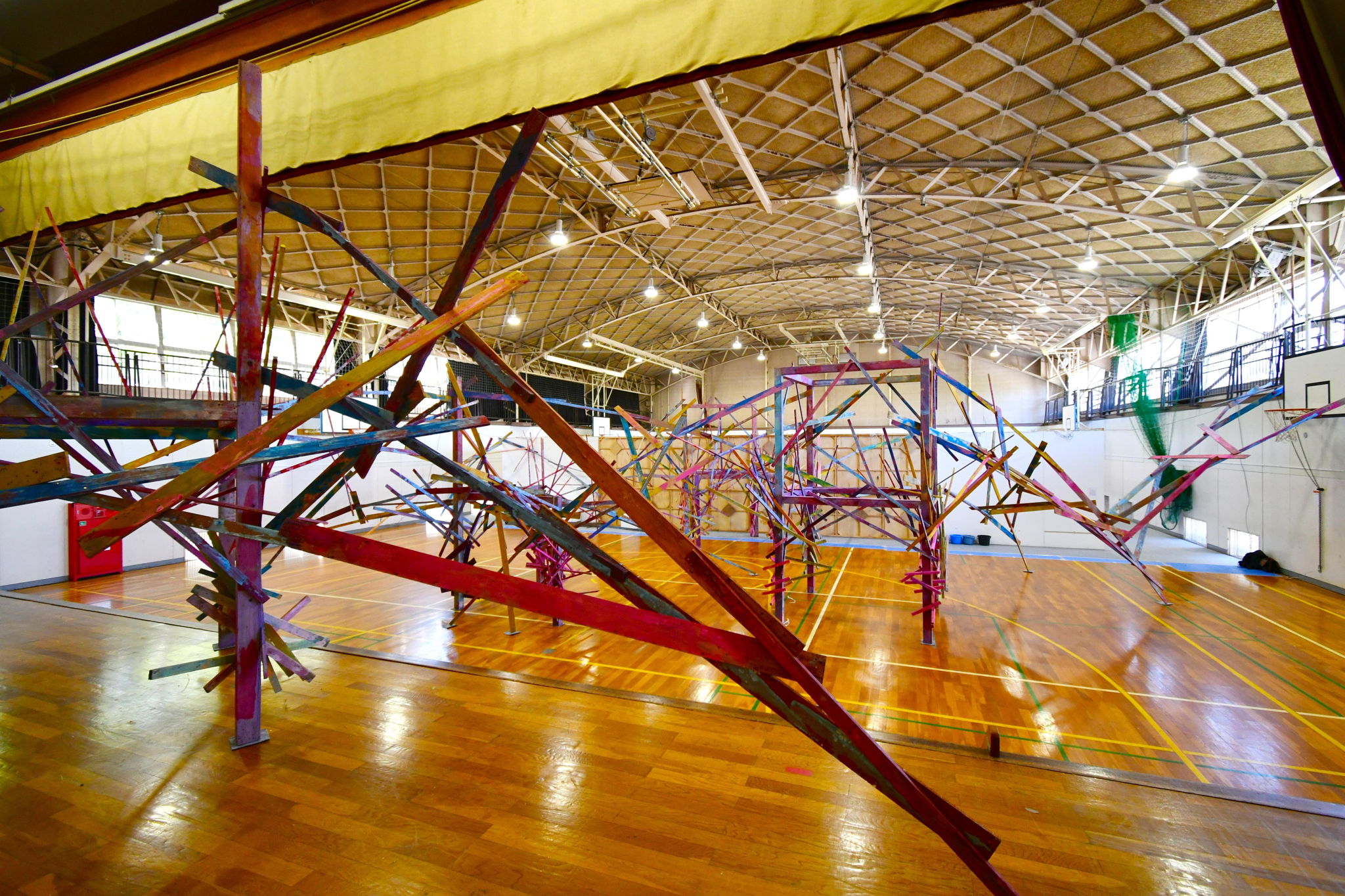色の塗られた木材を絵具のように用い、鑑賞者が空間を歩くことで像が立ち上がる構造です。