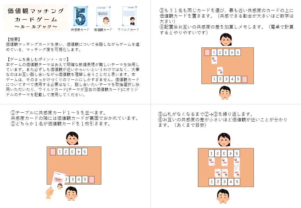 必要なもの:価値観マッチングカードゲーム(共感度カード、価値観カード)、プレイヤー(2名)、正直に回答する気持ち