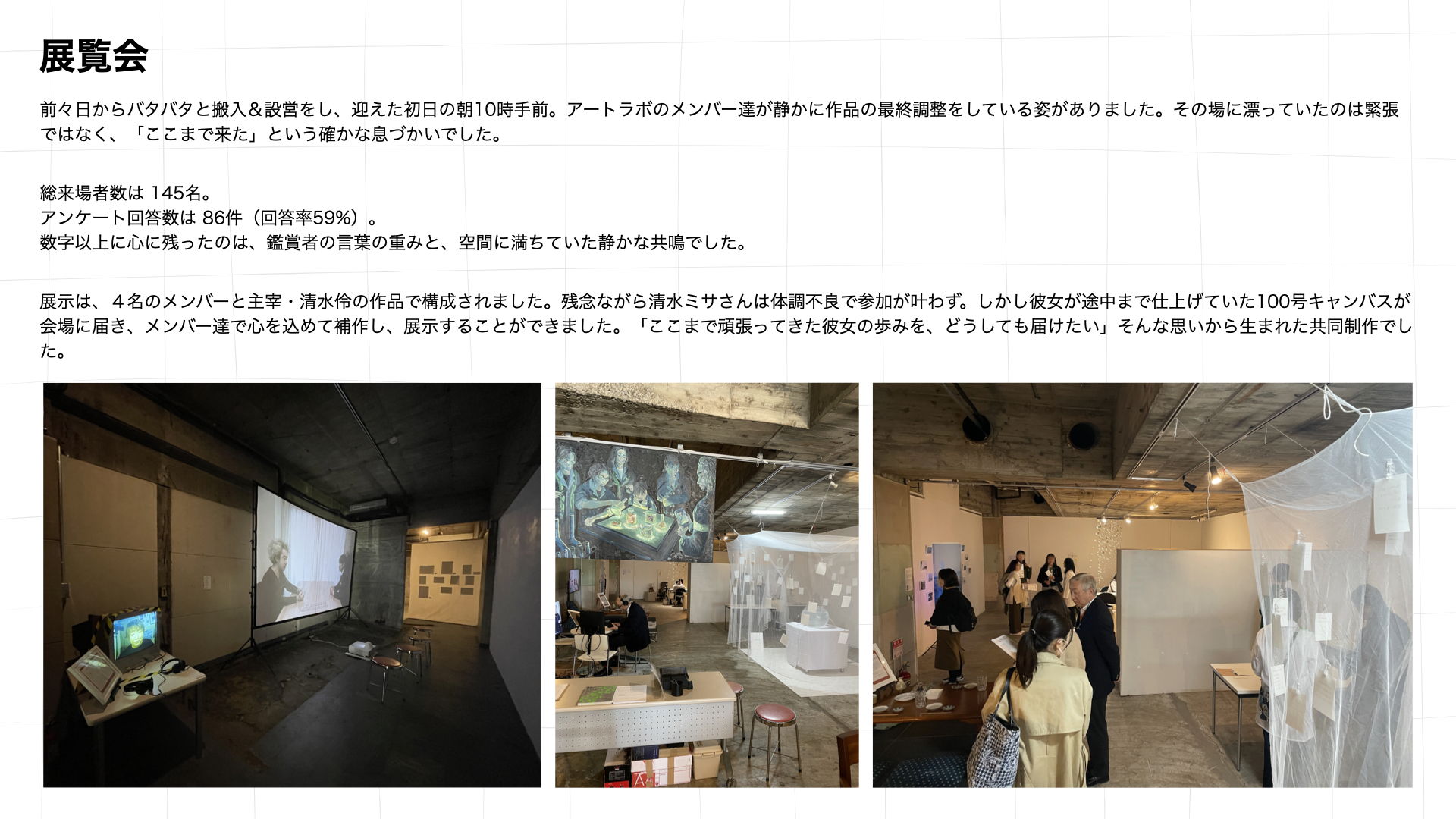 本プロジェクトでは、主催者によるアートヒストリーや喪失をめぐる視点の共有を起点に、参加者が喪失をアートで表現するための企画を考え、相互にフィードバックを行う。場全体には、「癒さない」「助言しない」「正解を出さない」といった共通ルールがあらかじめ共有されており、対話は雑談や感情の発散に流れないよう設計されている。自由度の高い発言と、最低限の制約が同時に存在する構造が、この場の特徴である。