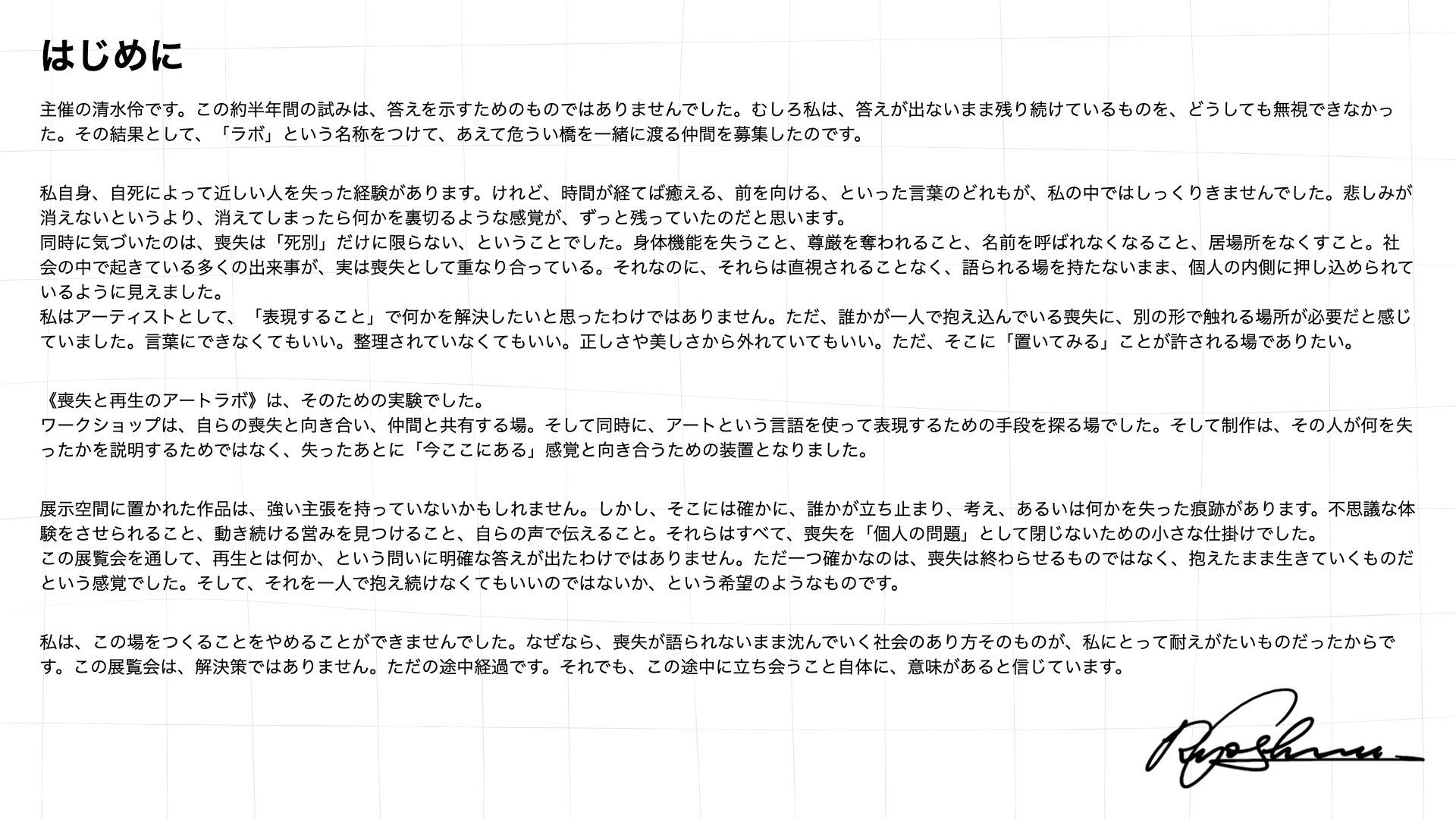 《喪失と再生のアートラボ》は、喪失という個人的で語りにくい体験を、完成された作品として提示するのではなく、人と人が一時的に集まり、語り・沈黙・反応が交差する場そのものを制作するアートプロジェクトである。