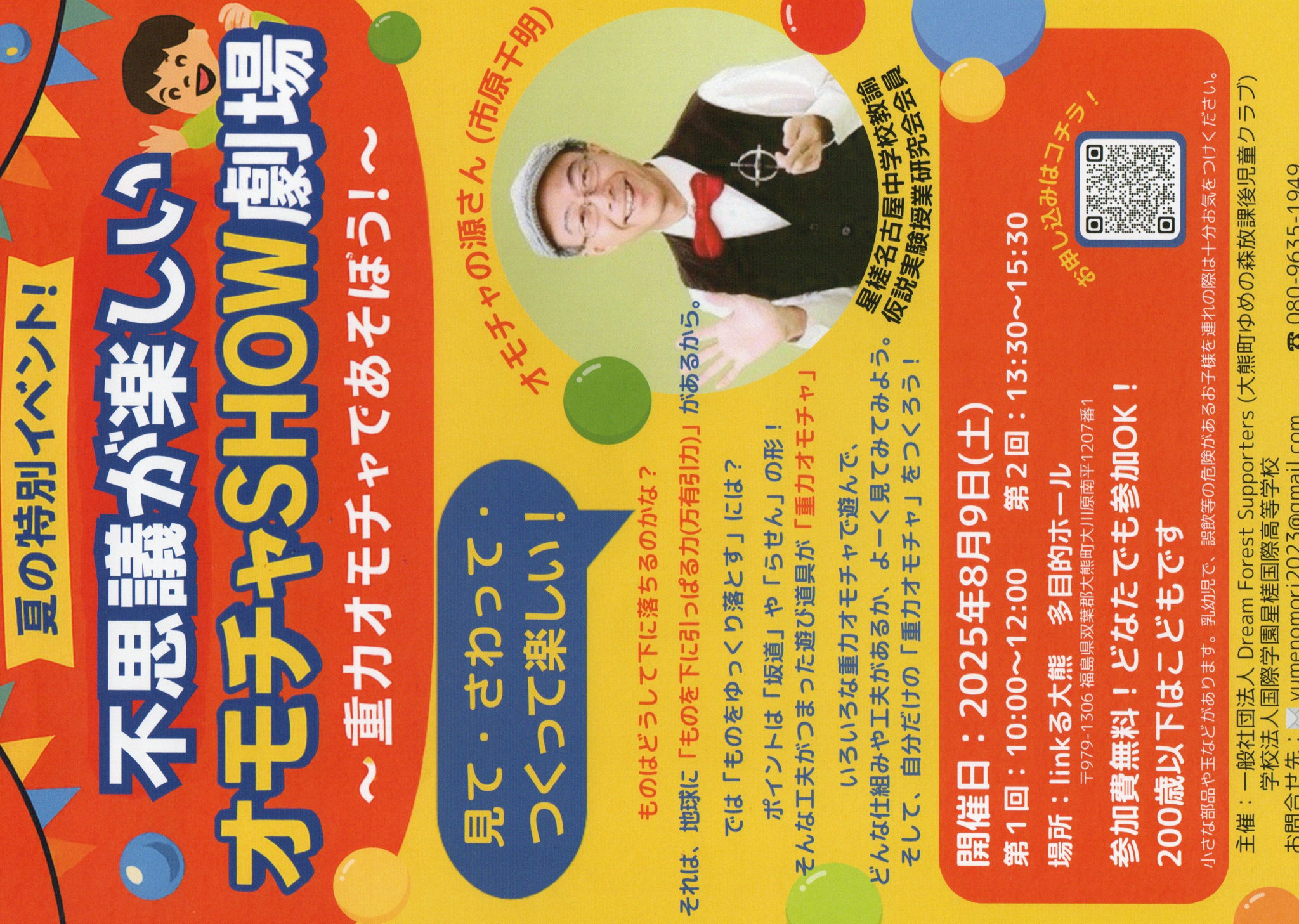 大変好評をいただいたので、その後もあちこちで実施させていただいております。また内容を変えたものも考案しました。添付写真03は「重力オモチャであそぼう」という内容です。このパンフレットは東北大震災の原子力発電所の被害を受けたエリア近くの「大熊町」に2025年の8月に遠征して実施した時の物です。