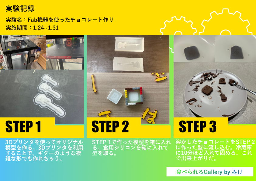 デジタルFab機器を利用することで、自由にチョコレートの形をデザインできる。ComoNeの施設を利用することで、一般利用者にも私のチョコレート作りを発信できる。いわば、周りを巻き込んだ盛大な実験である。