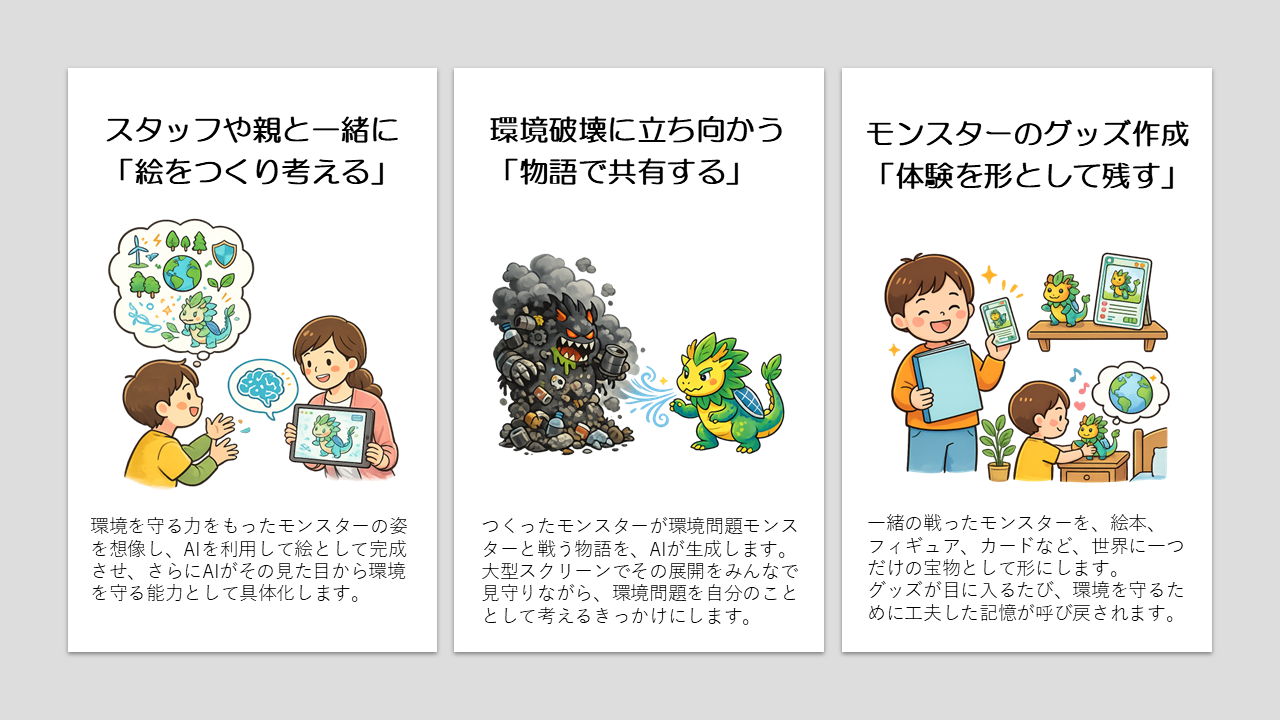 本企画では、子どもたちが自分で生み出し、共に戦ったモンスターを、絵本・フィギュア・アクセサリー・テーマ曲といった「形」に残します。大事に持ち続けるほど、環境問題への問いが生活の中で繰り返し立ち上がる――そのような“思い出しツール”としての学びを設計します。
