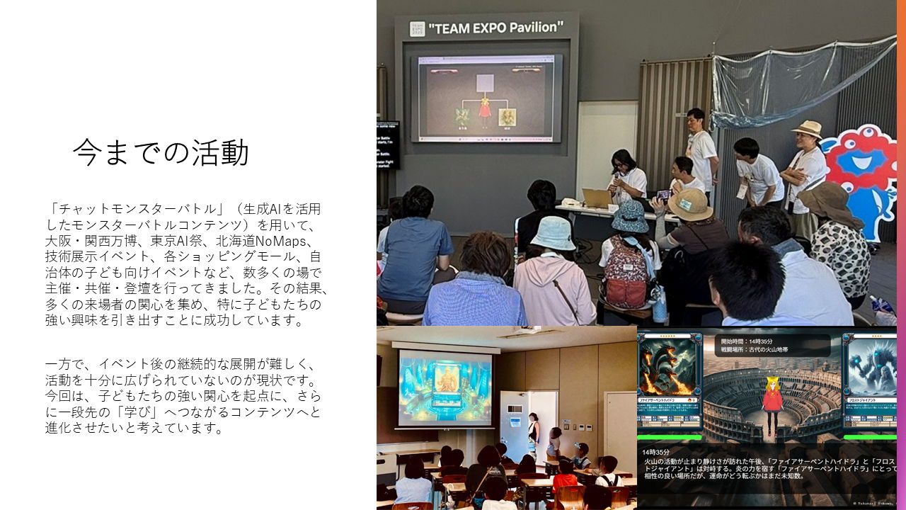 本プロジェクトは、生成AIを「答えを出す道具」ではなく、子どもたちの発想を引き出し、具体化し、形にしていく体験型イベントです。