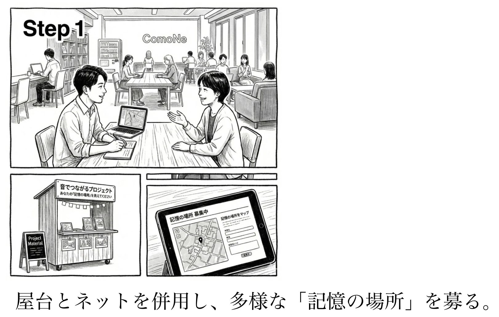 1. 募集・対話: インターネット(SNS・Web)とComoNe内の屋台展示(Project Material)の両輪で、「記憶の場所」とそれにまつわるエピソードを持つ人を広く募ります。