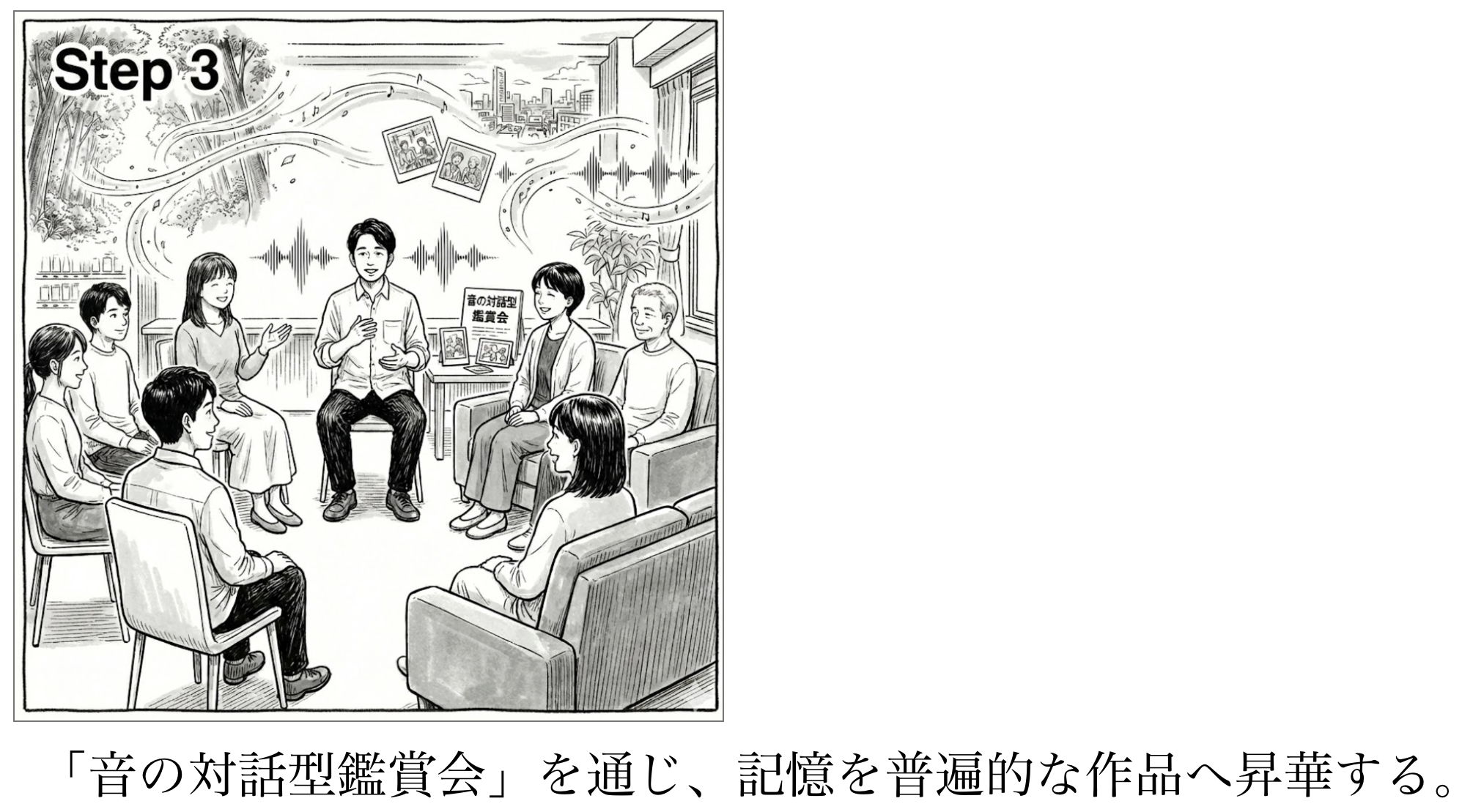 3. 体験・深化:アーカイブの公開に加え、「音の対話型鑑賞会」を開催。音を聴きながら参加者同士で記憶や感覚を共有し、個人の音を「みんなの物語」へと広げる場を作ります。