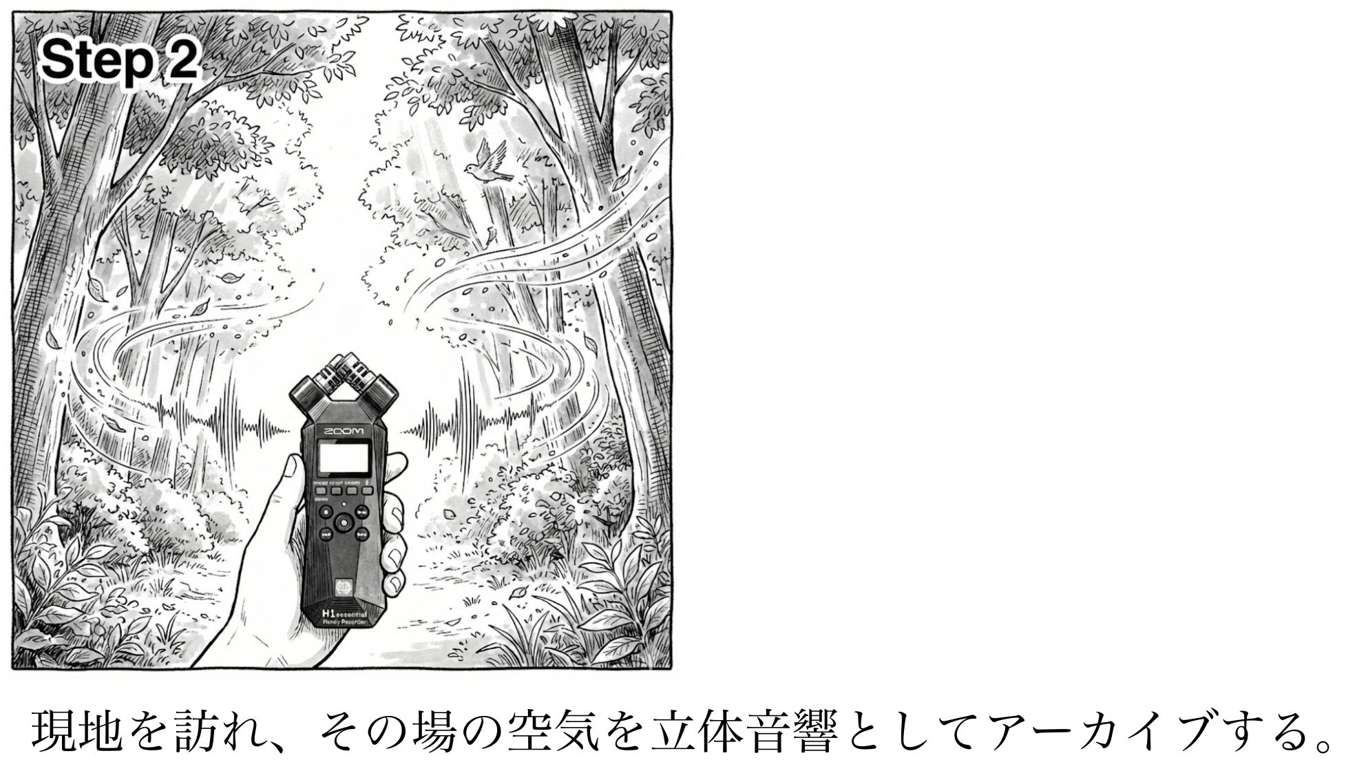 2. 採集・アーカイブ:寄せられた情報をもとに現地へ赴き、立体音響(3Dオーディオ)でその場の空気を記録。音と記憶を紐付けたデジタルアーカイブを構築します。